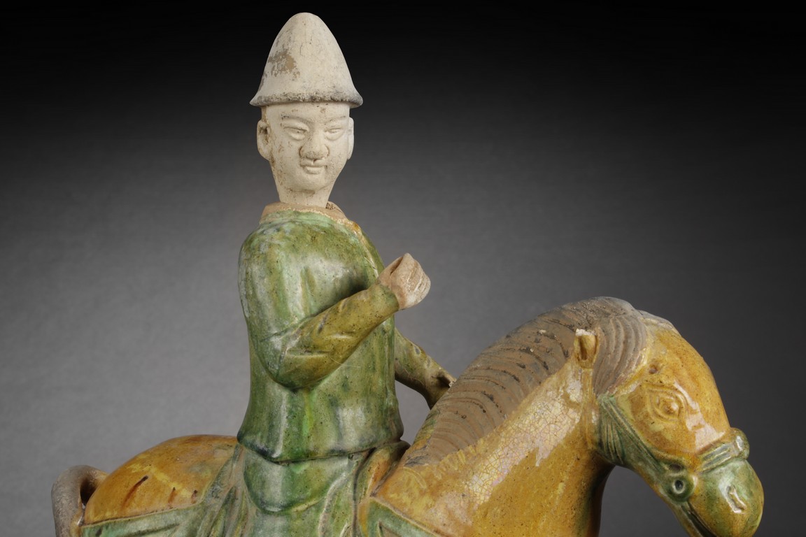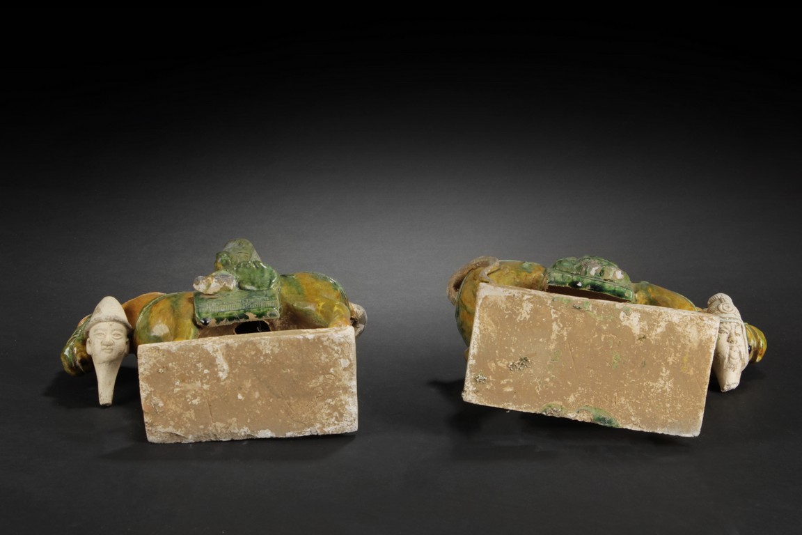 A PAIR OF SANCAI CERAMIC HORSE RIDER FIGURES 十八世紀仿宋三彩人物馬 (頭可以脫下)