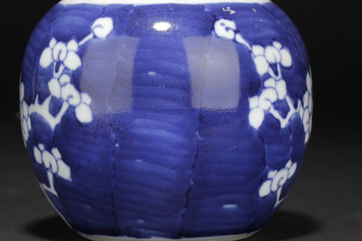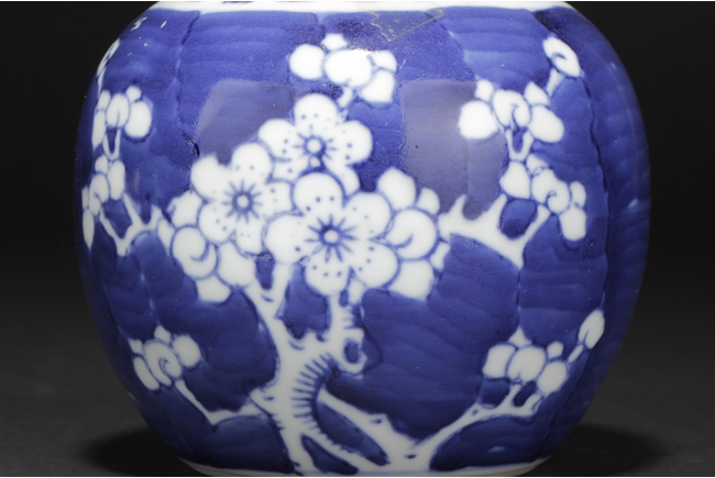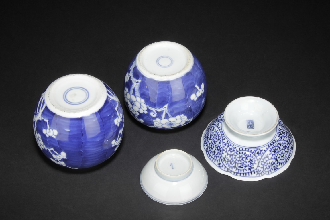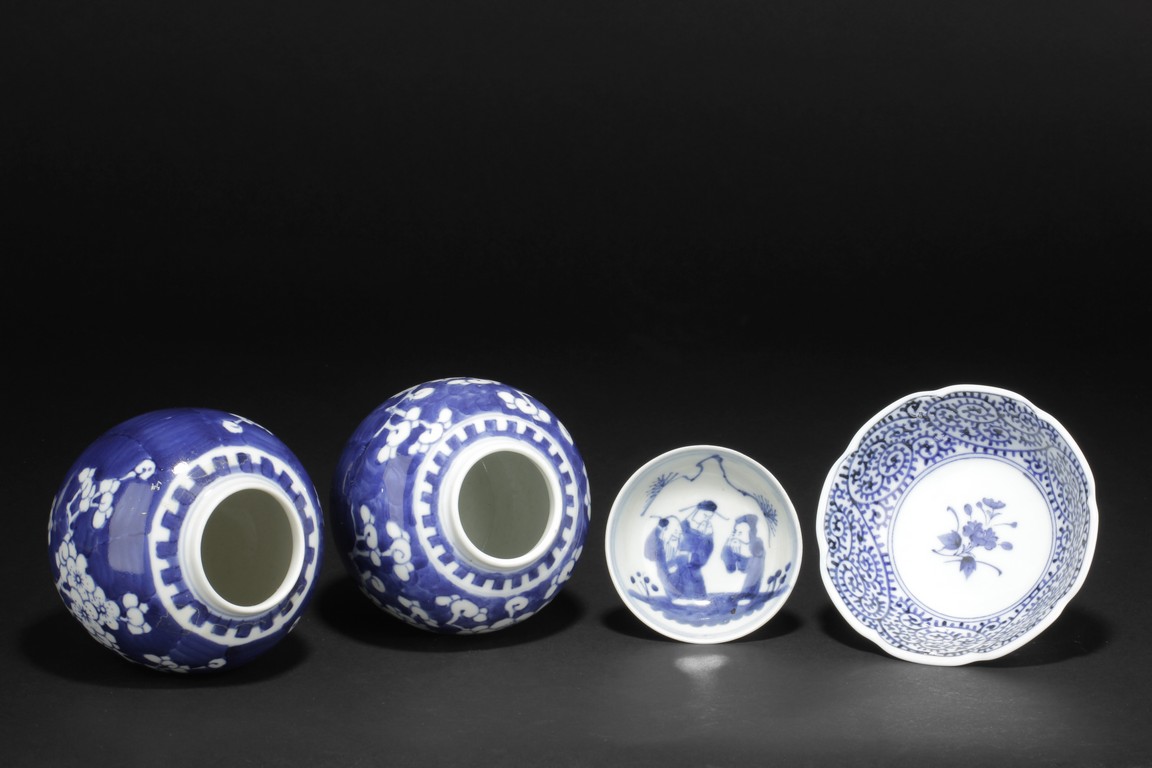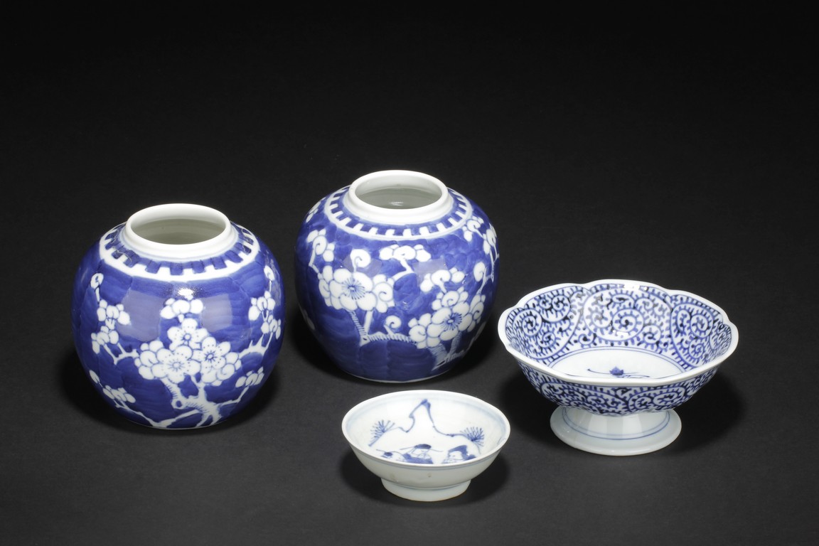 "The group of four blue and white porcelain includes two globular jars with flowers on the sides