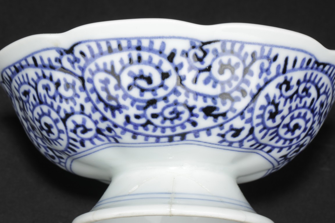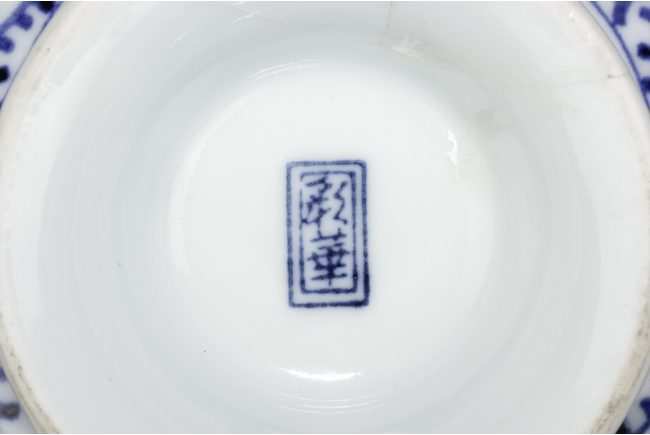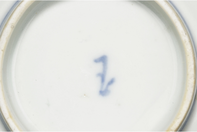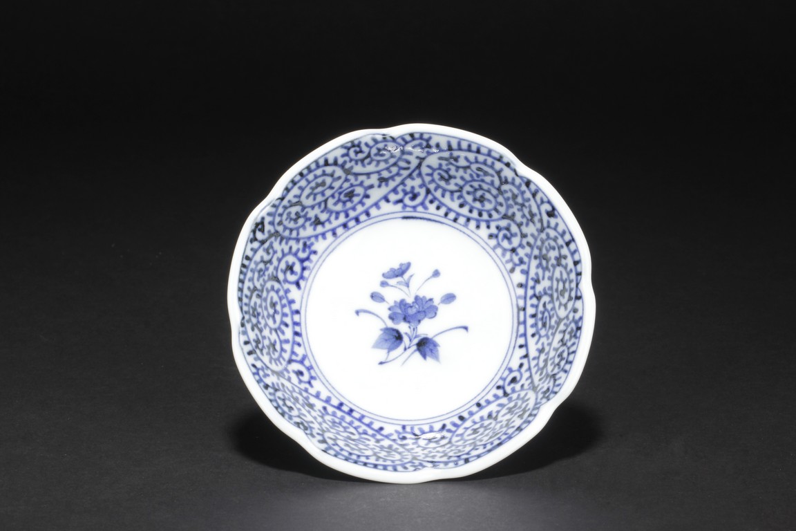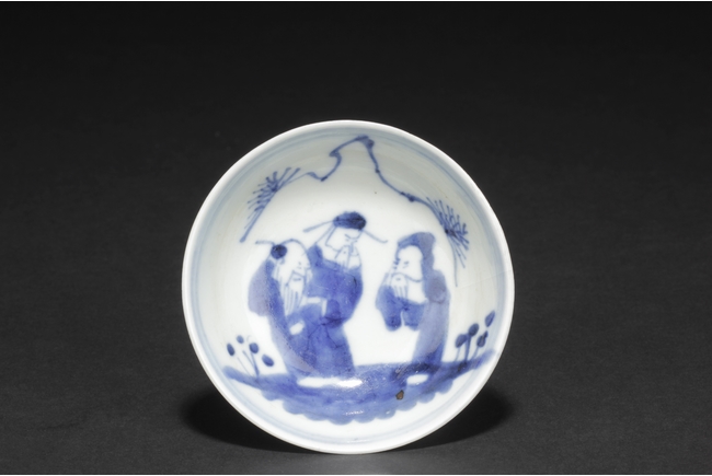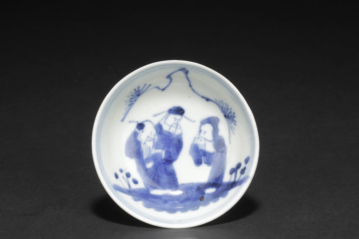 a plate with round and tall foot ring and a small bowl depicting three elders.