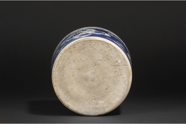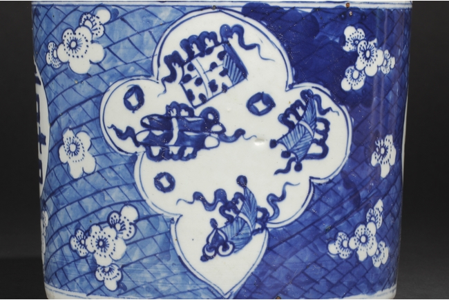The blue and white brush finely depicts a double happiness in Chinese characters on the body of the pot along with flower blossom and kites flying within a large motif of a flower petal.