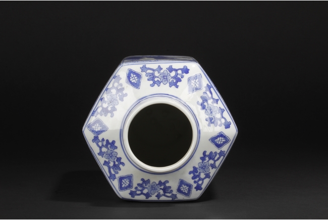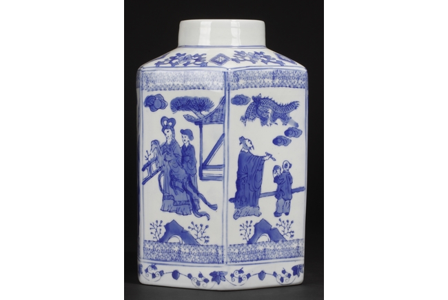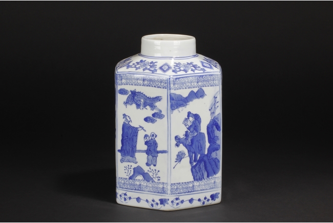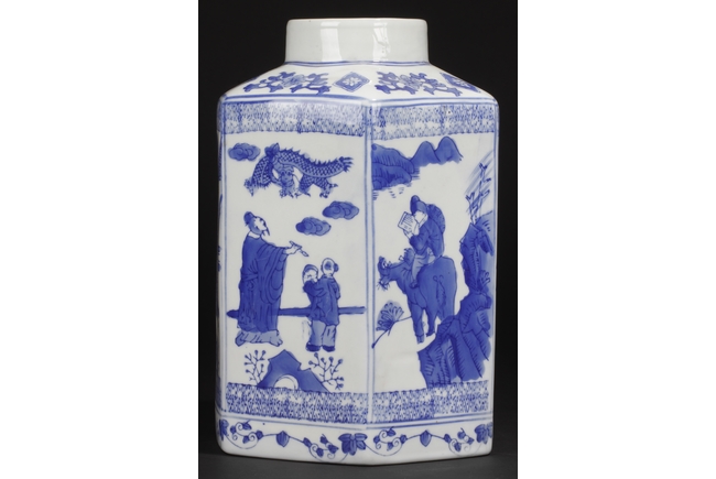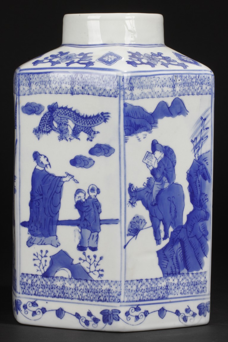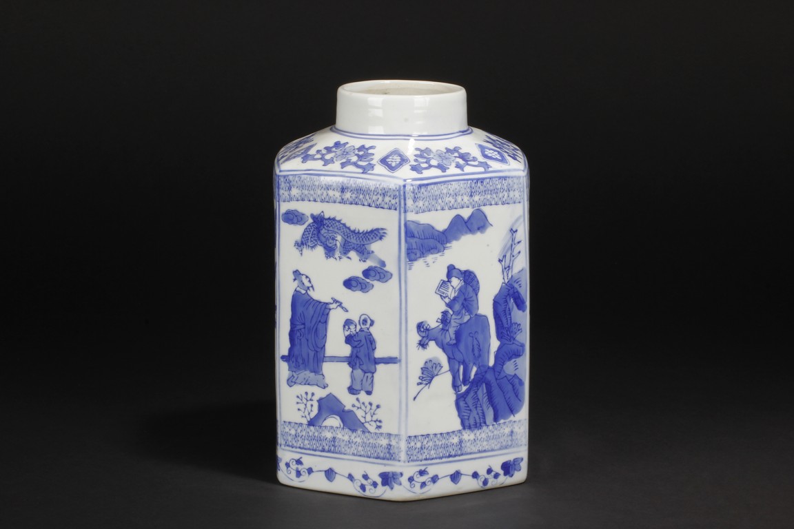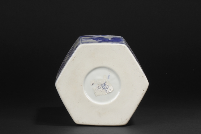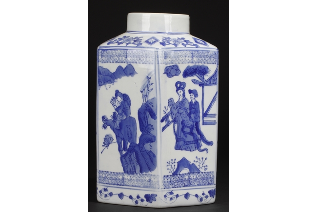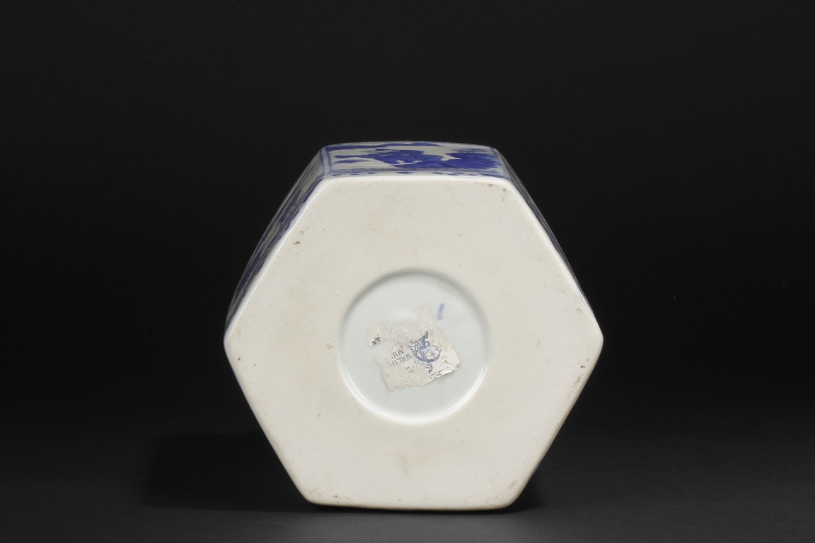 A BLUE AND WHITE HEXAGONAL JAR 青花六角山水人物罐