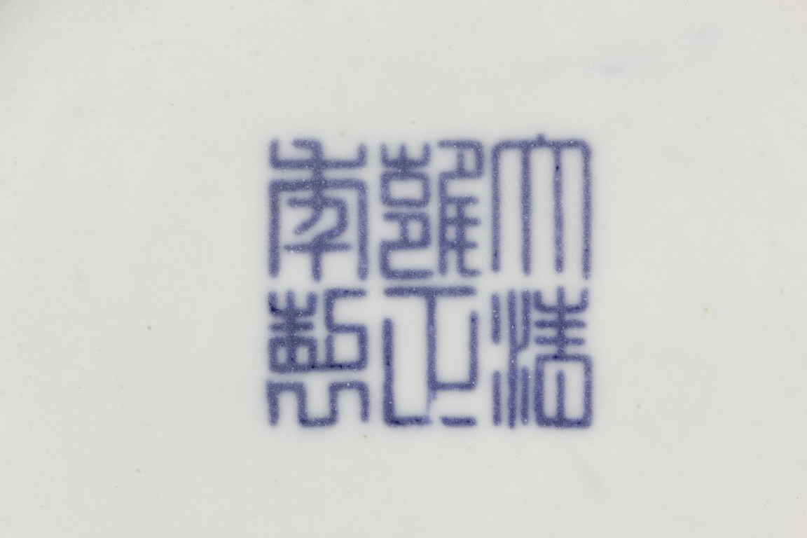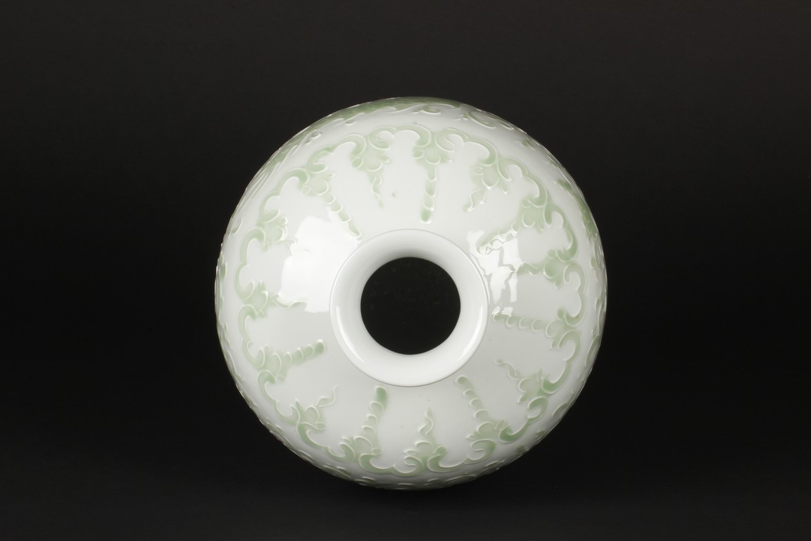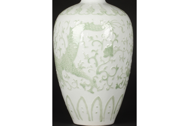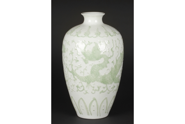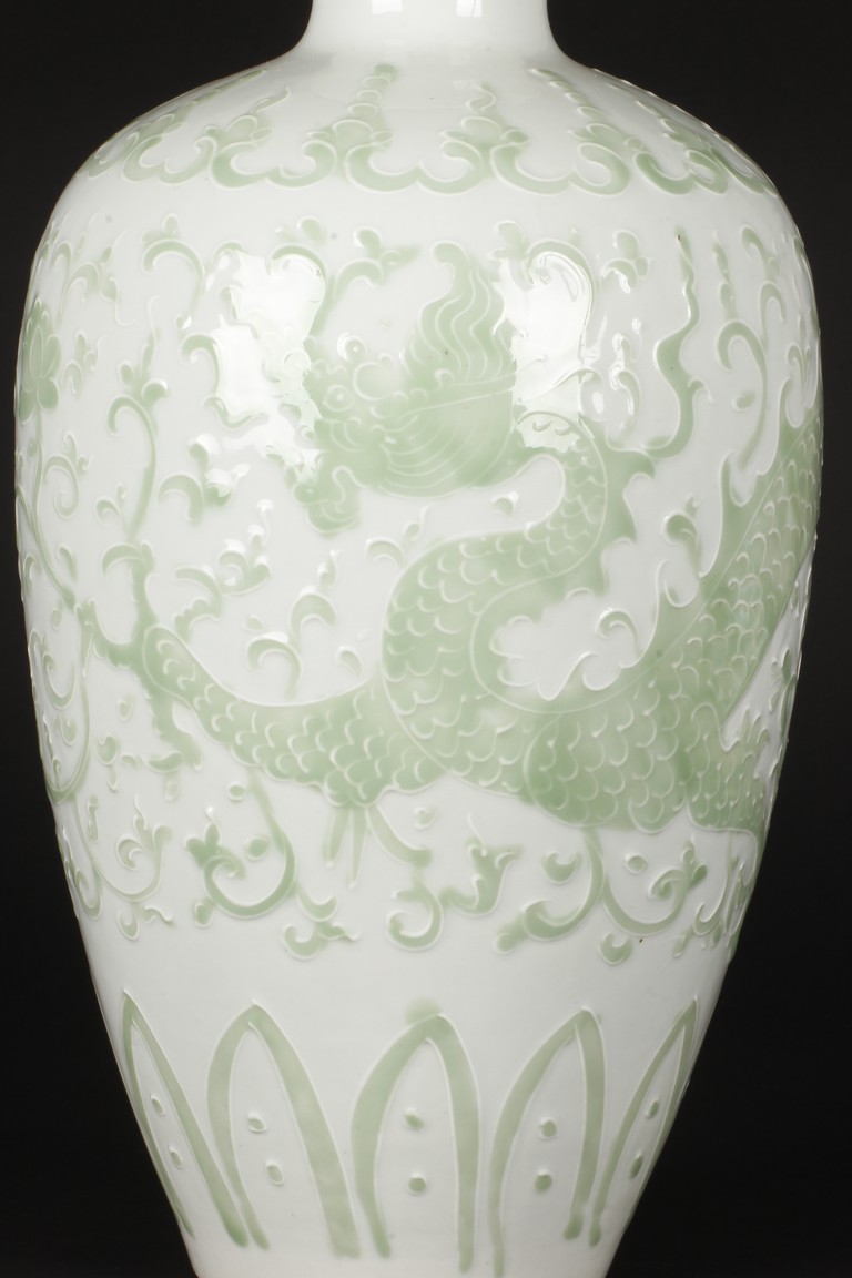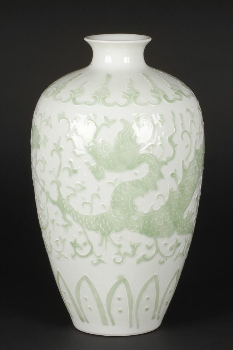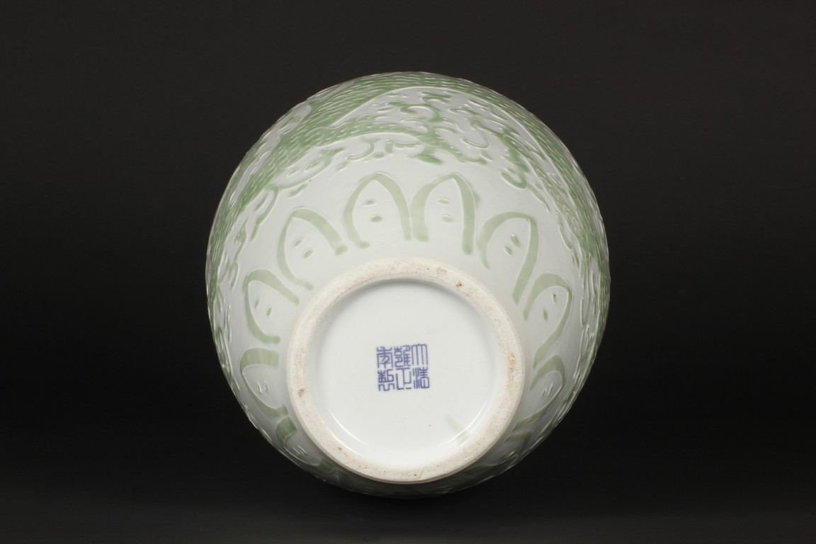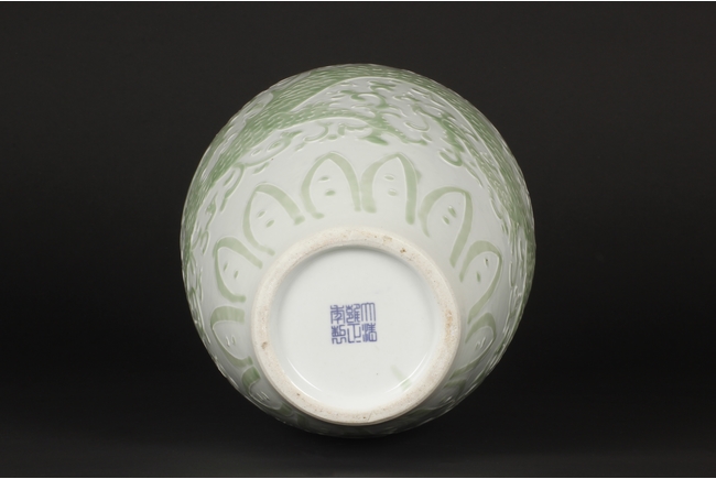 with underglazed green over white ground depicts a flying dragon amidst cloud ruyi flowers and vines in the oval shape.Yongzheng" mark on the bottom.