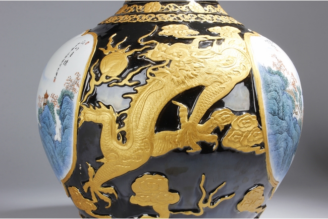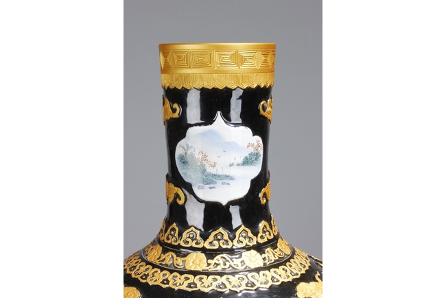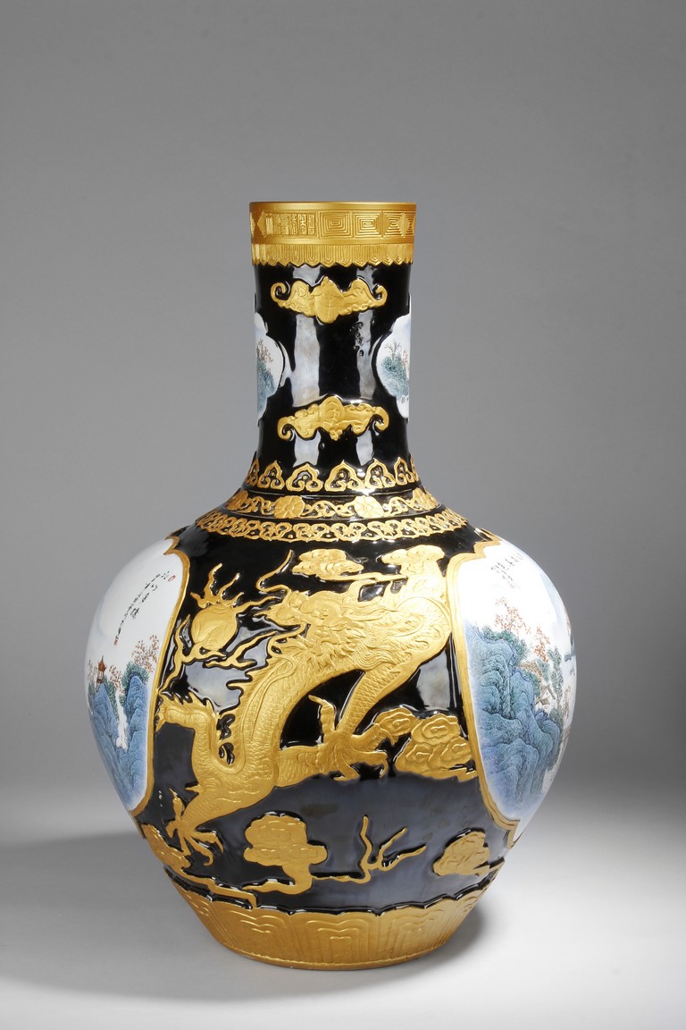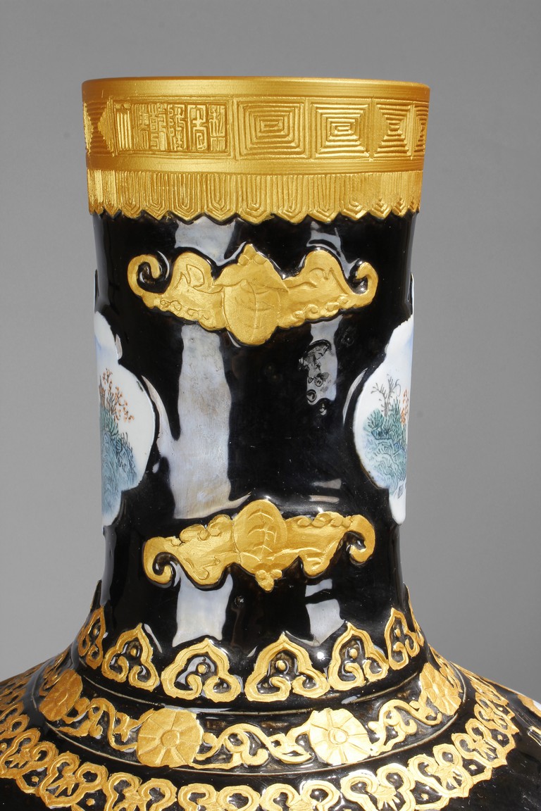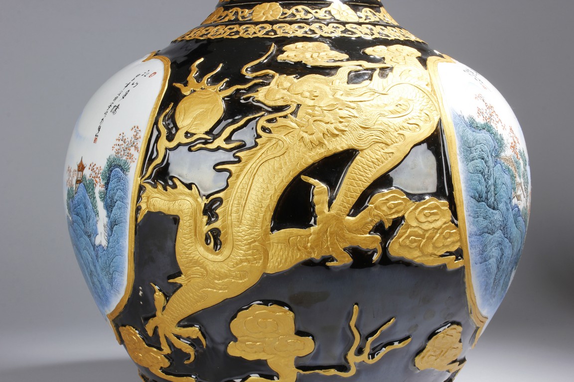 A LARGE PORCELAIN VASE 黑底描金雲龍紋江南山水大瓶