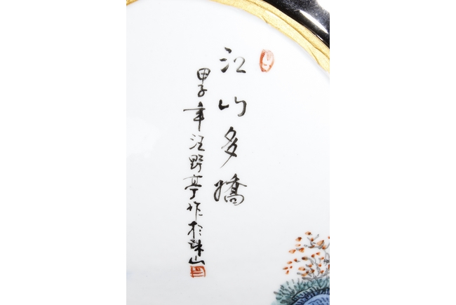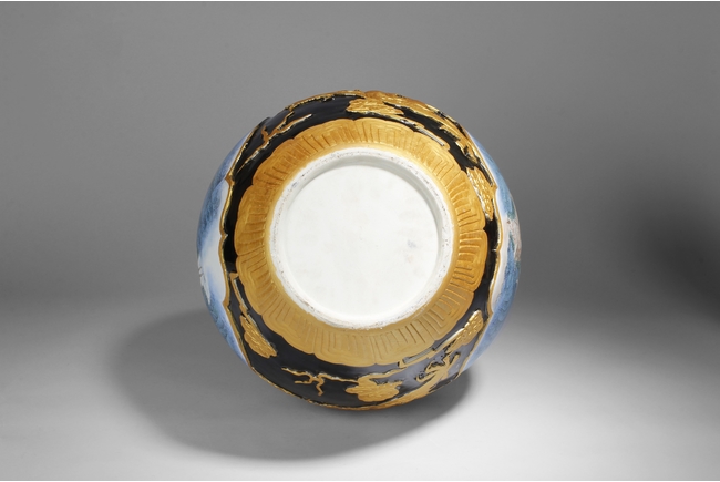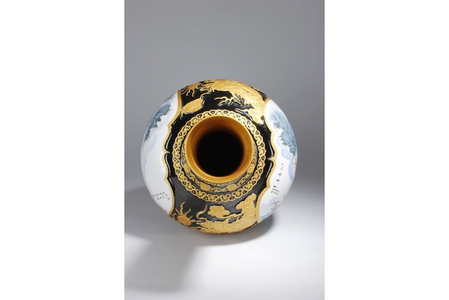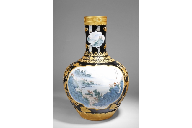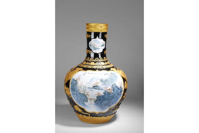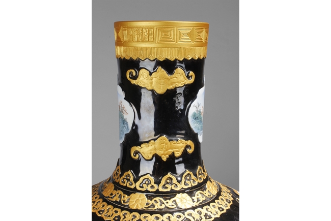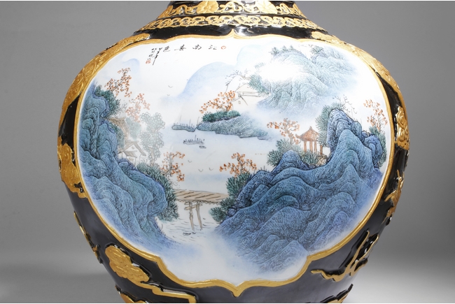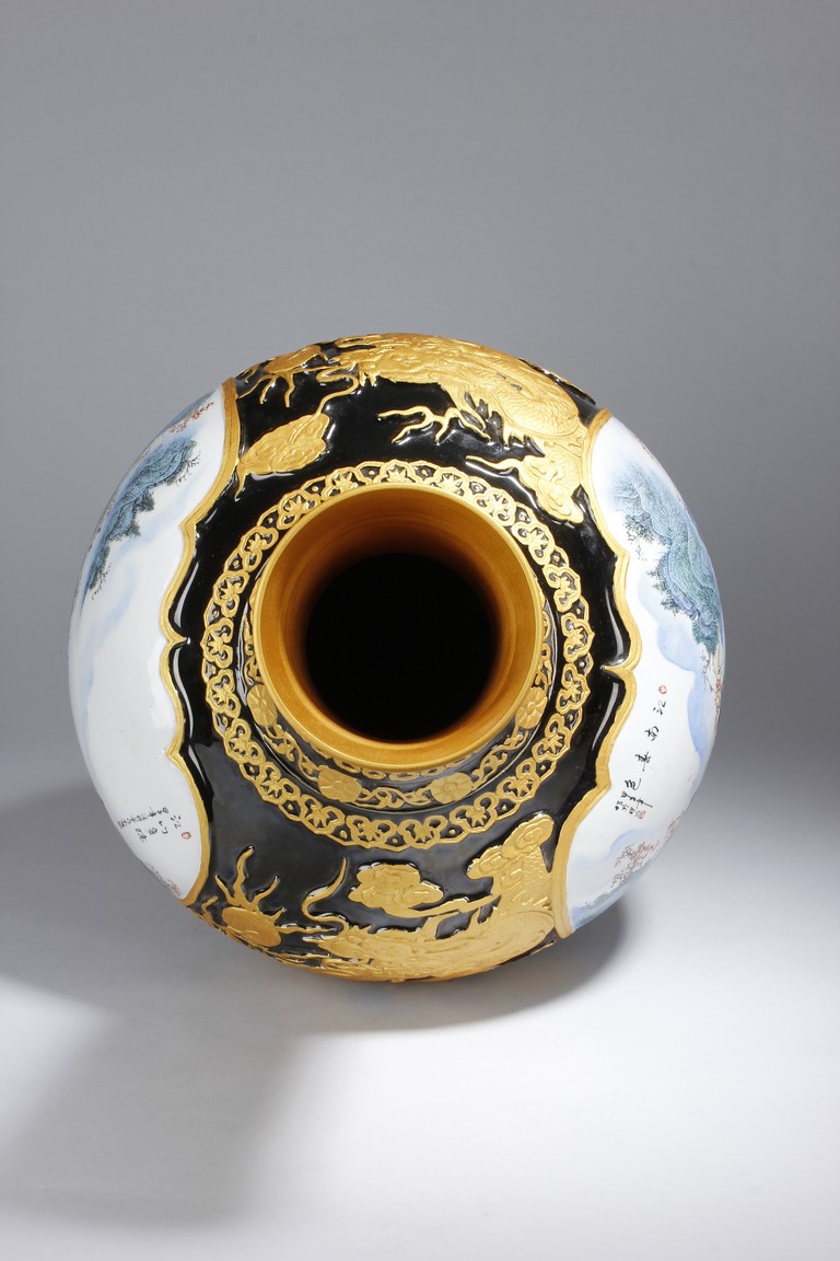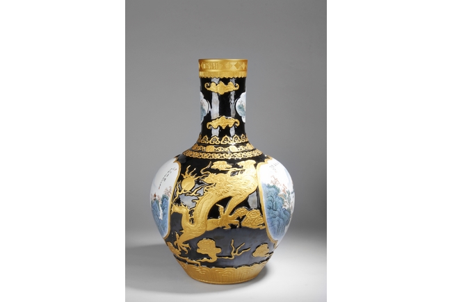 A LARGE PORCELAIN VASE 黑底描金雲龍紋江南山水大瓶