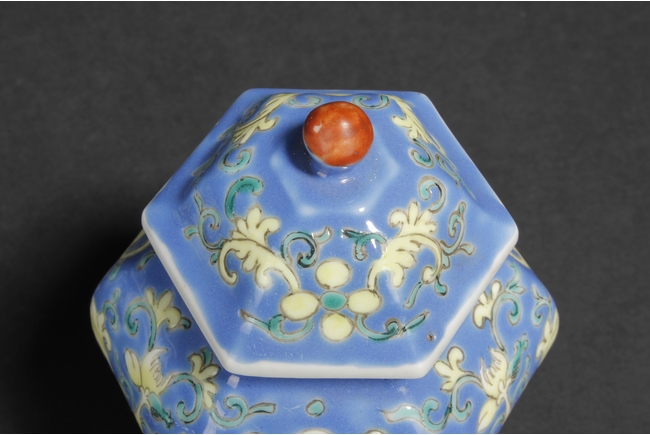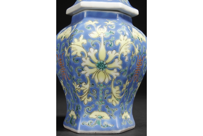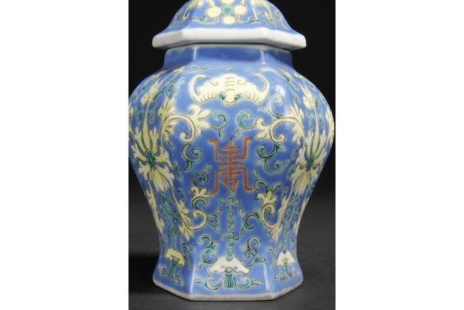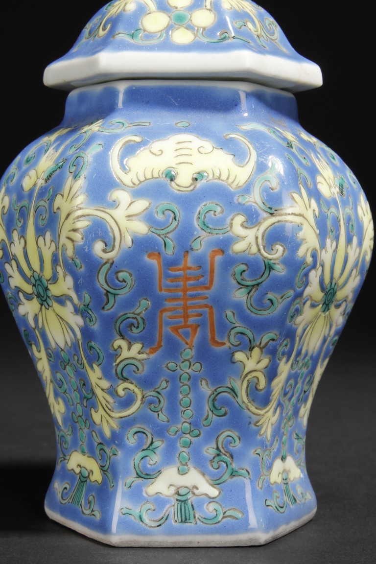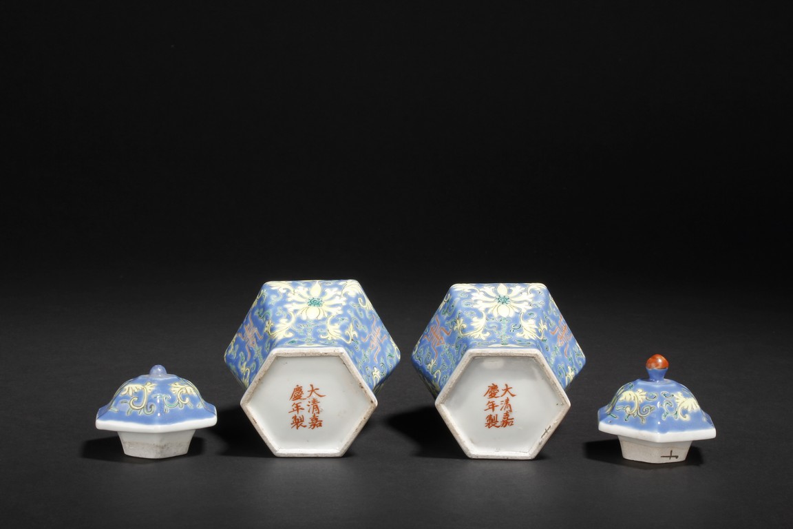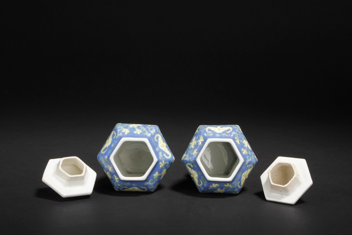 A PAIR OF BLUE GLAZED JARS WITH LIDS 大清嘉慶年製款 六角藍釉蝠紋花卉壽字小蓋罐一對