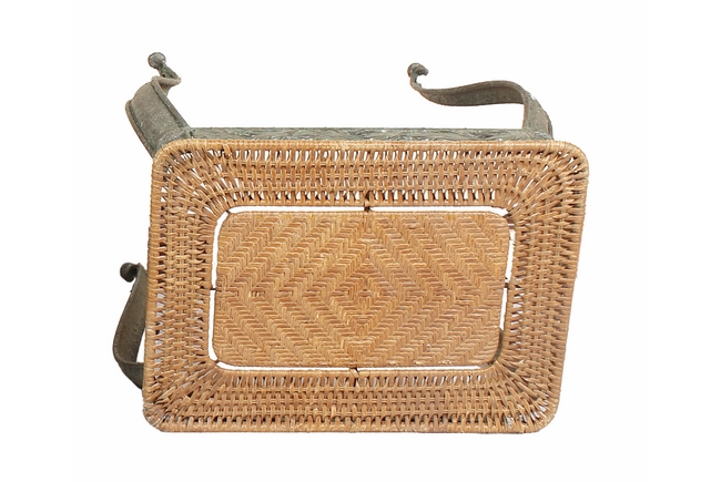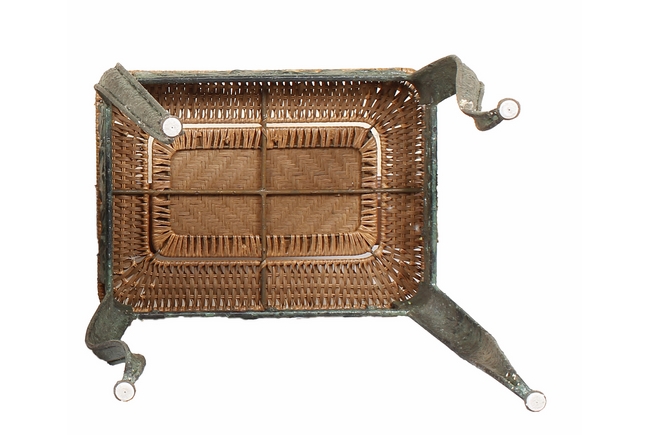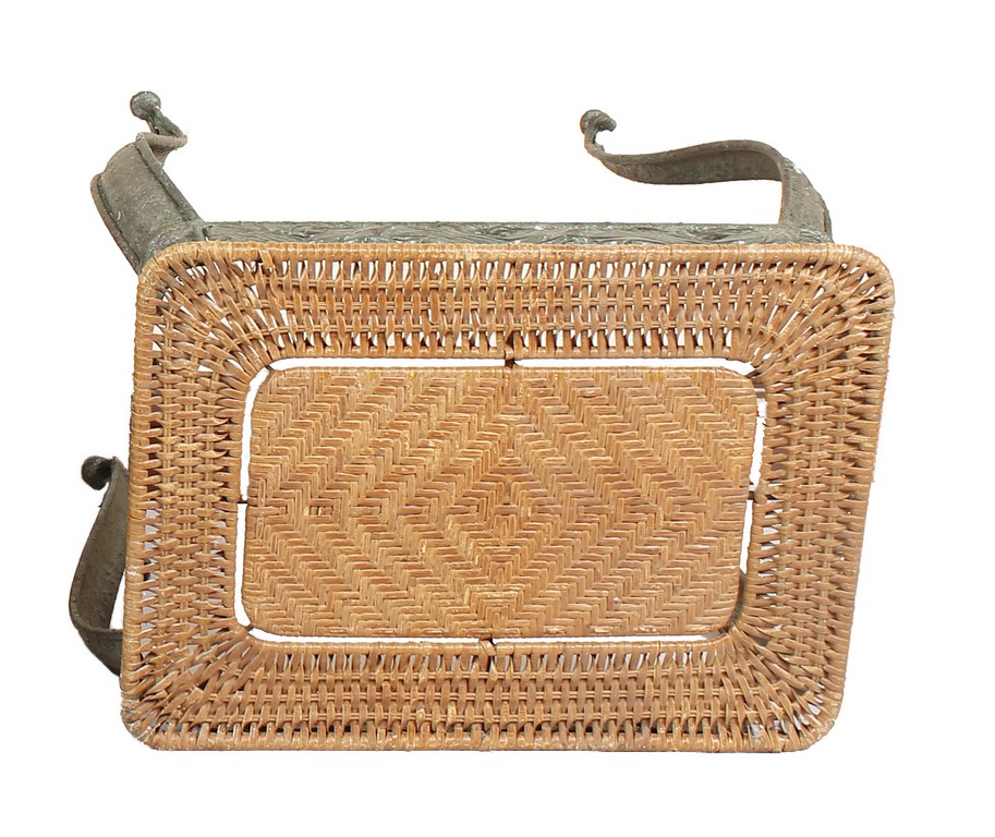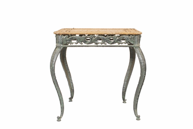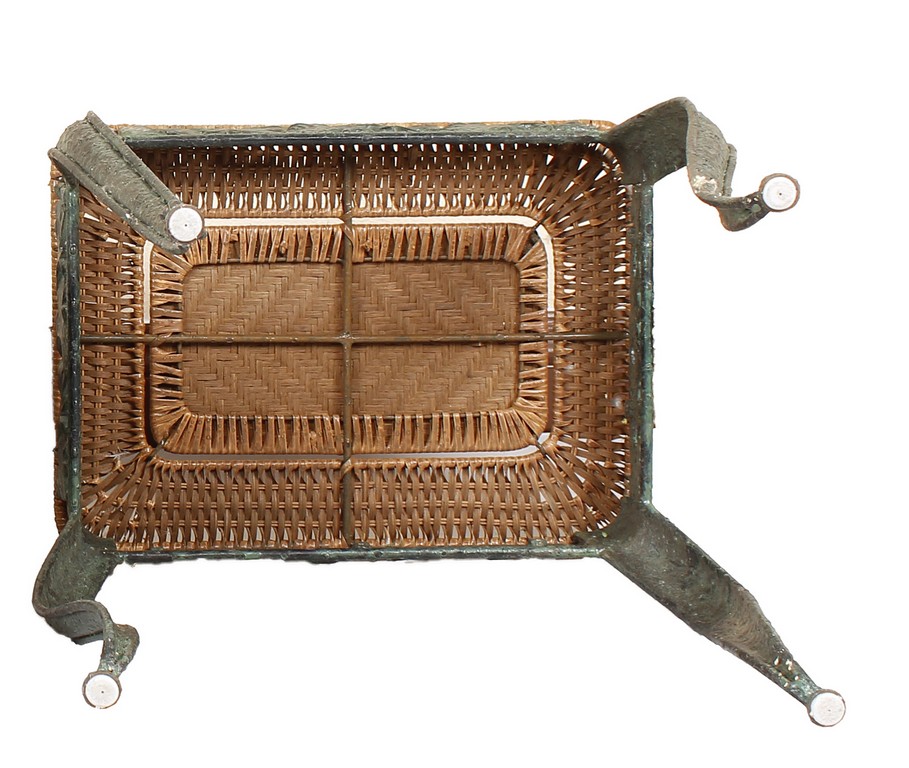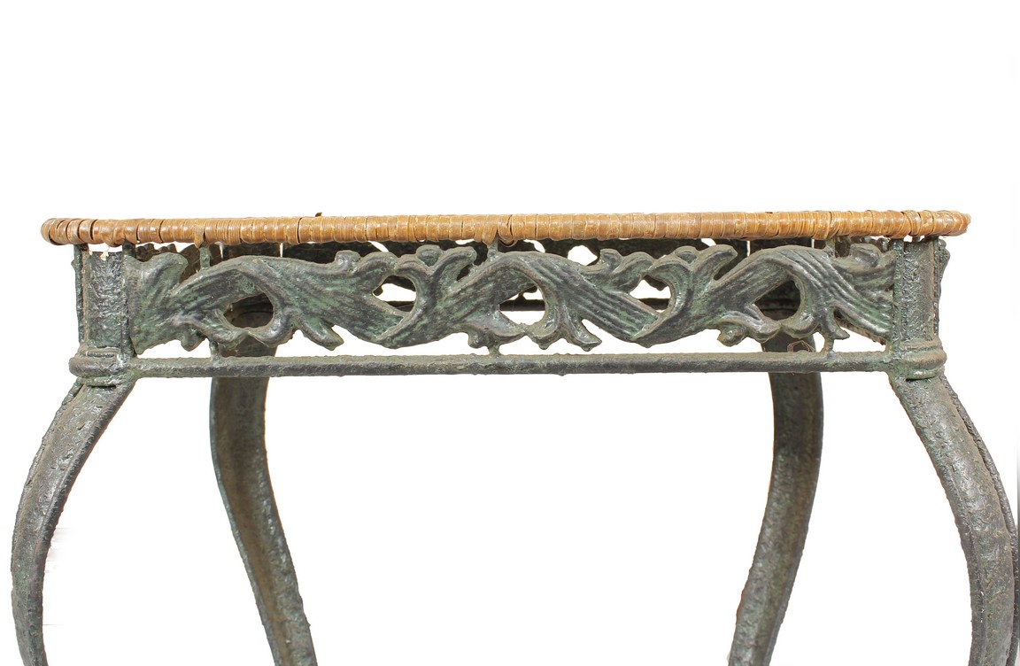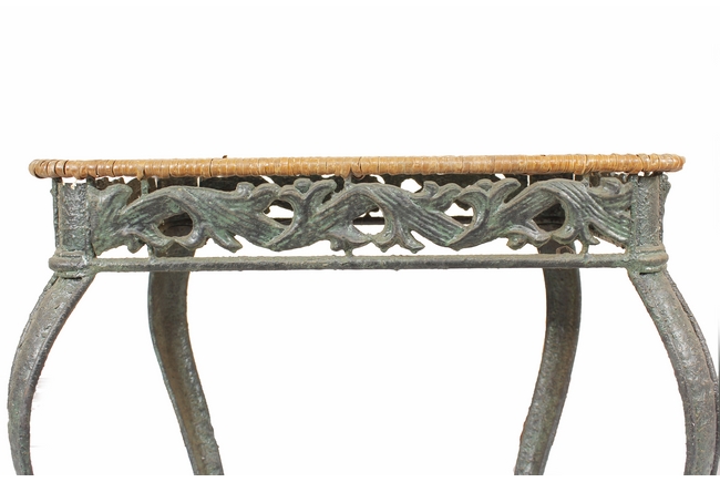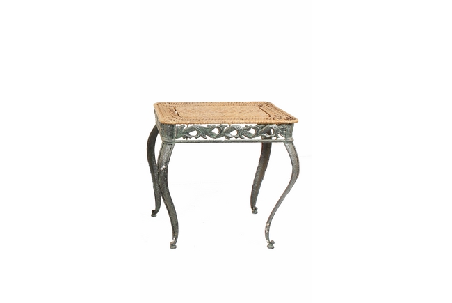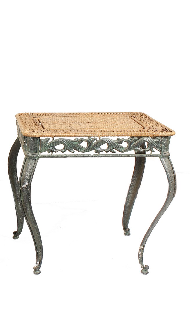The rattan cane table has four curved metal legs supporting the cane surface.