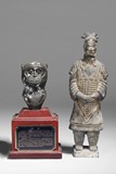 A BRONZE MONKEY HEAD STATUE & A SOLDIER FIGURE
