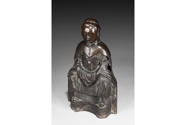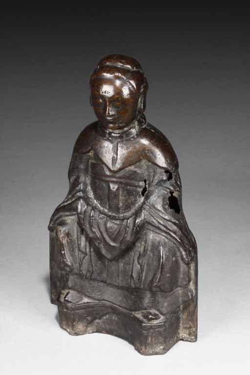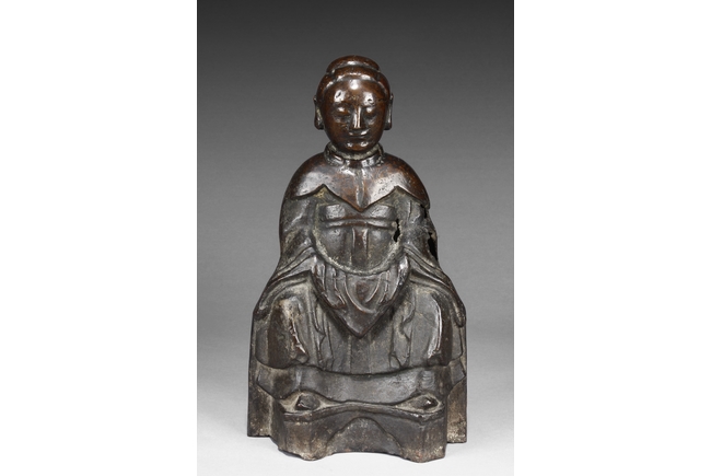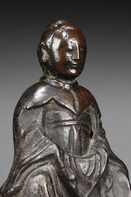 The deity is seated on a chair, with hands on top of knees, dressed in long robe covering the whole body, with additional cape at top and back, the deity has serene expression exhibited by closed eyes and lips curling upwards. Early Ming period.