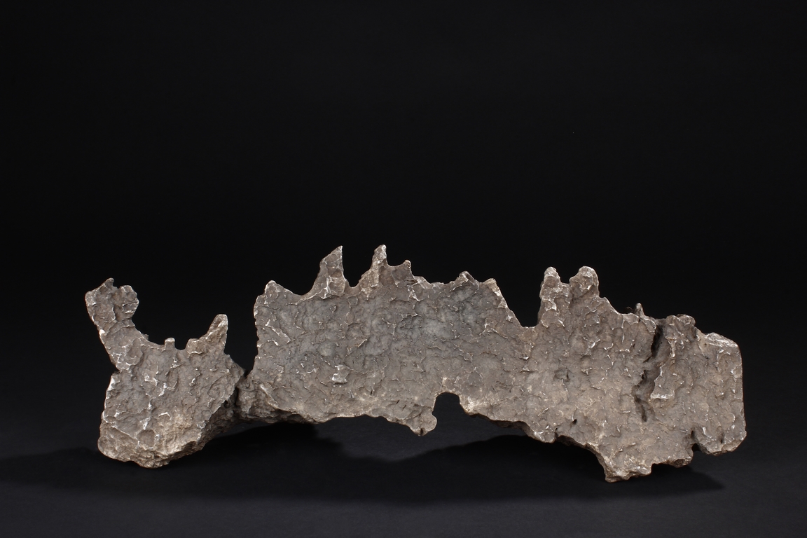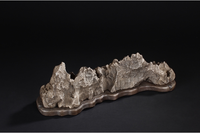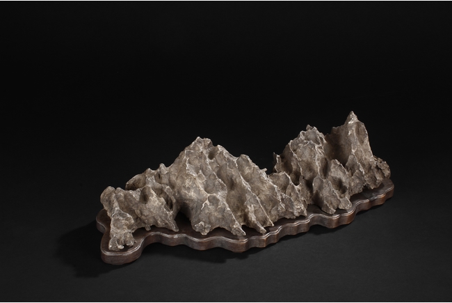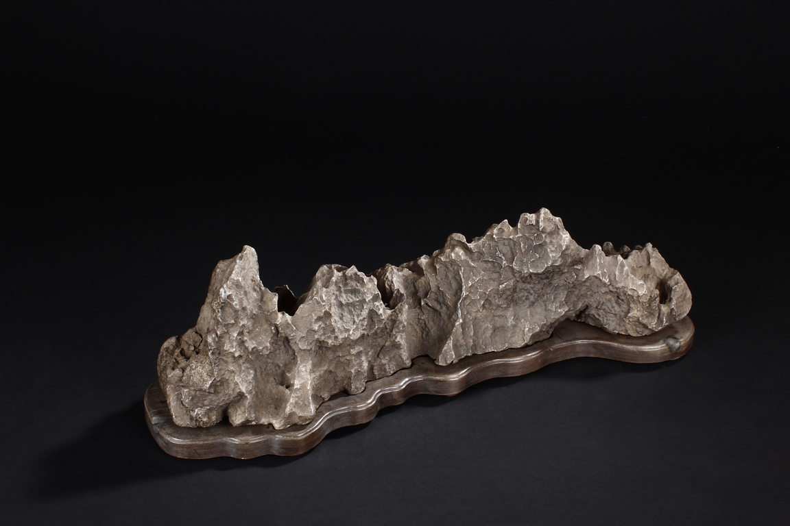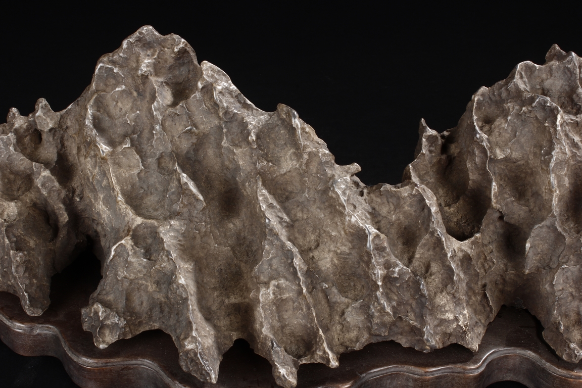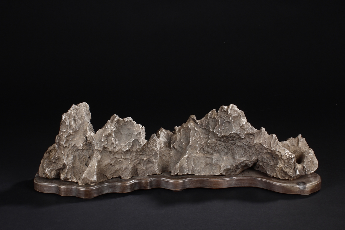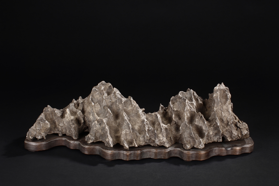 The lingbi stone carved in the form of a mountain range, with jagged and steep edges and natural brown tones. Includes original wooden stand.