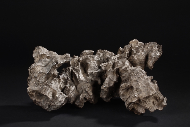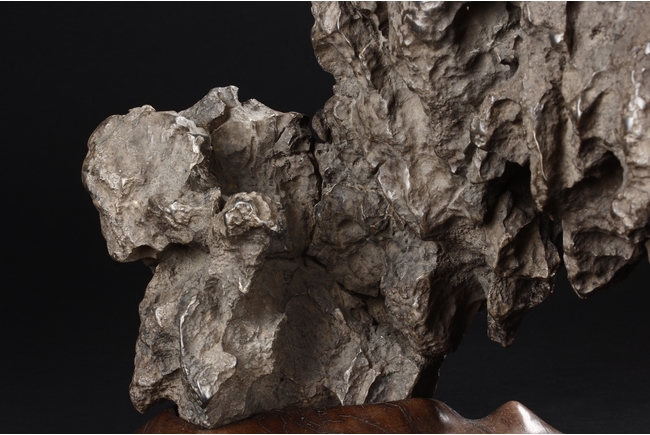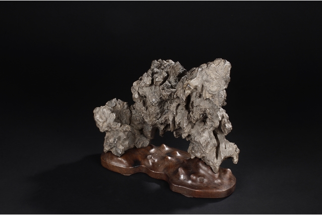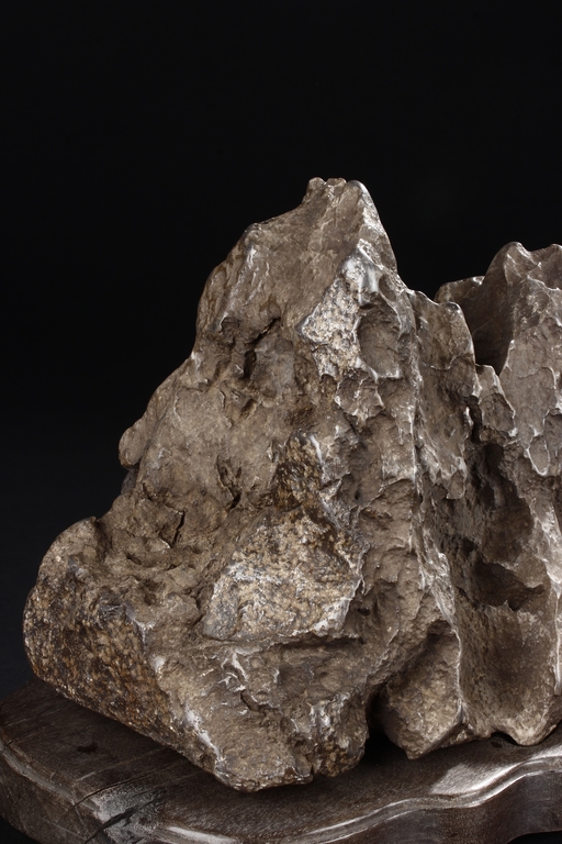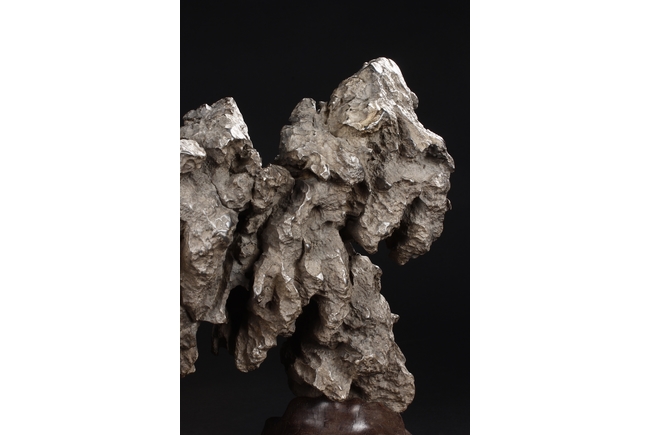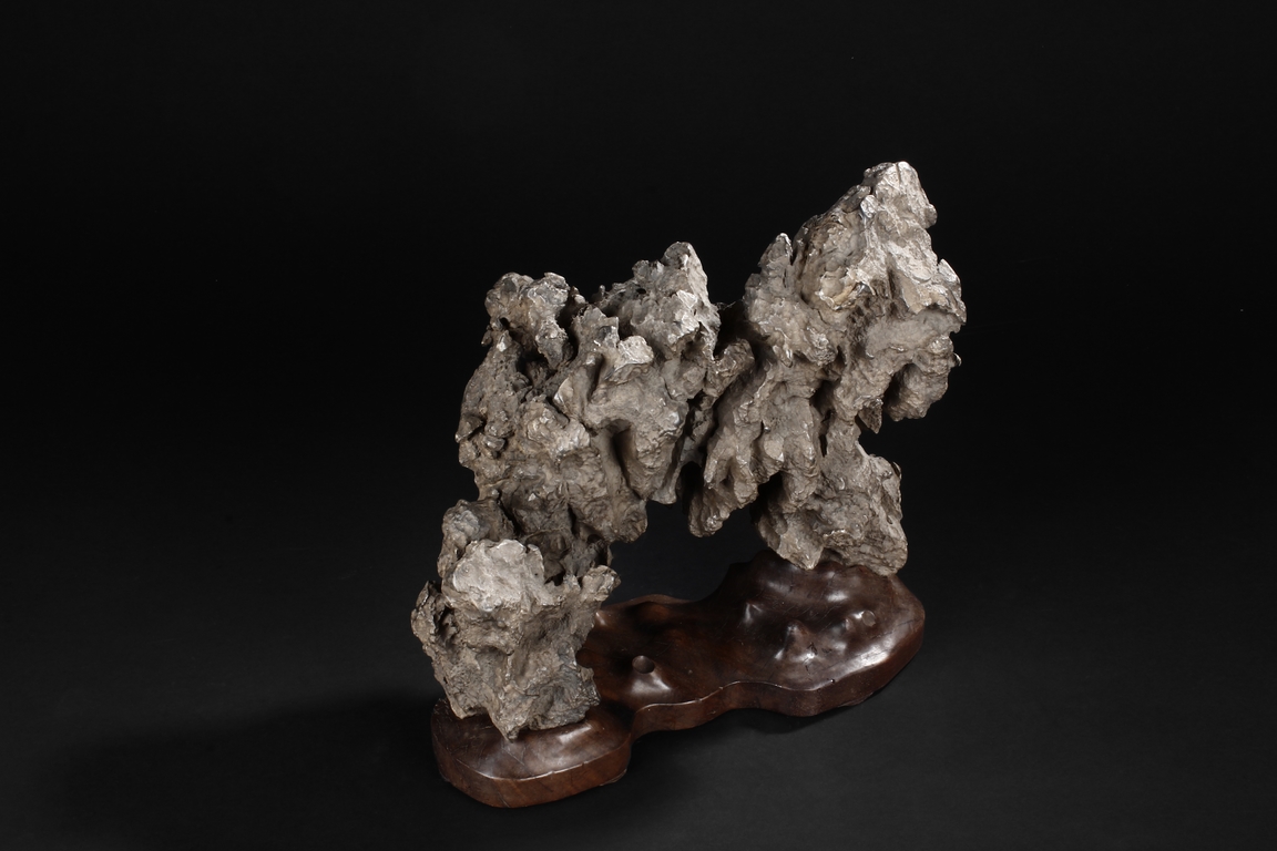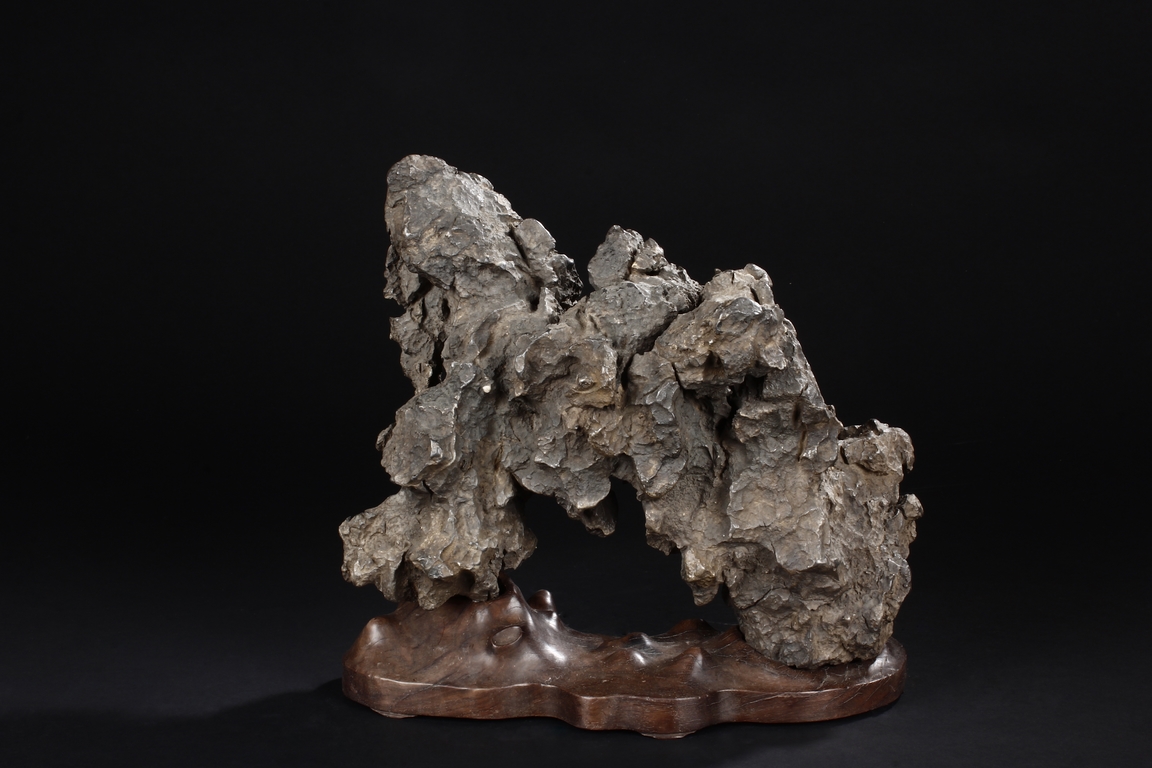 The scholar stone was made from lingbi stone, depicting jagged and steep mountain ridges. Includes original stand.