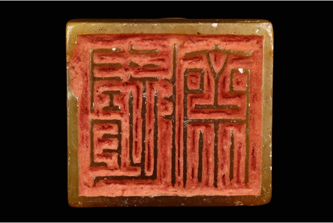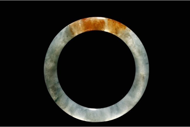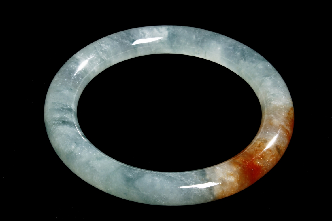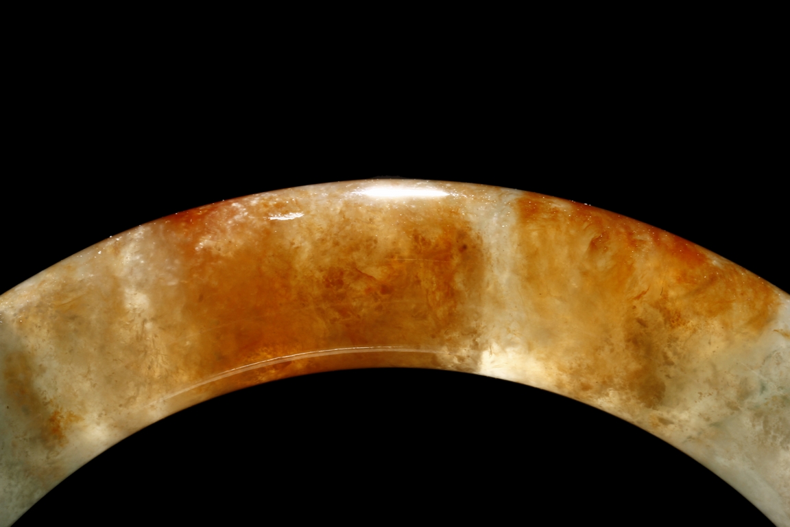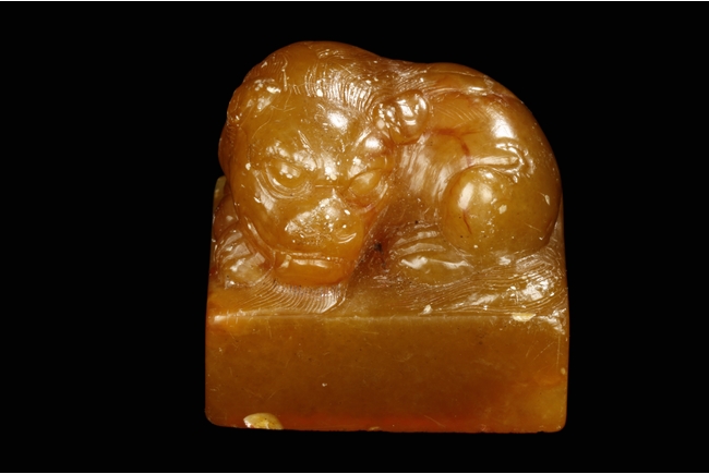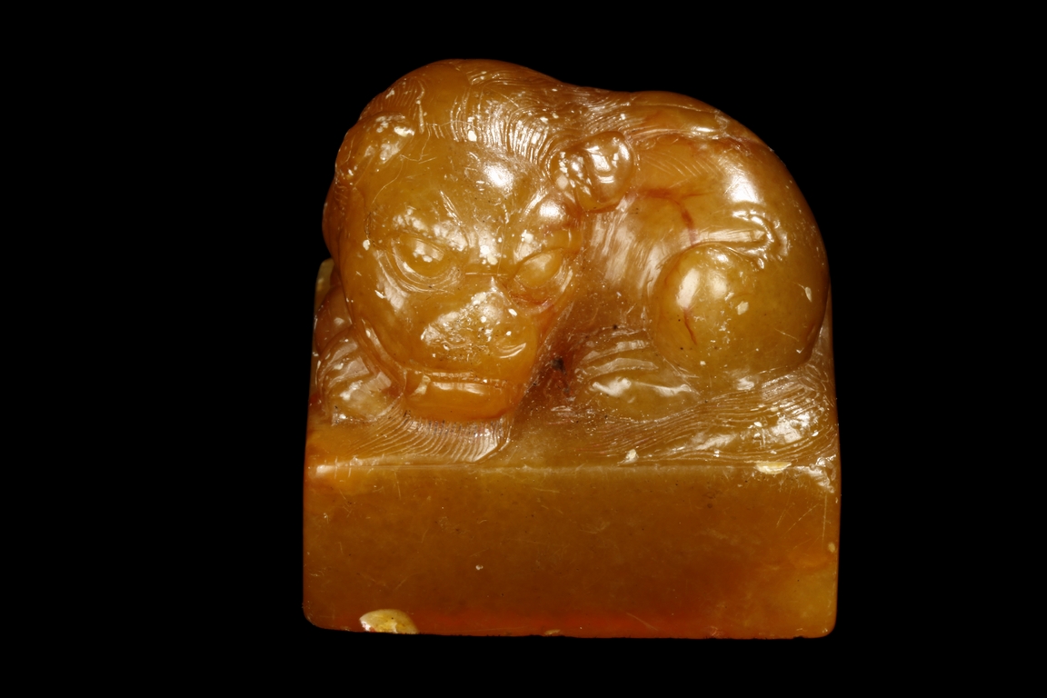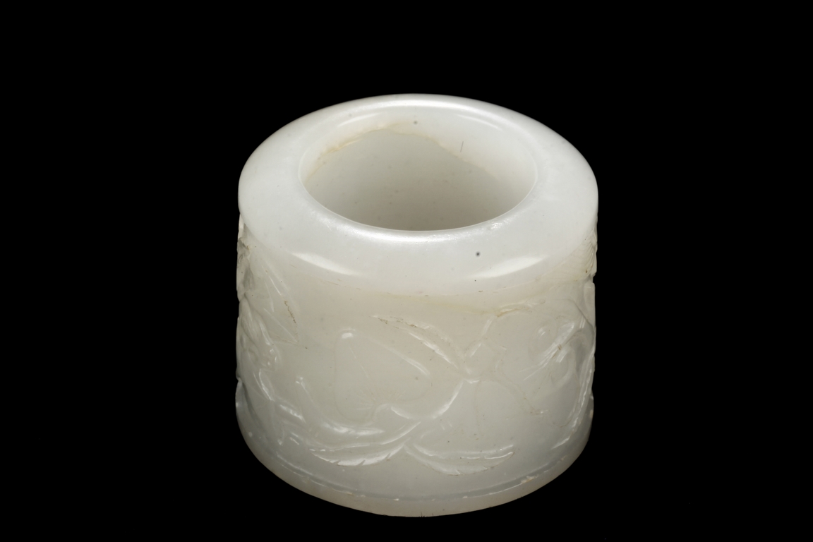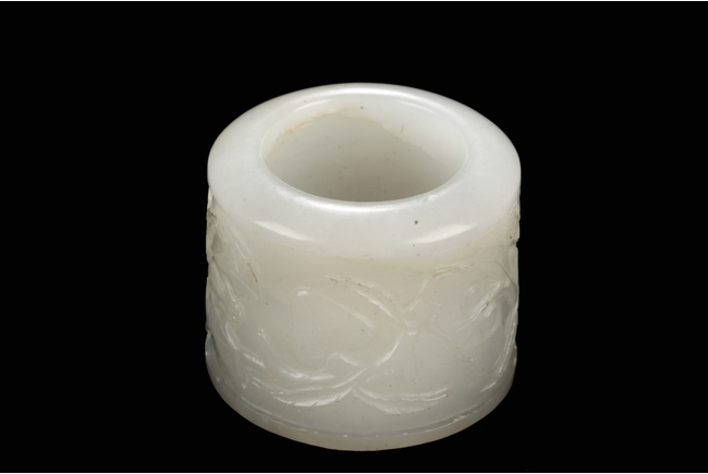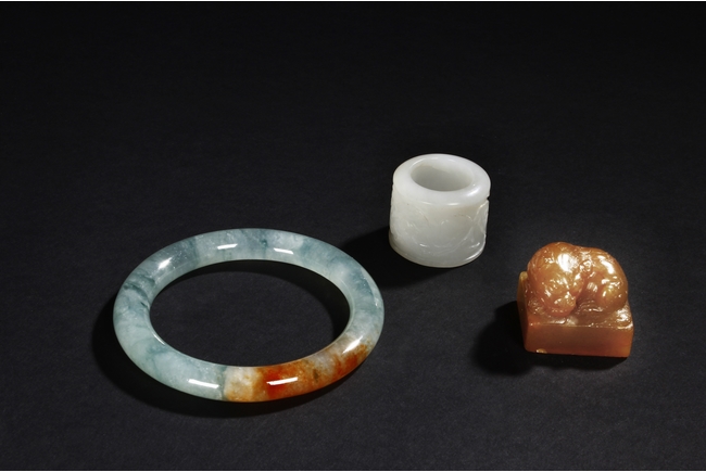 The shoushan stone seal has a compressed square base, with a mythical lion mounted on top, bottom with two character mark. The jade bangle is mostly of blueish white color with translucency and russet. The jade archer's ring has side carved with flowers and vines, the jade of smooth white color with translucency.