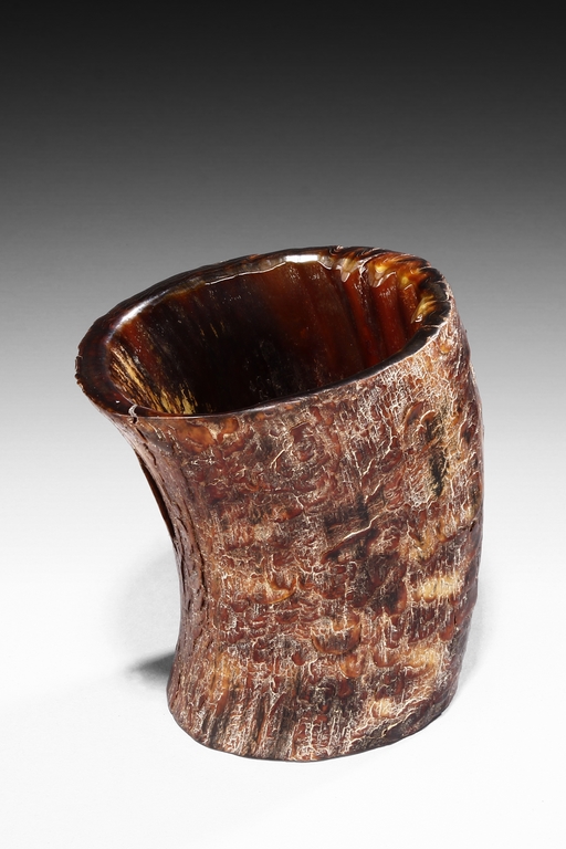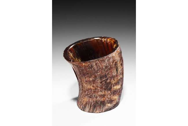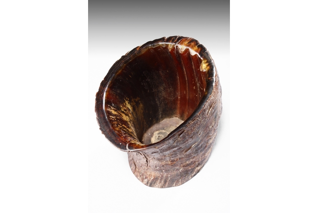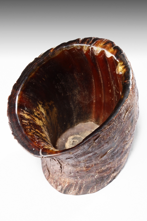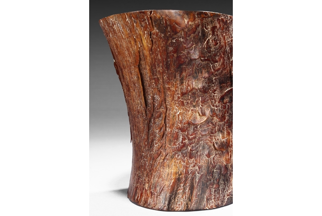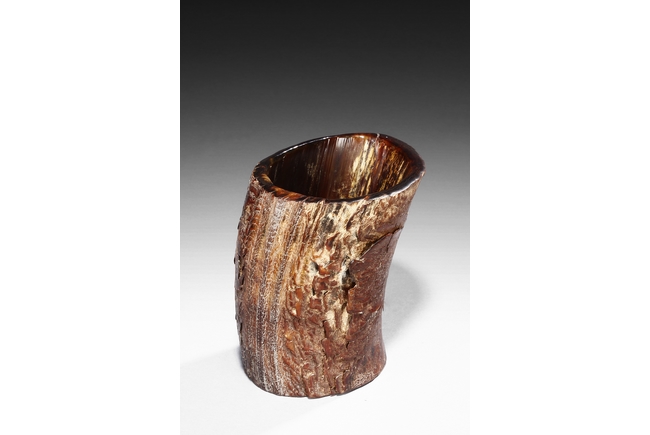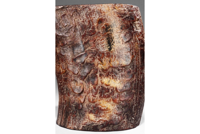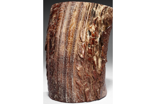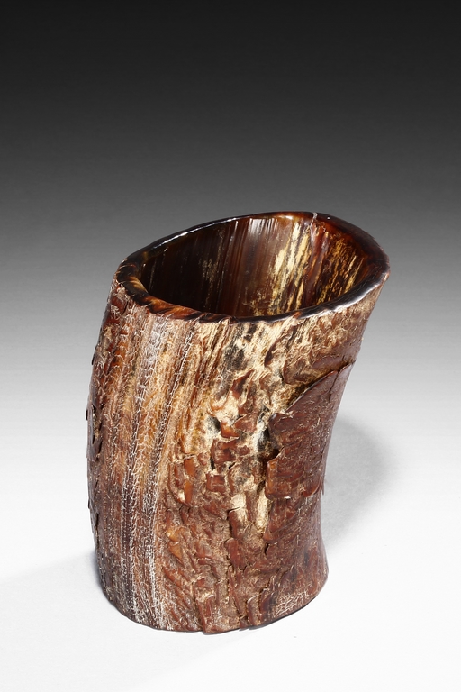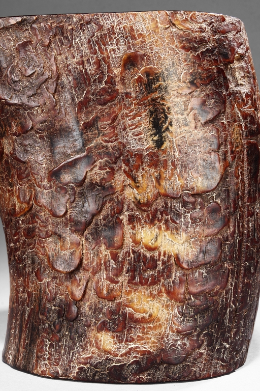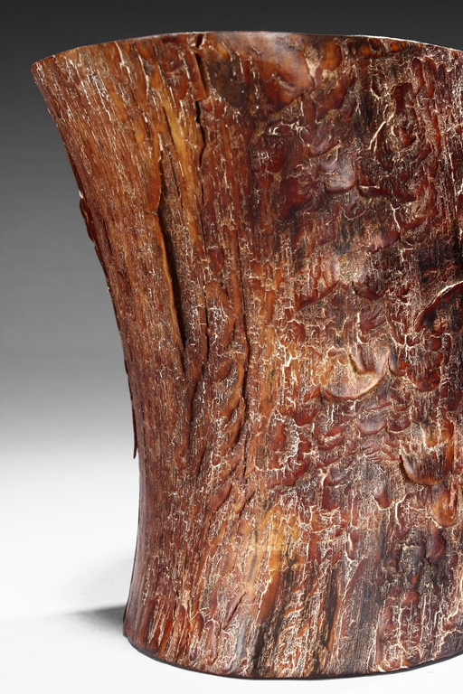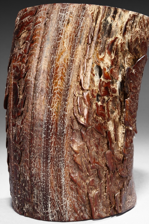 Of curved trunk form, the horn brush pot carved in naturalistic tree trunk form, with dark brown color and patina. Visible crackle patterns. Qing Dynasty period.