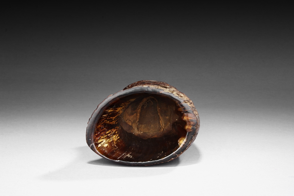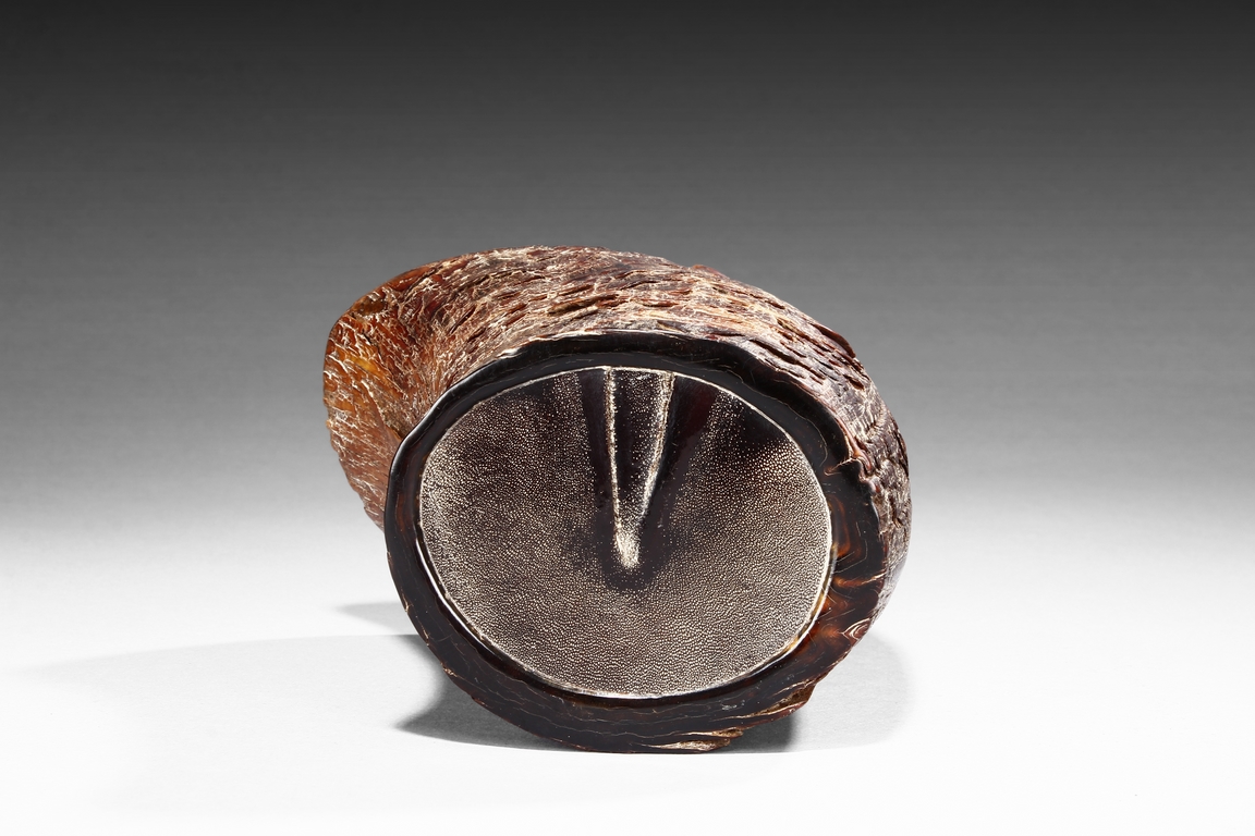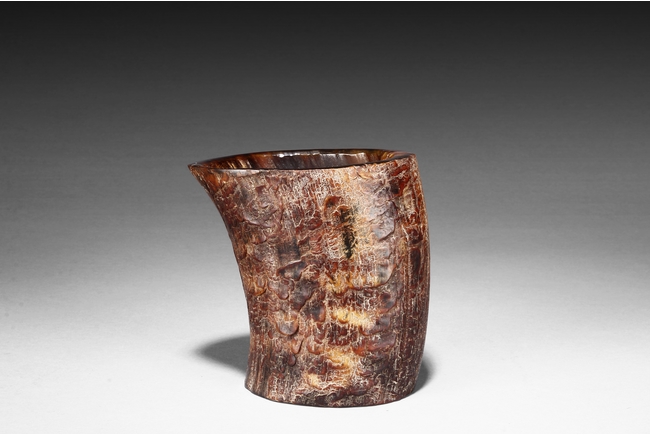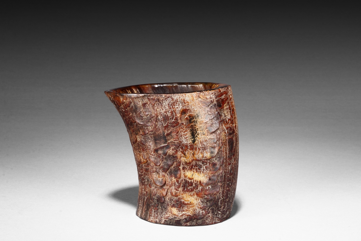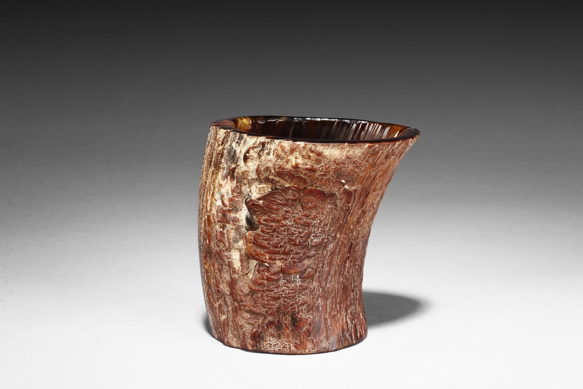 Of curved trunk form, the horn brush pot carved in naturalistic tree trunk form, with dark brown color and patina. Visible crackle patterns. Qing Dynasty period.