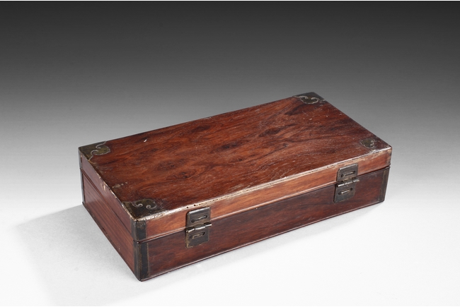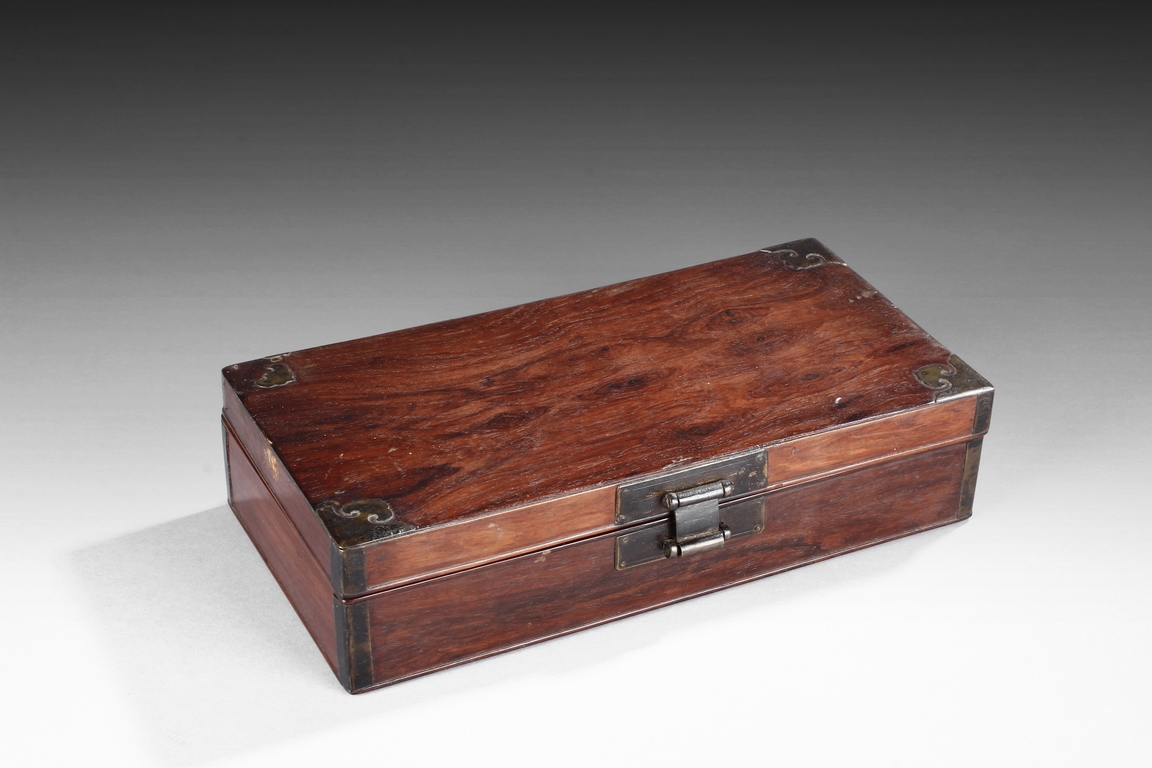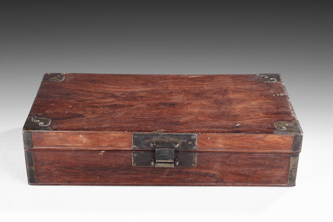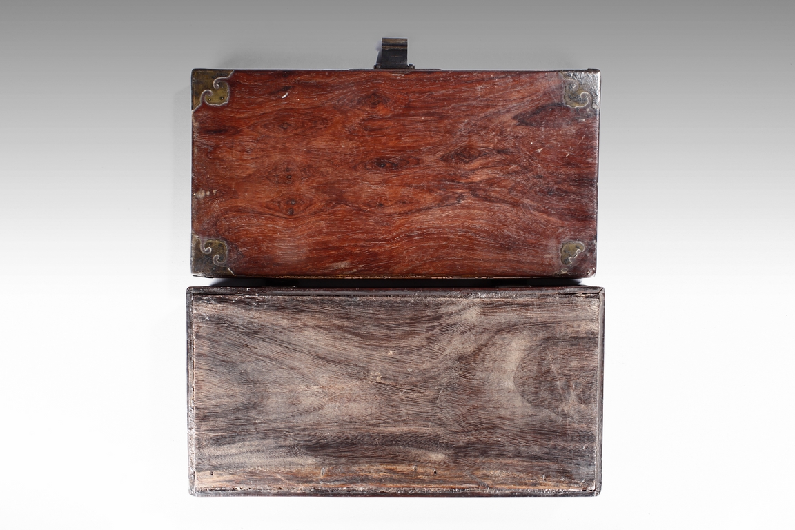 Of rectangular form, the box made from huanghuali wood of rich colour and beautiful graining, with ruyi head shaped brass edges, and rectangular lock plate on the front.