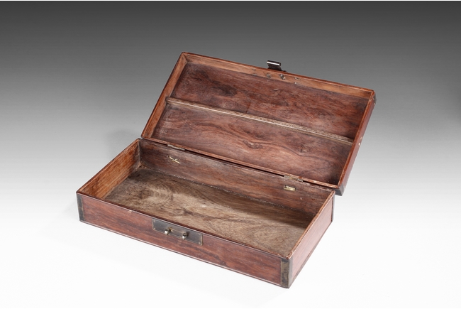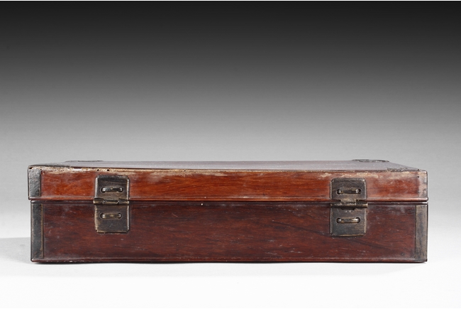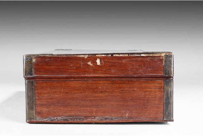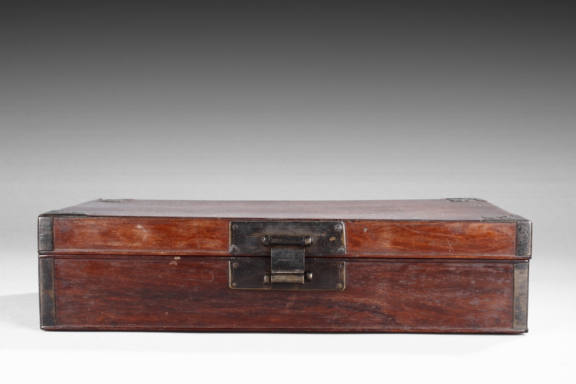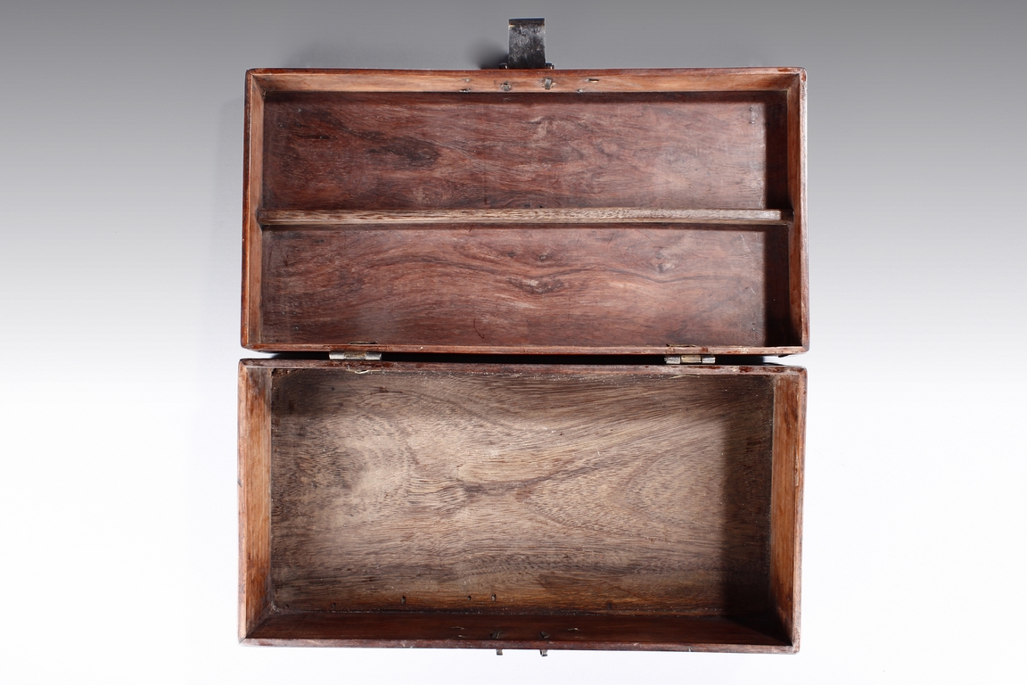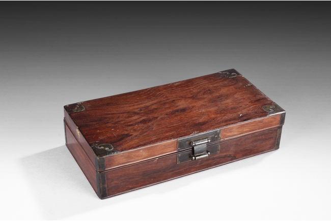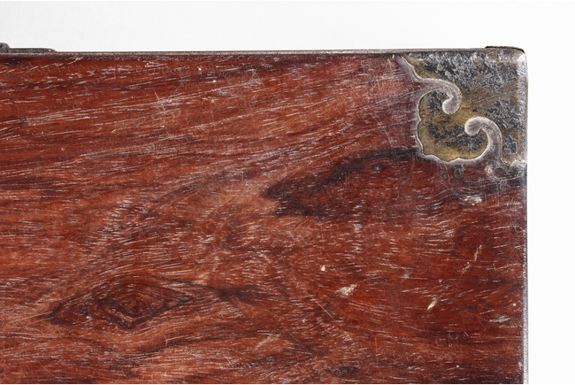 Of rectangular form, the box made from huanghuali wood of rich colour and beautiful graining, with ruyi head shaped brass edges, and rectangular lock plate on the front.