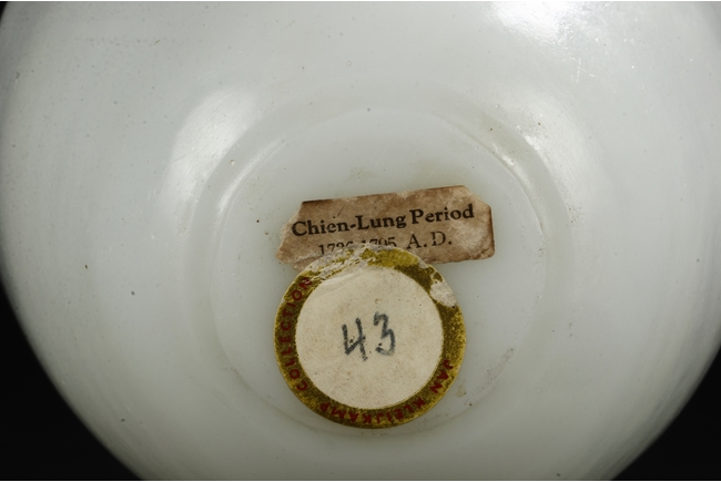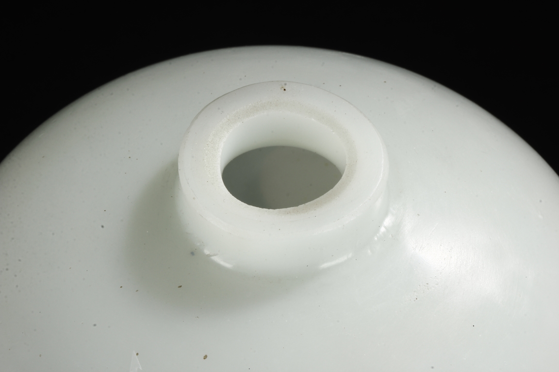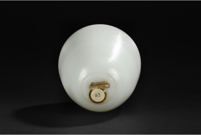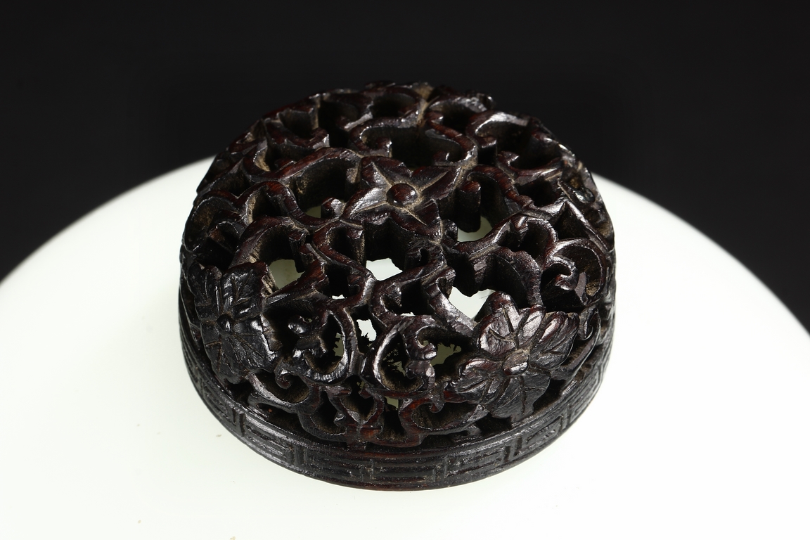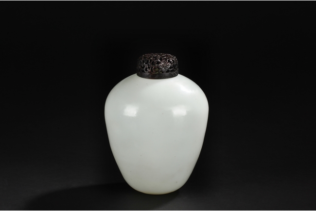 The bottle has a round body with wide shoulders tapering downwards, body of creamy white color, the cover made from wood and carved in openwork depicting flowers and vines. Qing Dynasty period.