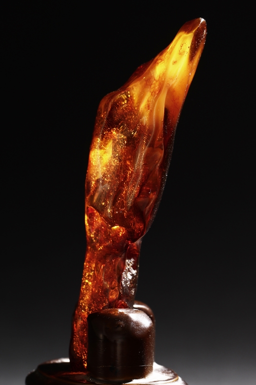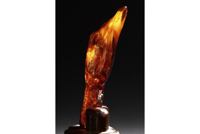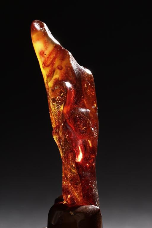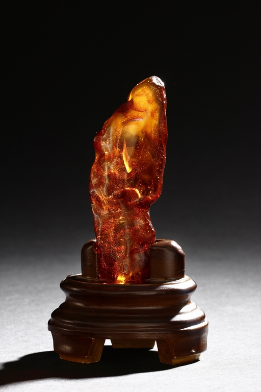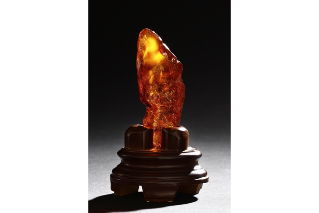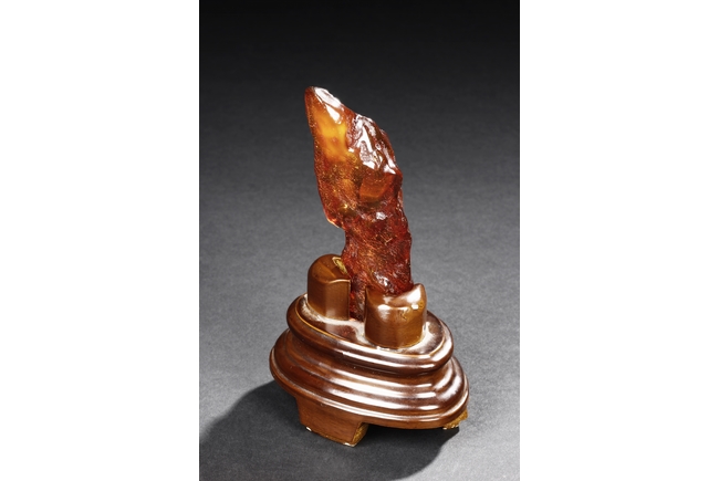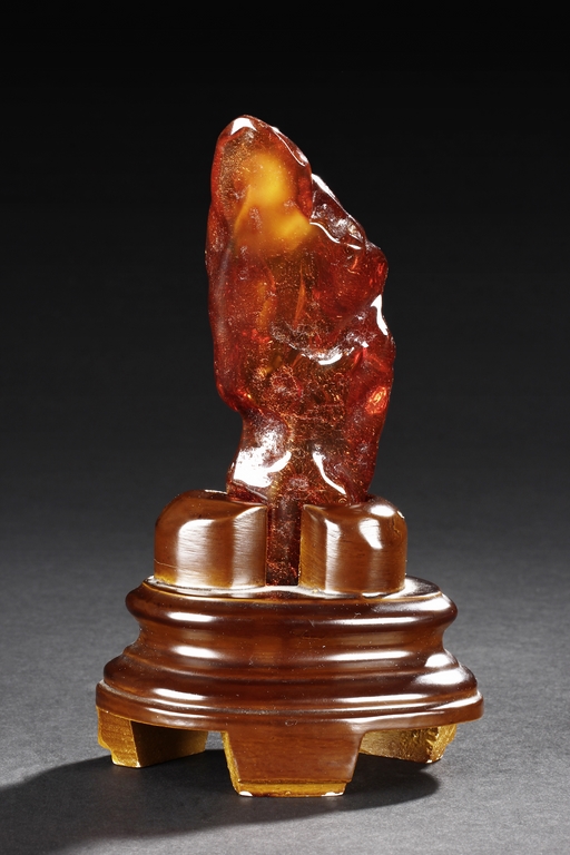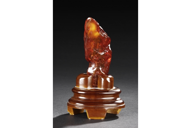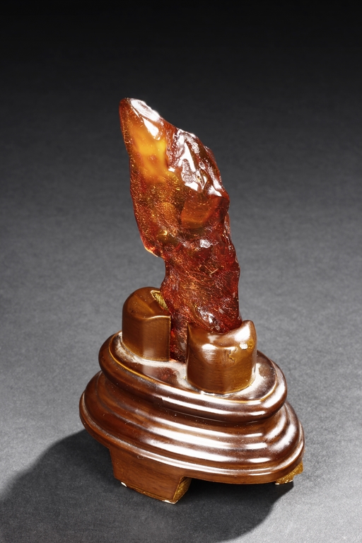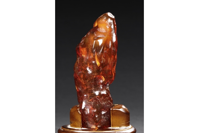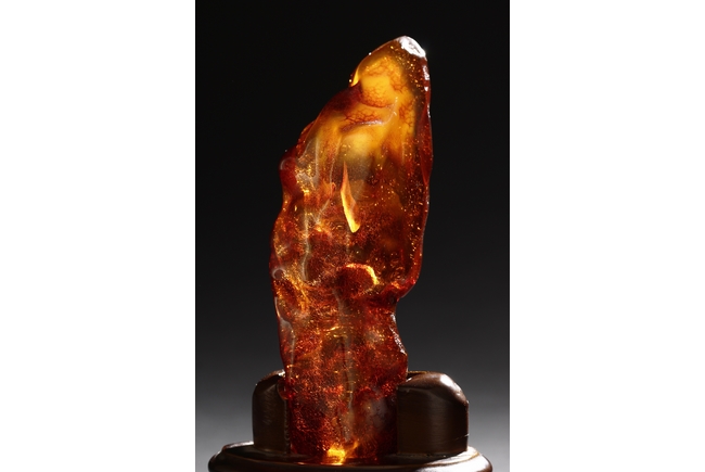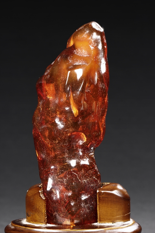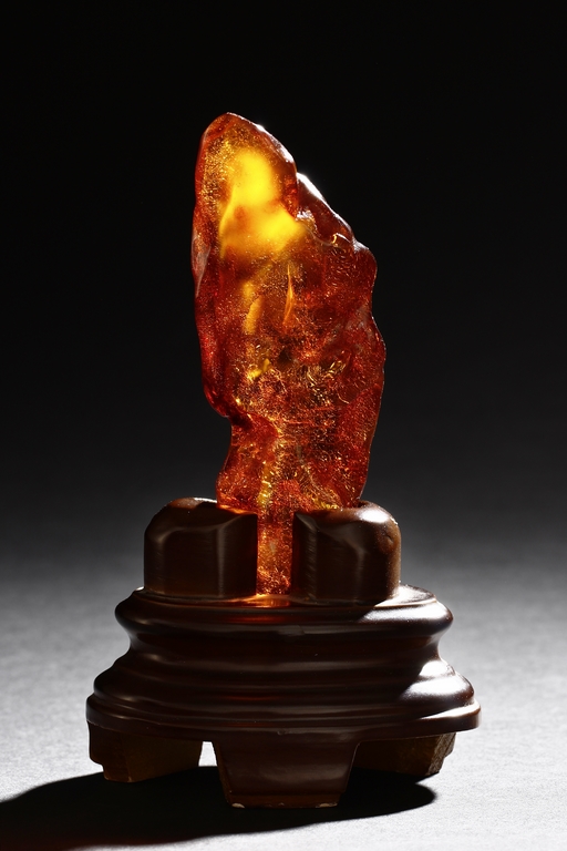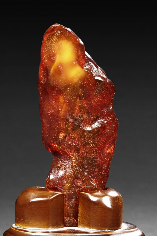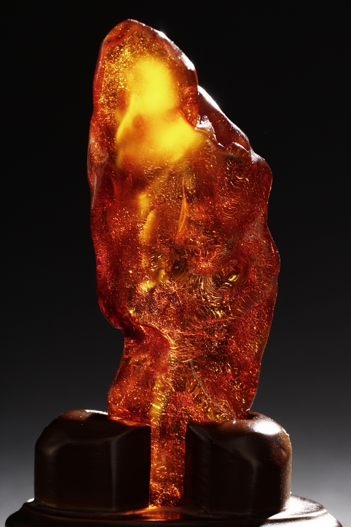 The amber is of fine orange-red color, with yellow hue in the top center, visible age related fine crackle patterns and good translucency, the amber is set into a wooden stand.