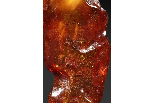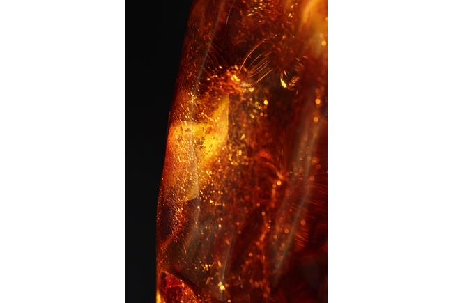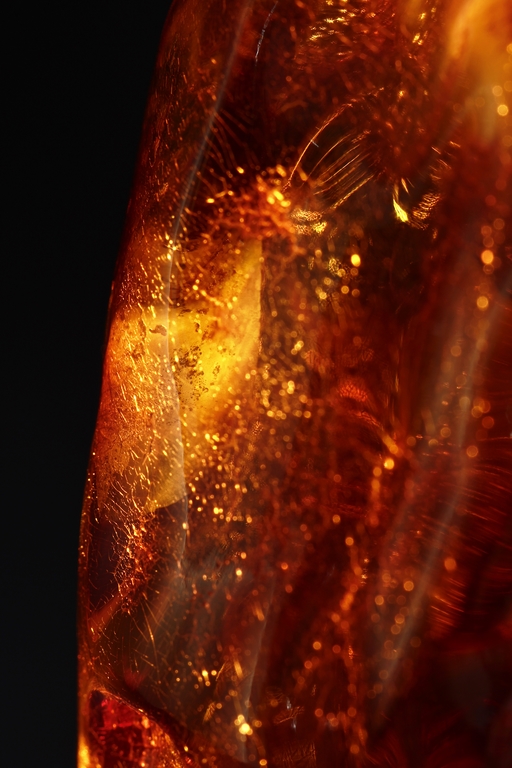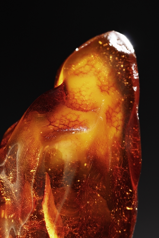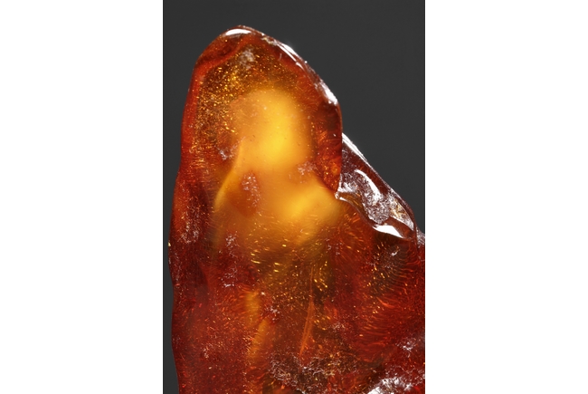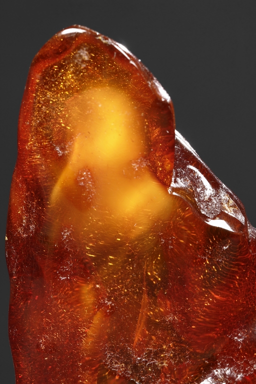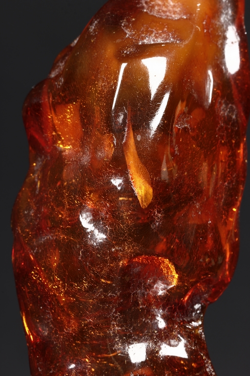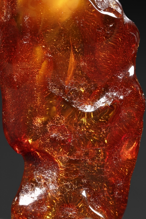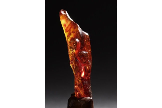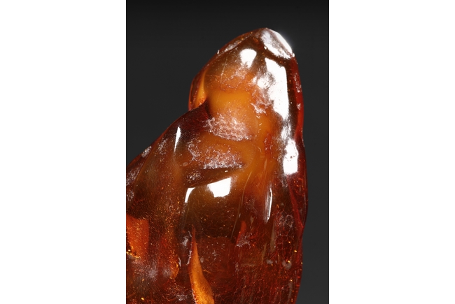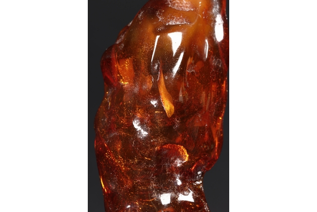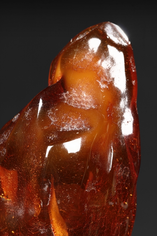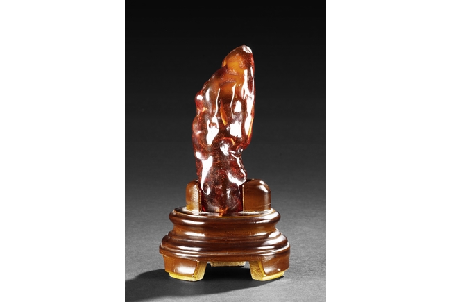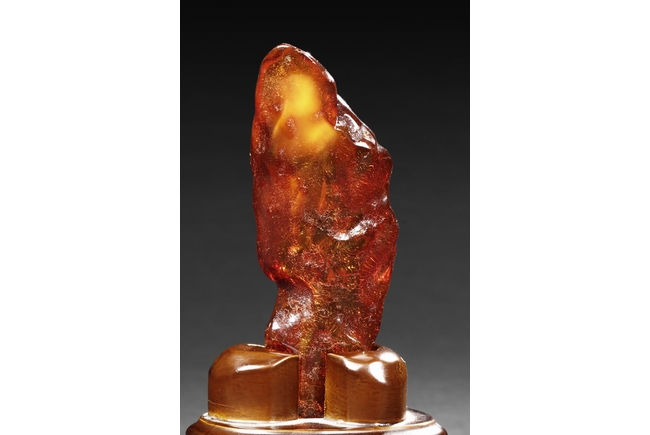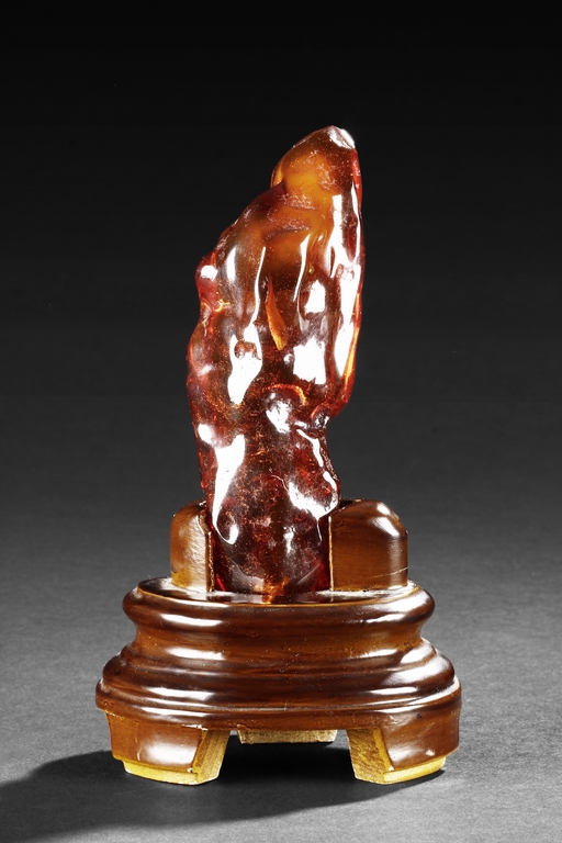 The amber is of fine orange-red color, with yellow hue in the top center, visible age related fine crackle patterns and good translucency, the amber is set into a wooden stand.