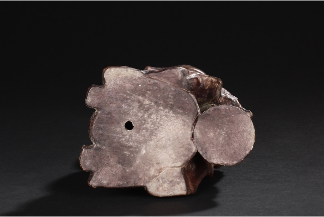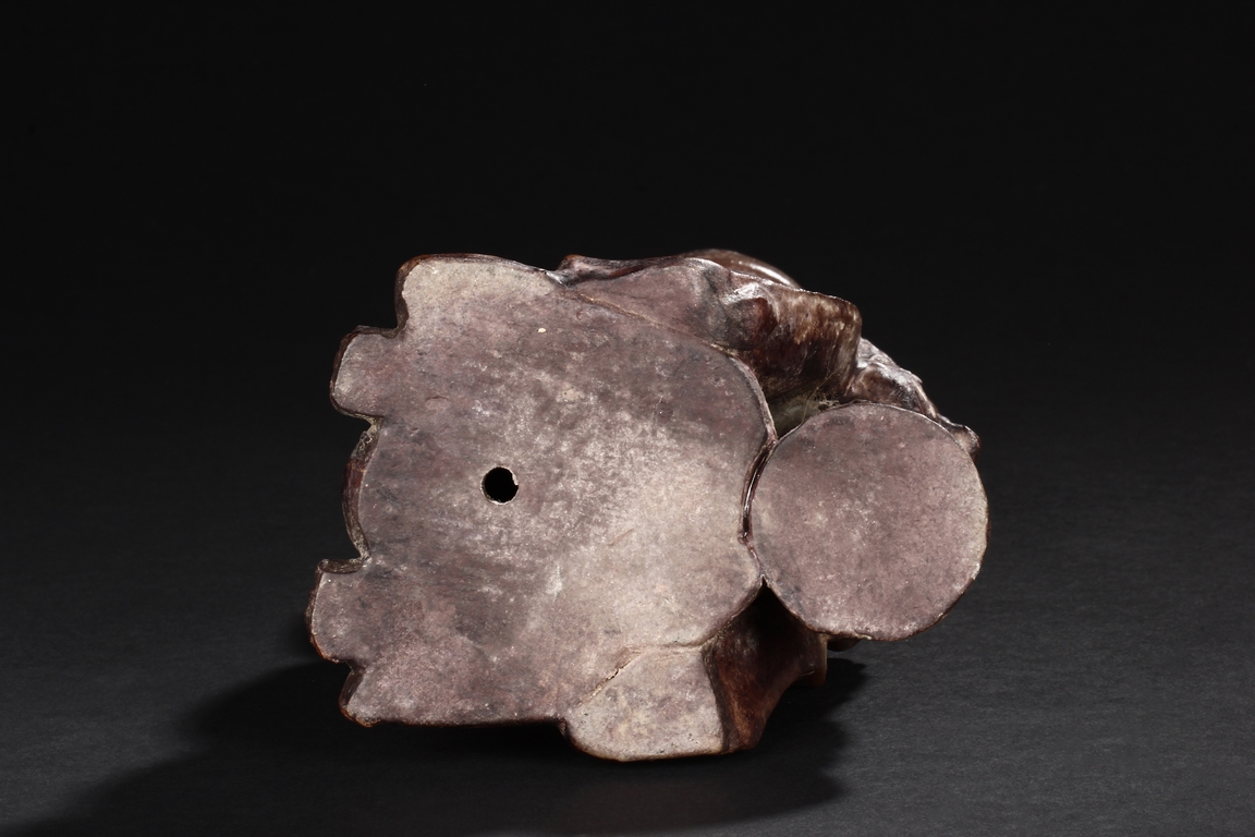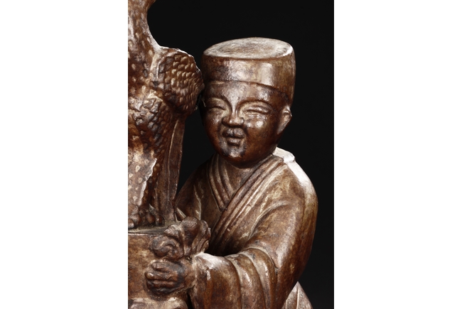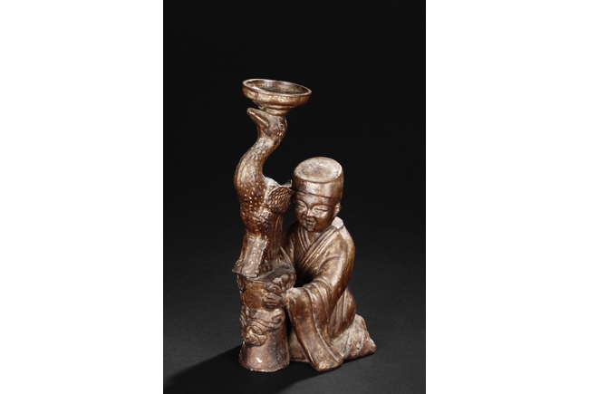 Carefully sculpted, the ceramic candleholder depicts a robed man kneeling in front of a drum-shaped column, which mounts a crane with head raised high, holding a bowl for the candle, all glazed in dark brown with excellent patina. Tang/Song Dynasty period.
