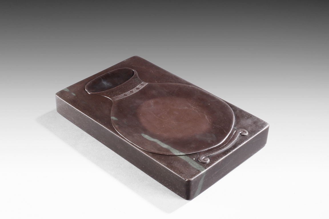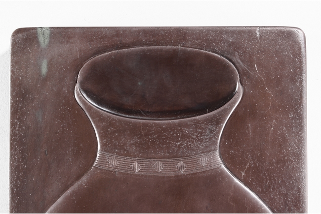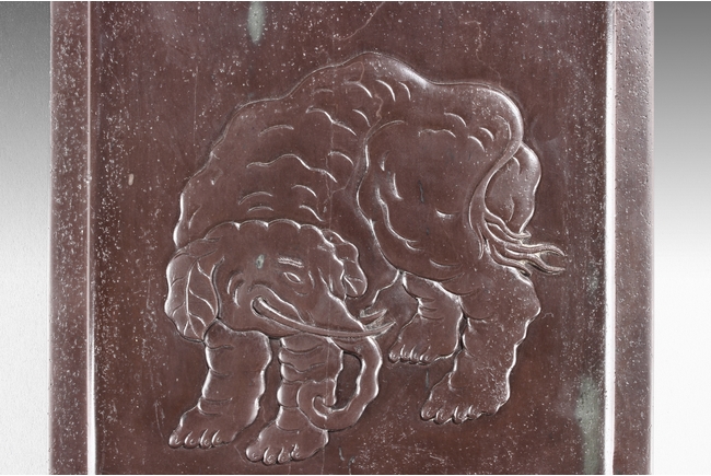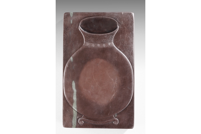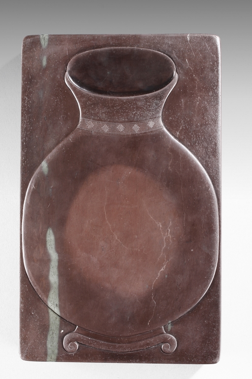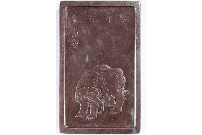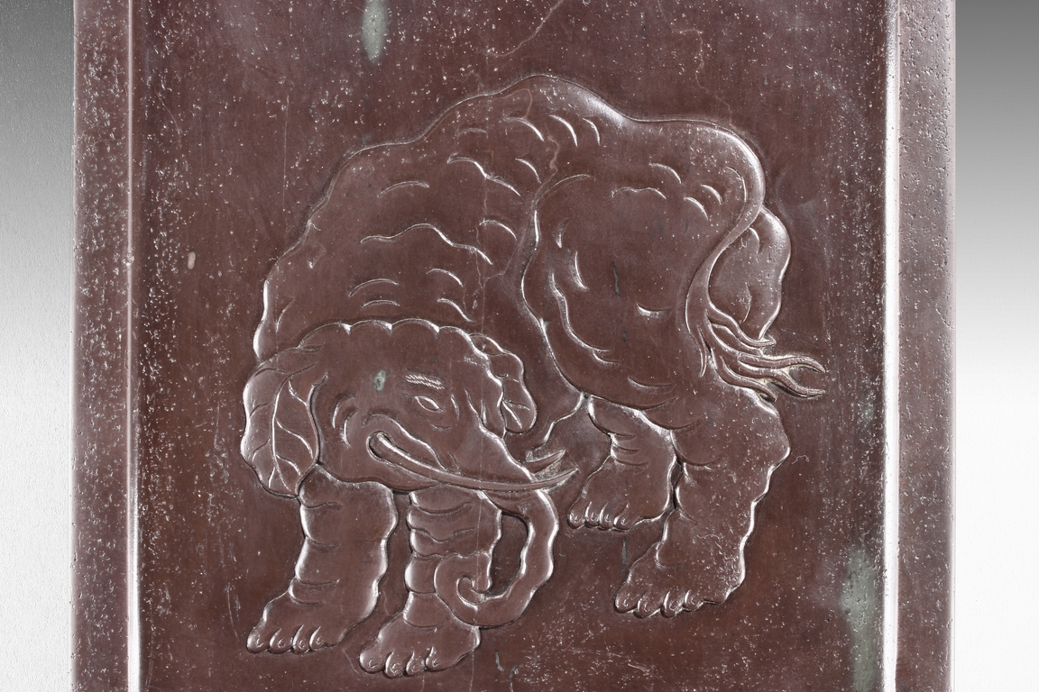 The rectangular ink stone is carved and inscribed with four character 'Tai Ping You Xiang' and an elephant below on one side, and on the other side with baluster-shaped vase in relief as inkwell . The stone is of purplish-brown color. Qing Dyansty Period.