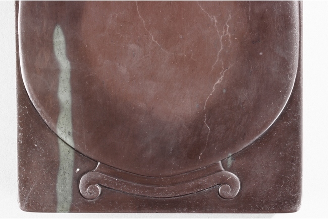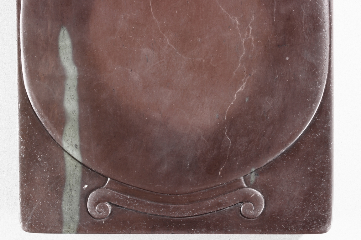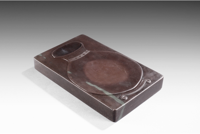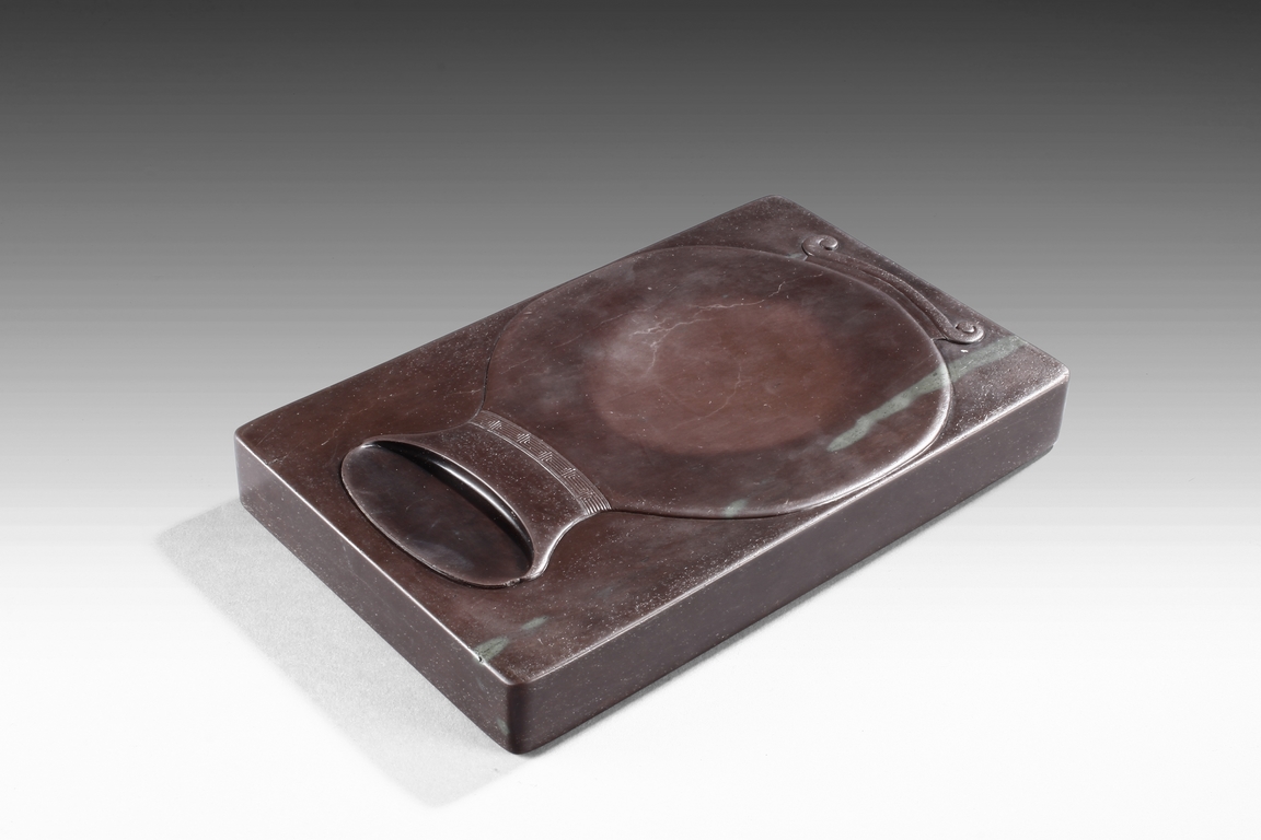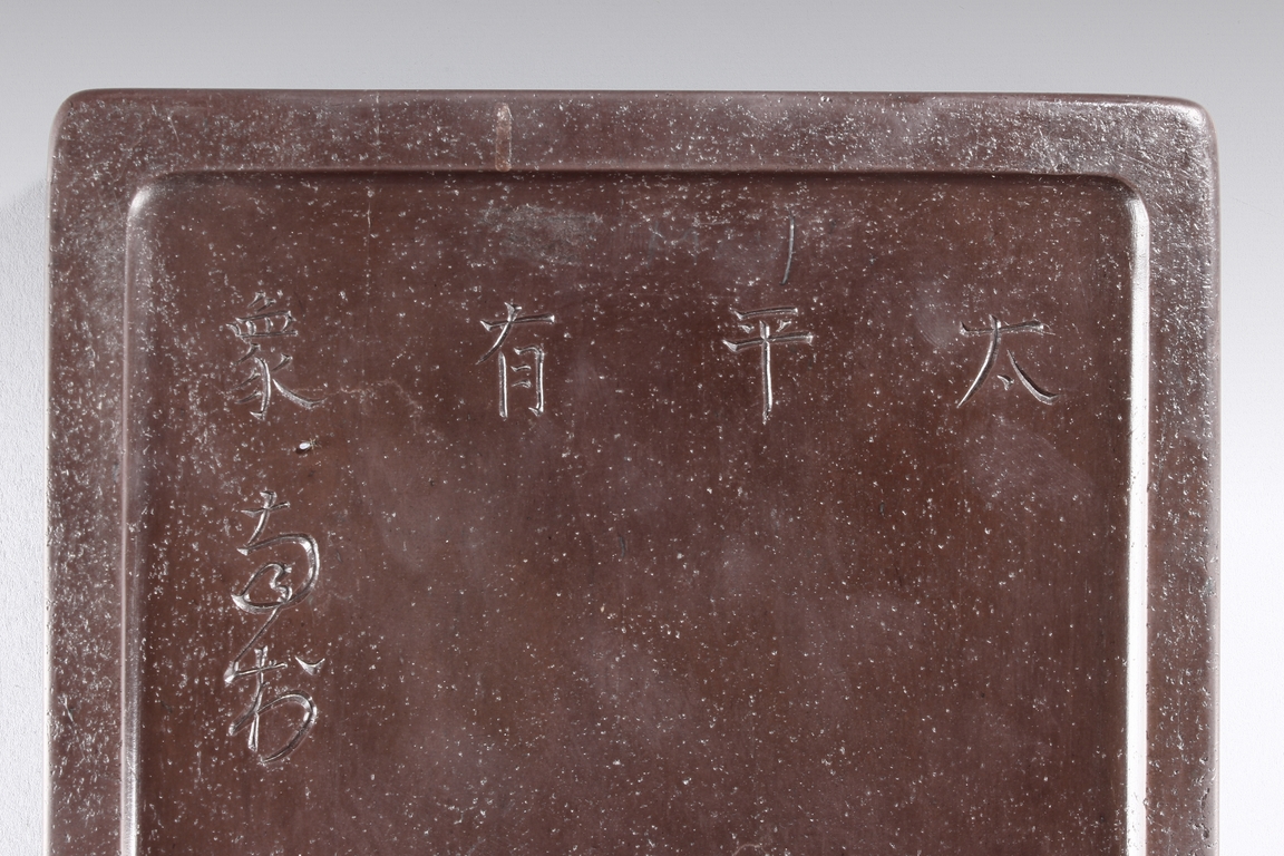 The rectangular ink stone is carved and inscribed with four character 'Tai Ping You Xiang' and an elephant below on one side, and on the other side with baluster-shaped vase in relief as inkwell . The stone is of purplish-brown color. Qing Dyansty Period.