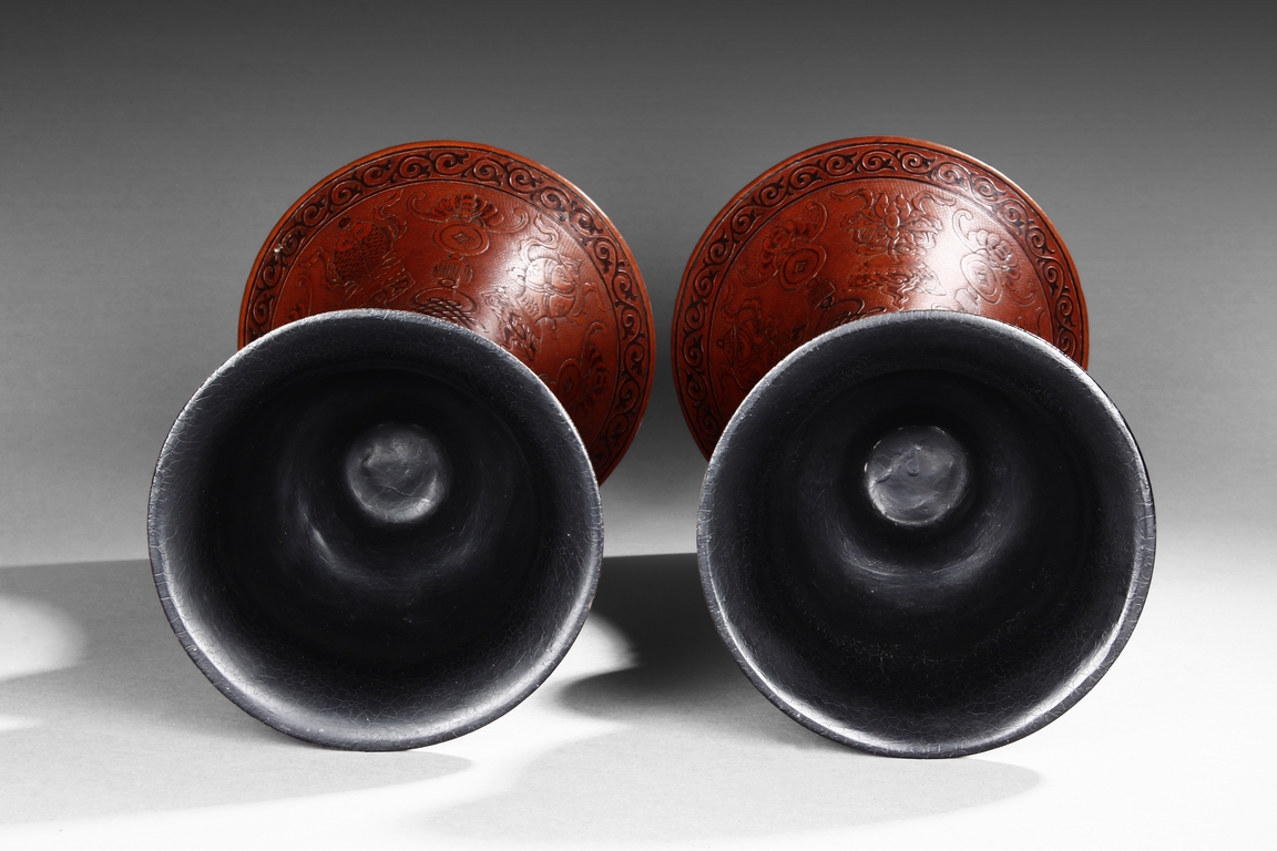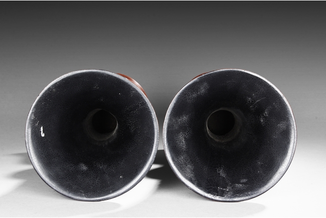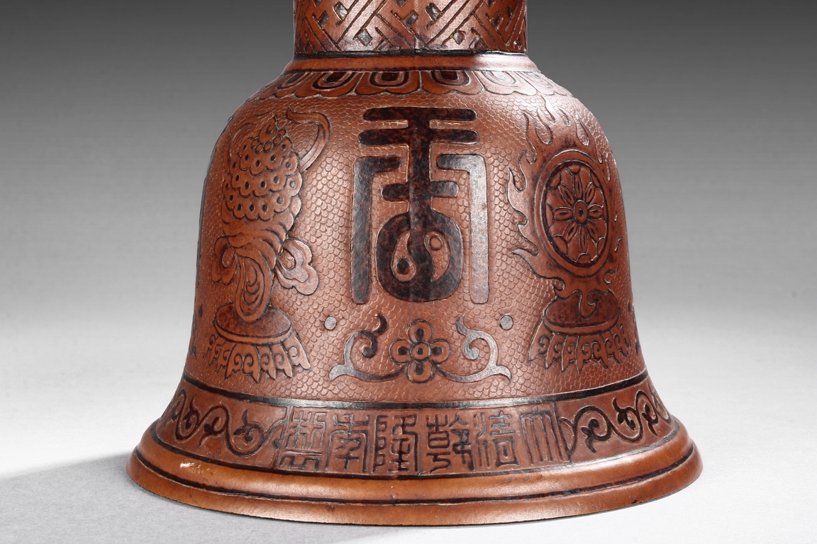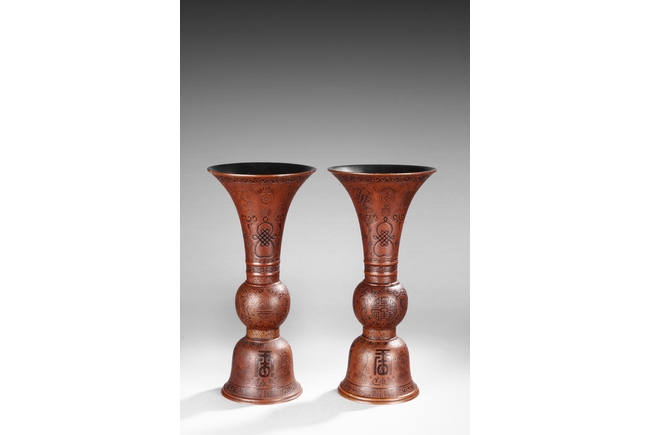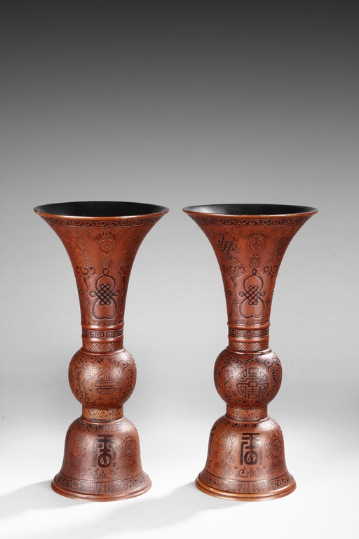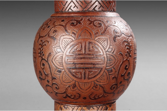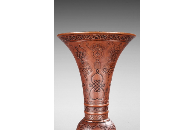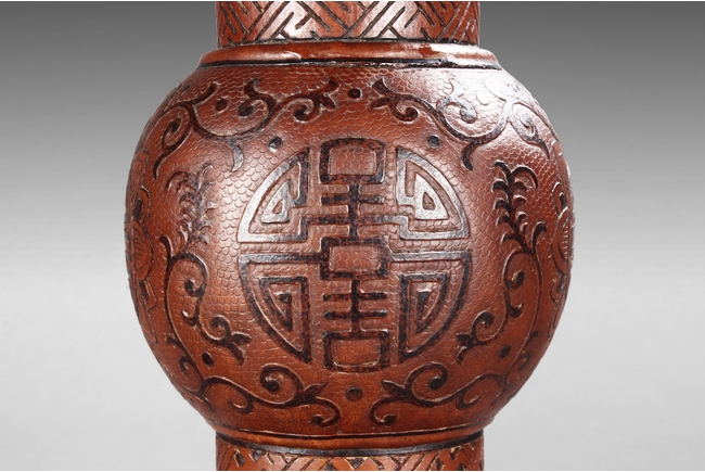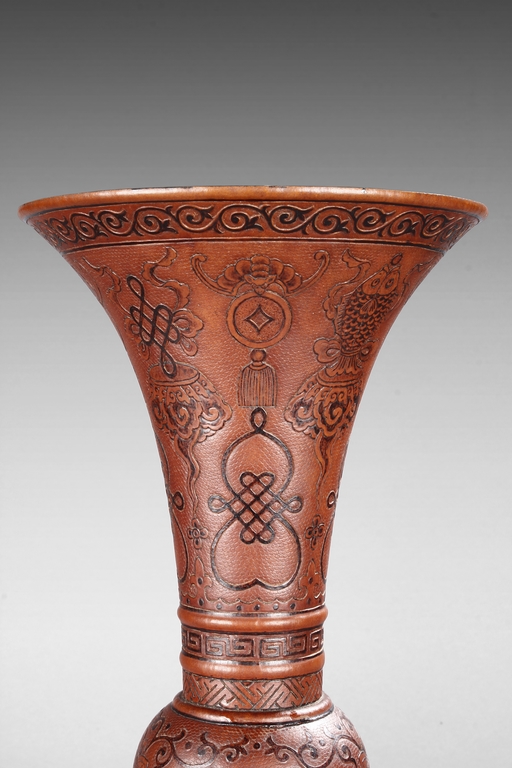 Made from double gourd, the huagu vases with wide and flaring rim, the neck tapering and waisted neck decorated with scrolling vine patterns on top and key-fret patterns on bottom, with eight auspicious treasures in between. The globular body decorated with four 'Shou' character enclosed in floral patterns, the remainder with vines. The bell shaped base decorated with alternating Chinese character and auspicious items, with mark "DAQING QIANLONG NIANZHI" at bottom. Qing Dyansty Period.