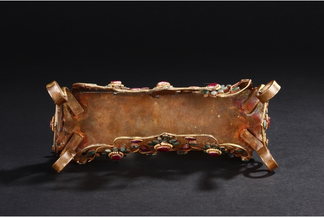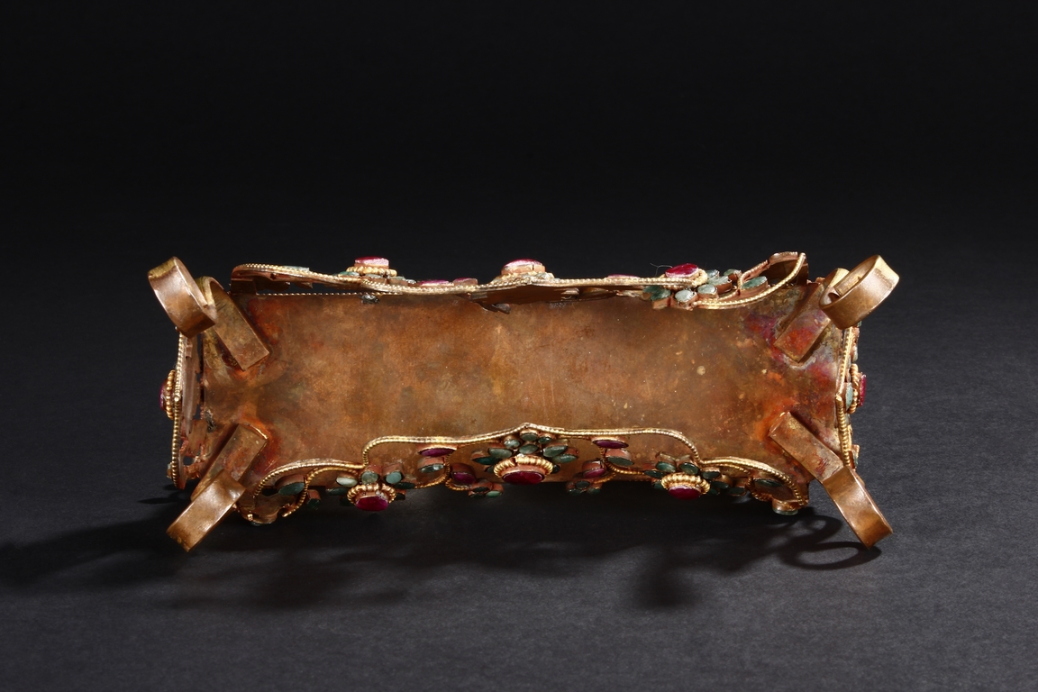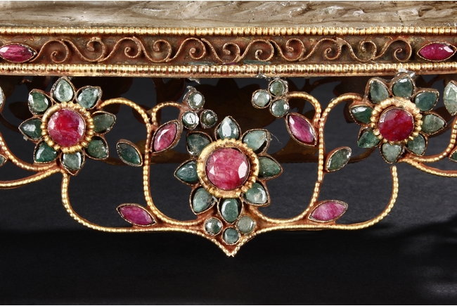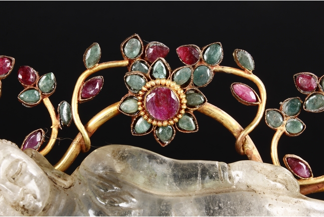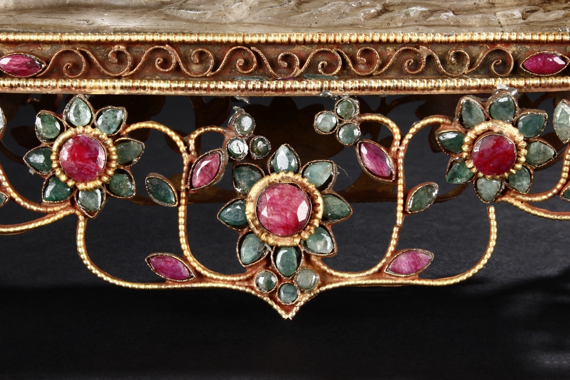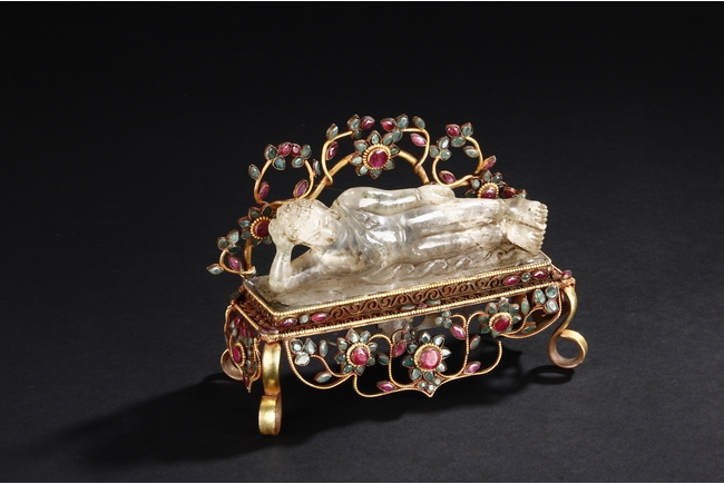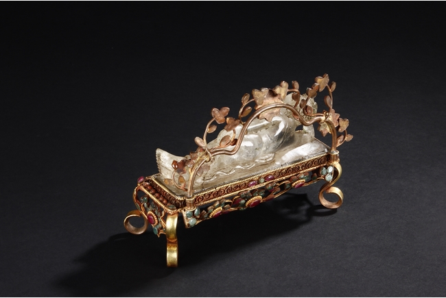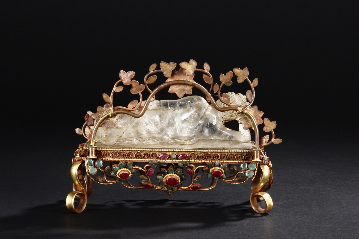 The Reclining Buddha made from crystal, laying on top of a beautifully crafted gilt bronze stand, supported by four curled feet, decorated by ruby, blue tourmaline, and pink tourmaline into flowers and leaves. Qing Dynasty period.