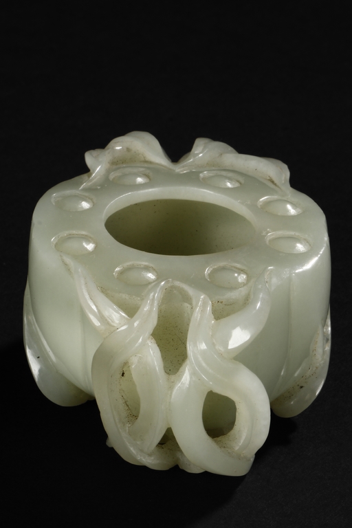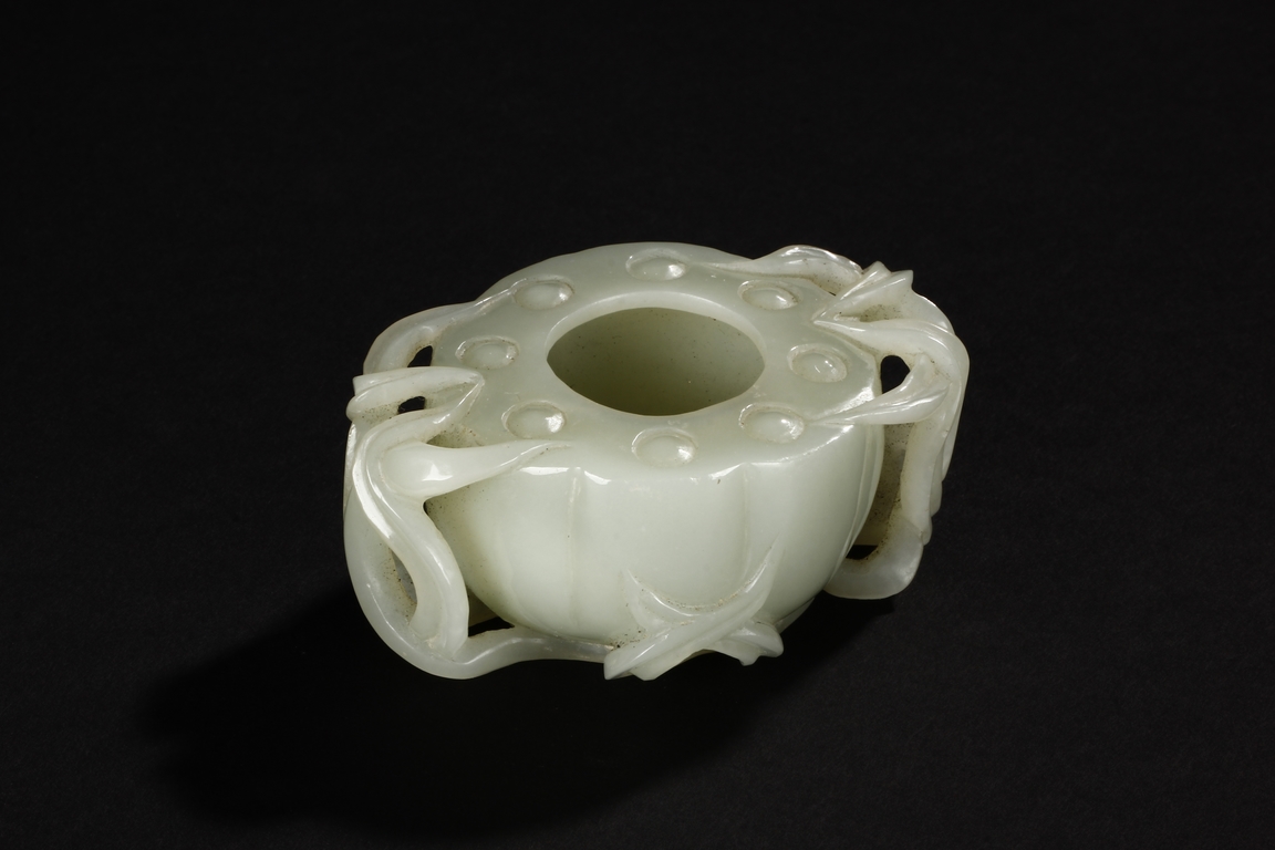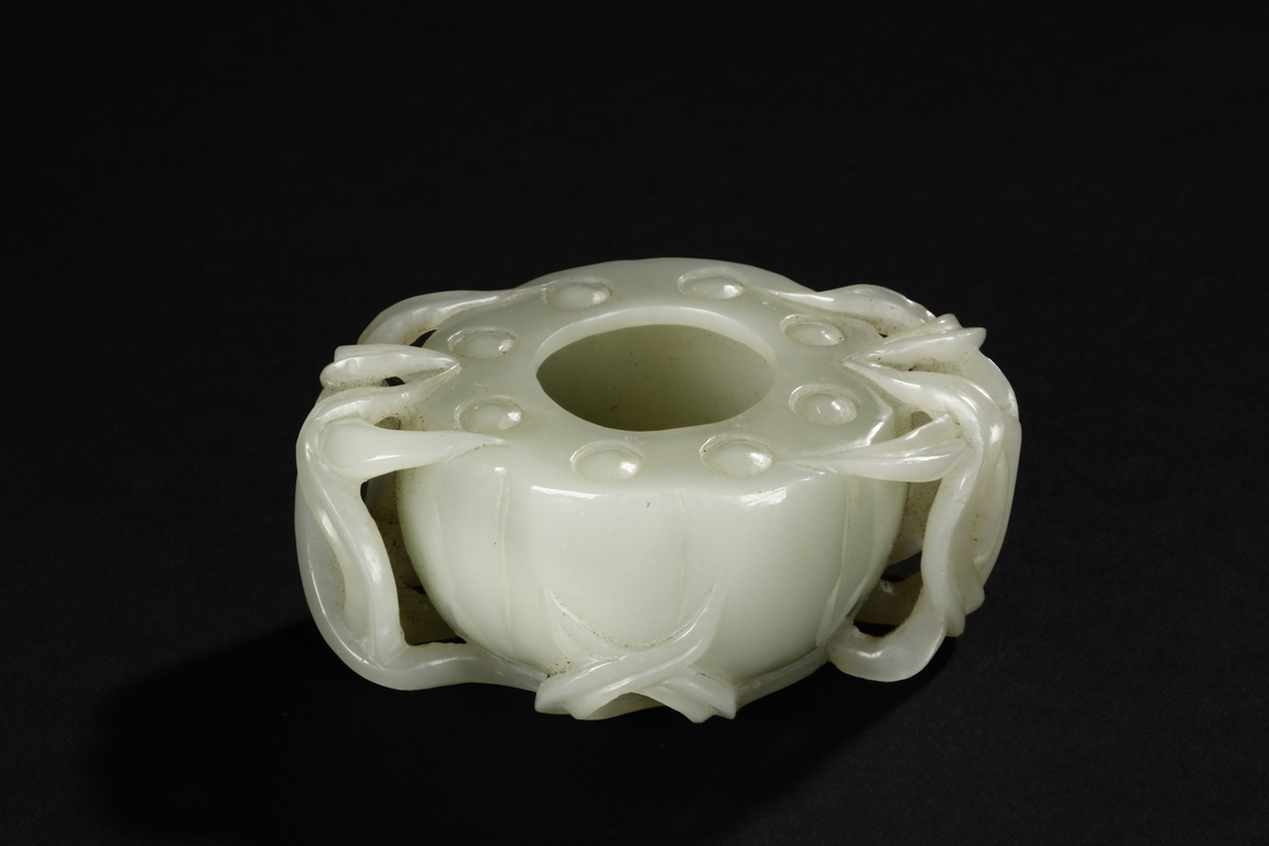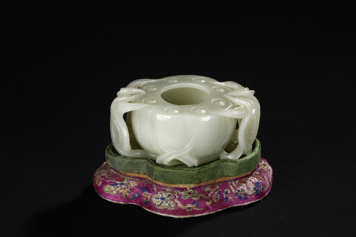 The water pot carved in the form of lotus flower pod, with the rim still has lotus seeds, leaves on the side acting as handles, vines on the bottom, supported by a stitched cloth stand, the stone of celadon white. Early republic period.