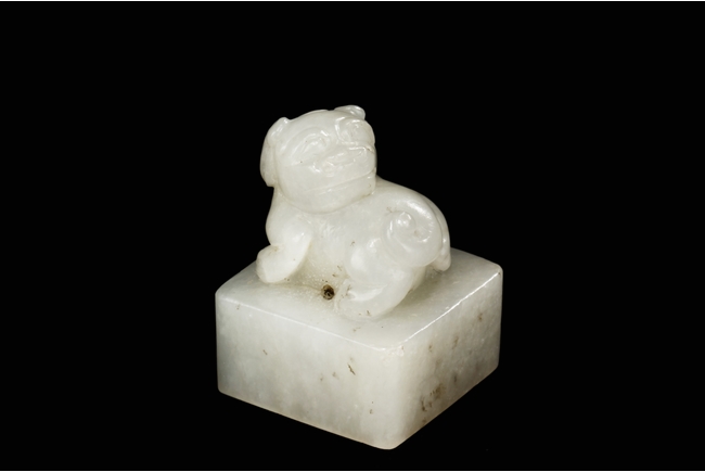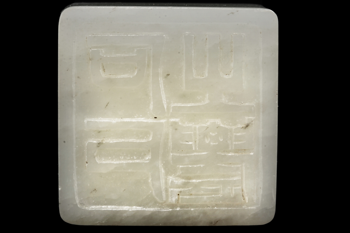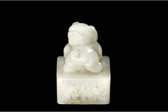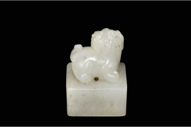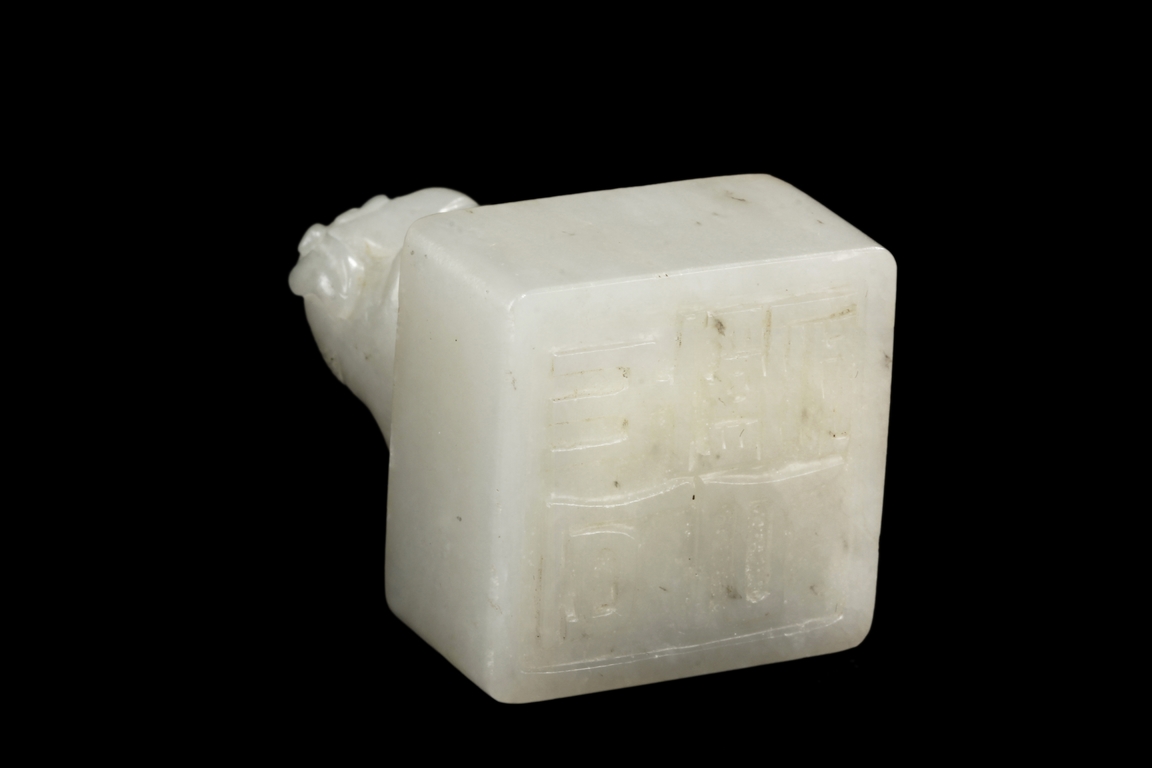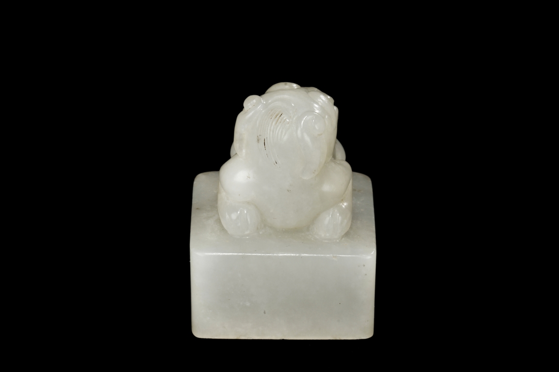 The seal stamp is of square form, with a lion cub mounted on top, head turned towards the back. A stringing hole is between the lion cub and the square base, and bottom carved with four Chinese characters mark. Qing Dynasty period.