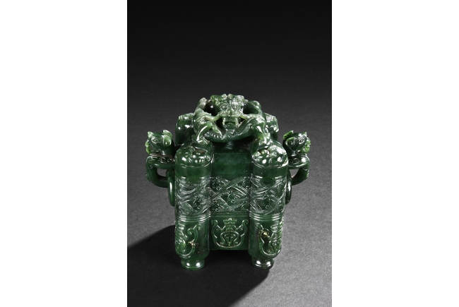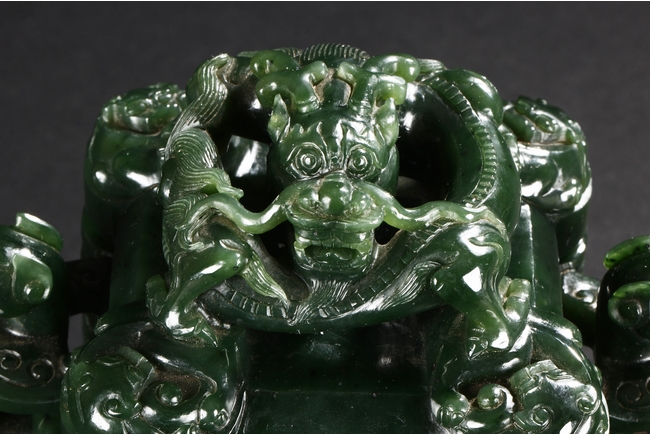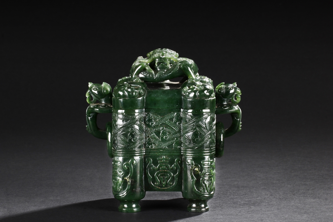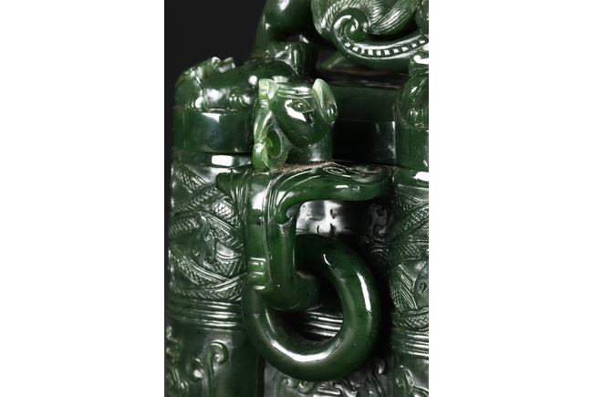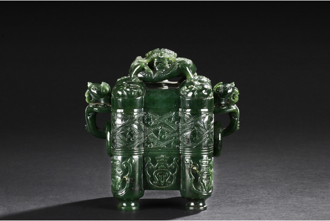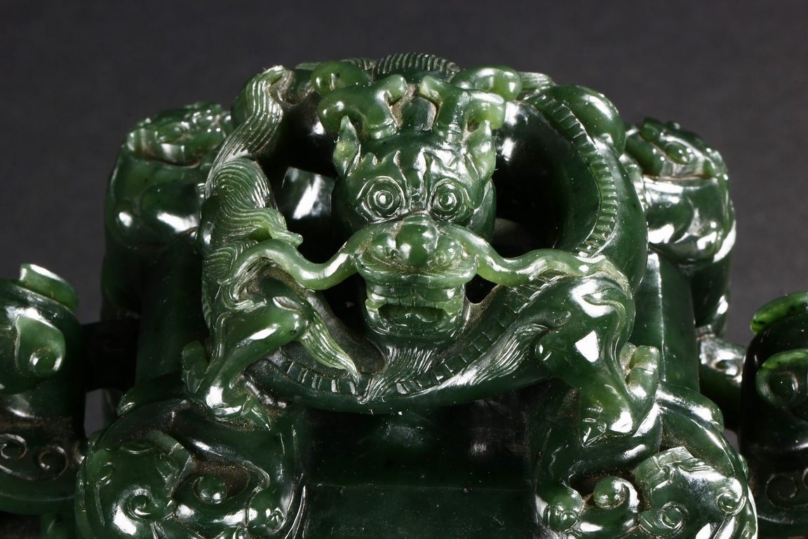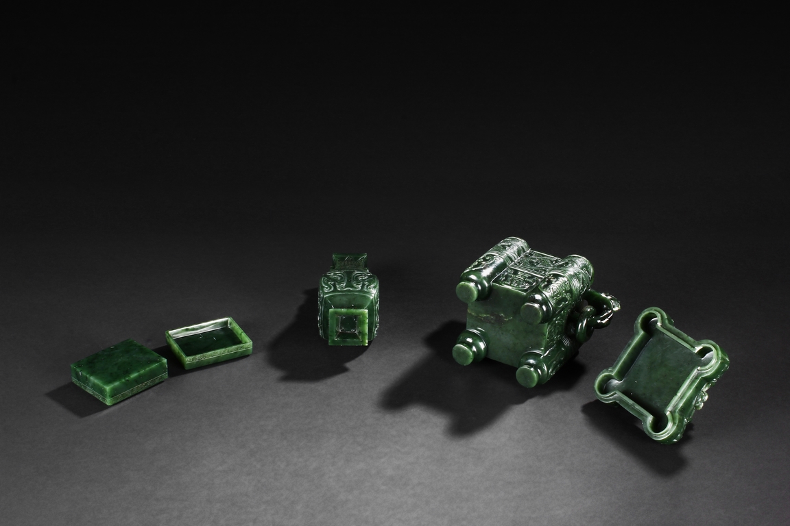 此碧玉雕三式,雕工精細,刀工流暢,用料講究,為收藏者所愛 A similar spinach jade garniture set is included in the online archive of Palace Museum Beijing and illustrated in Zhang, W.G Gugong Bowuyuan Cang Wenwu Zhenpin Daxi: Yuqi Xia Shanghai, 2008 p.15. 來源:美國達拉斯藏家