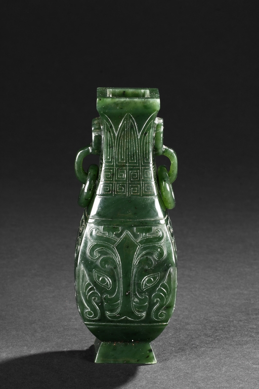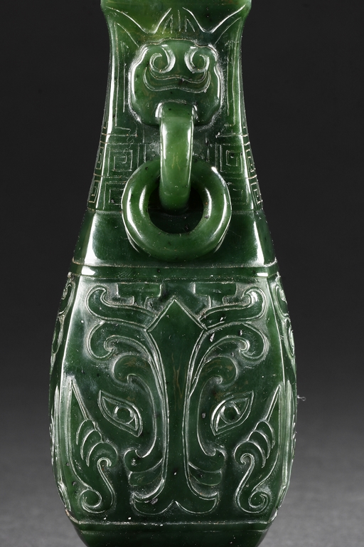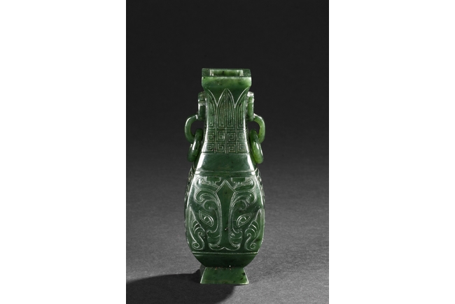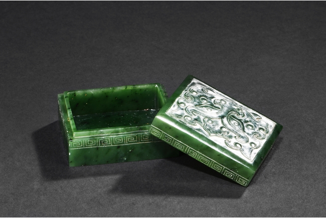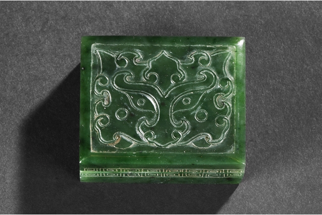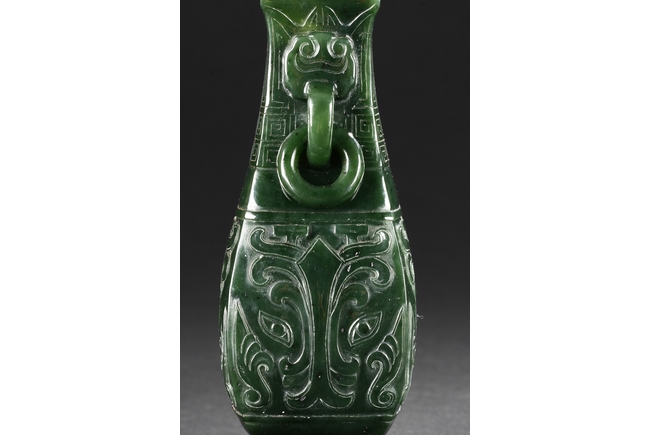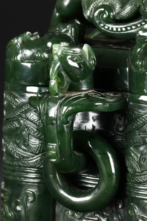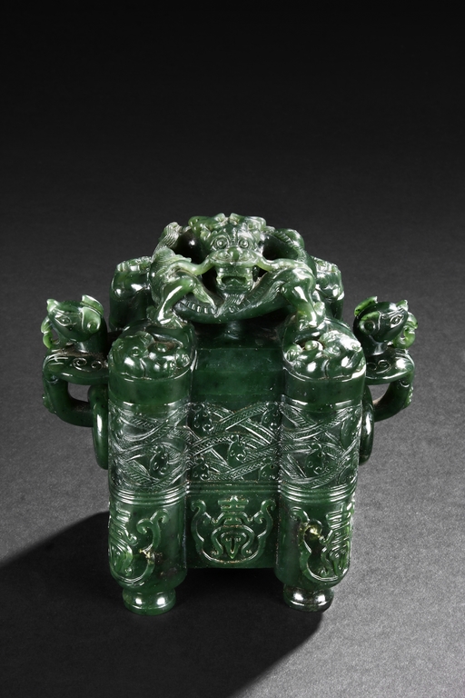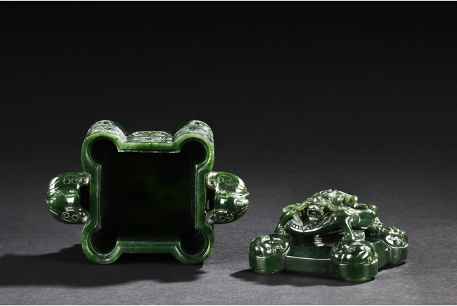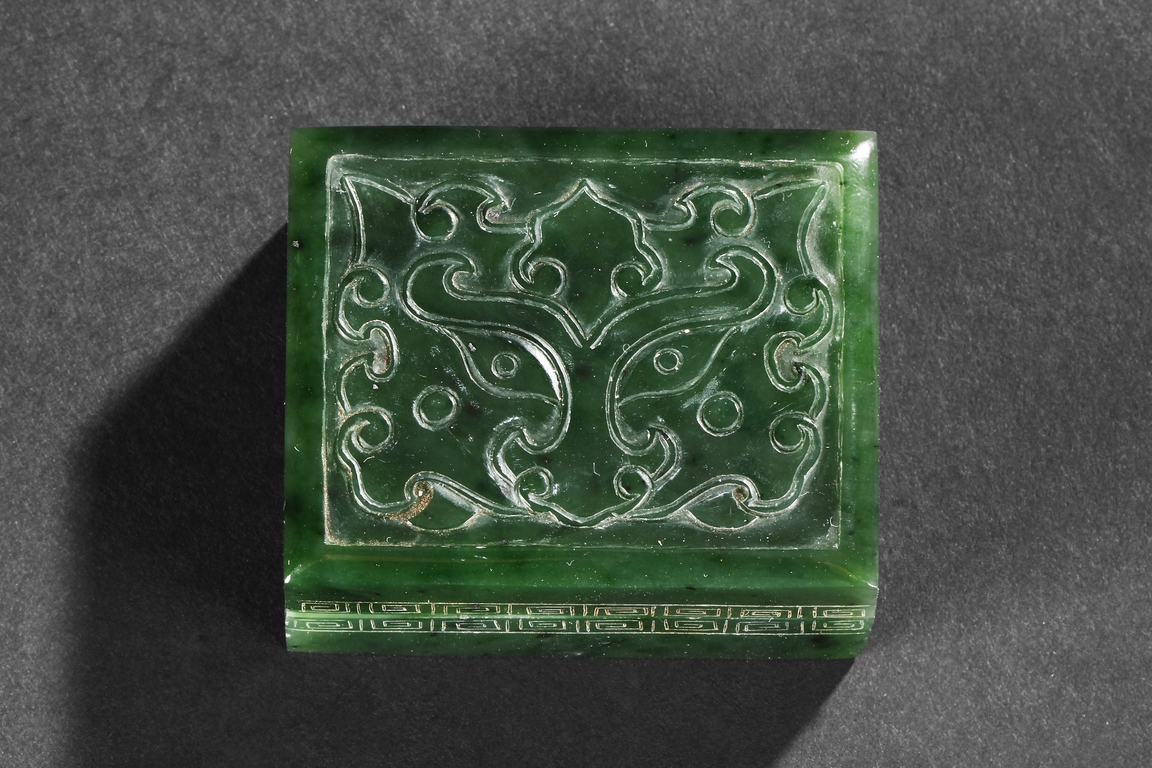 此碧玉雕三式,雕工精細,刀工流暢,用料講究,為收藏者所愛 A similar spinach jade garniture set is included in the online archive of Palace Museum Beijing and illustrated in Zhang, W.G Gugong Bowuyuan Cang Wenwu Zhenpin Daxi: Yuqi Xia Shanghai, 2008 p.15. 來源:美國達拉斯藏家