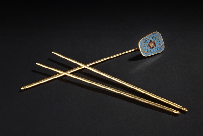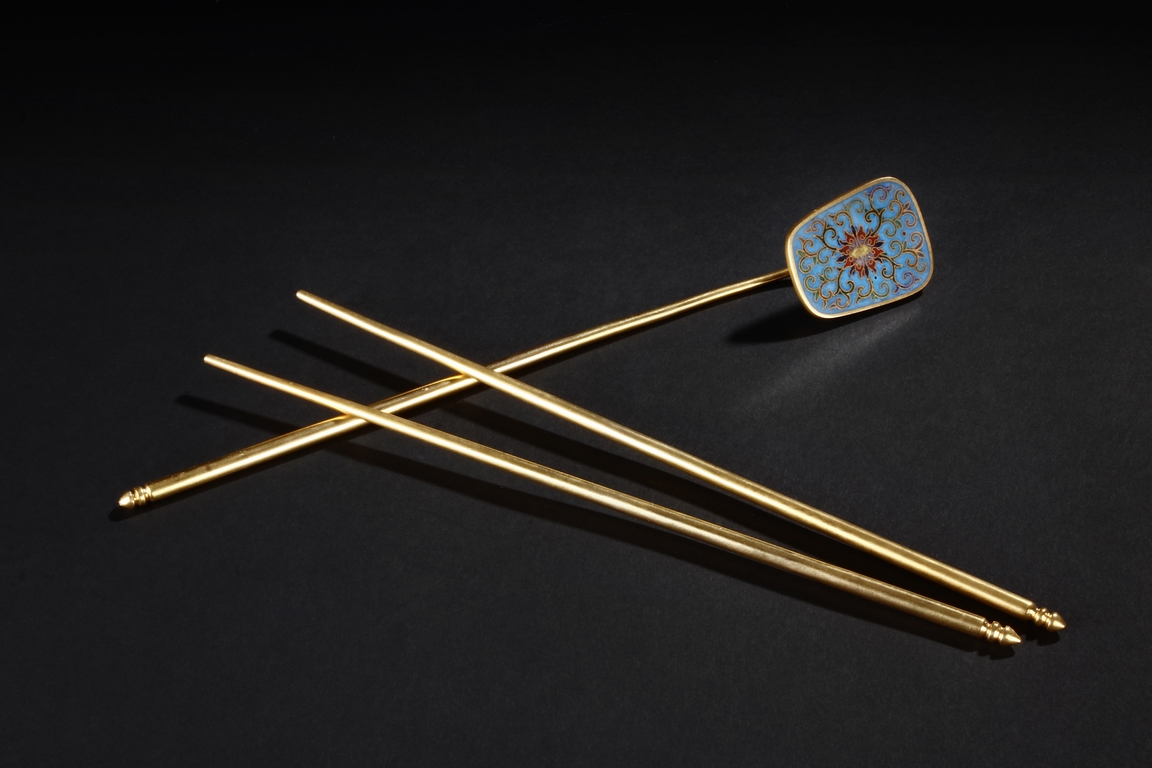 The garniture set includes a small box with cover, a censer with cover, a small vase, a pair of gilt bronze incense sticks, and a cloisonne incense spoon. The small box is of rectangular form, the lid carved with taotie mask, and the sides carved with key-fret patterns. The vase is in the form of archaic bronze. Qing Dynasty Period.