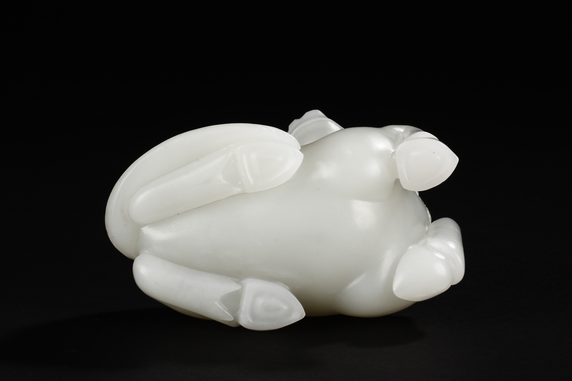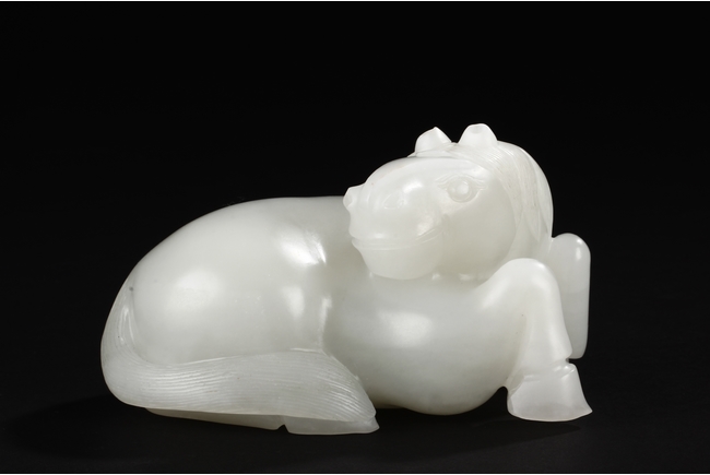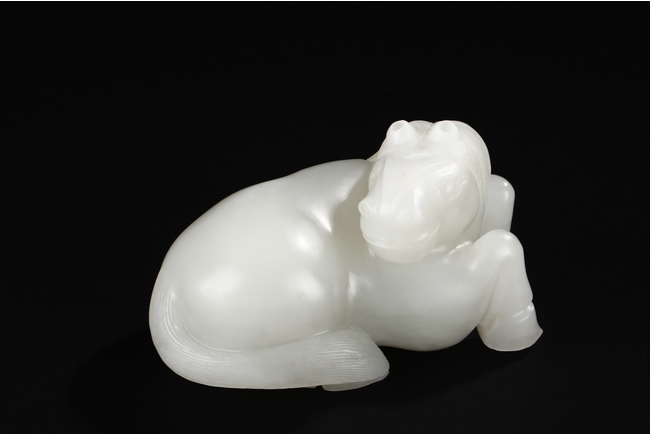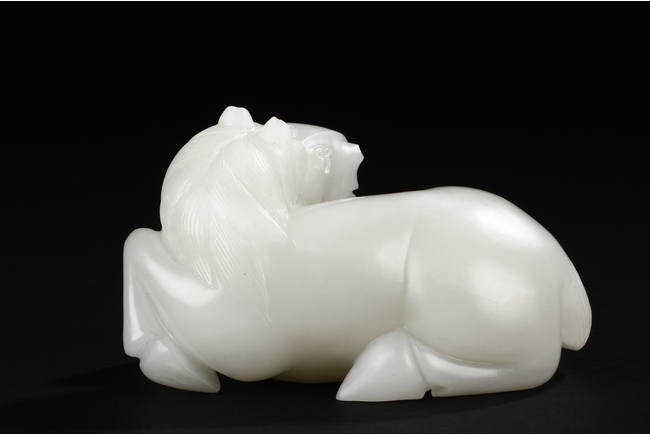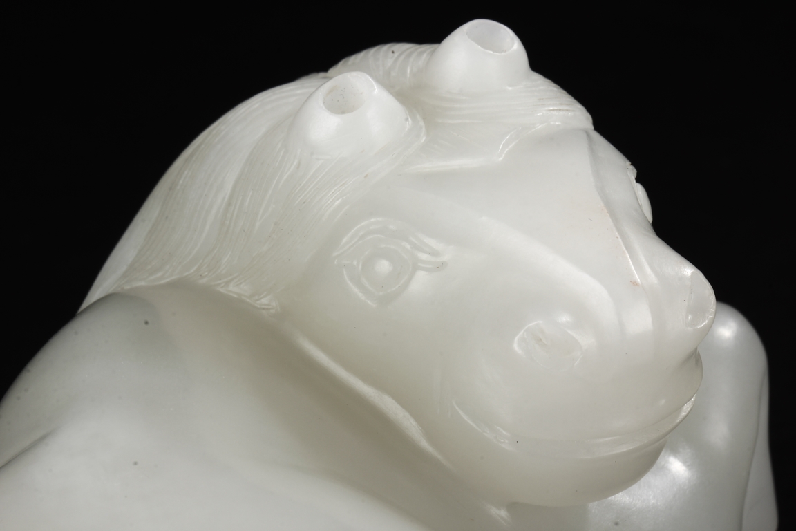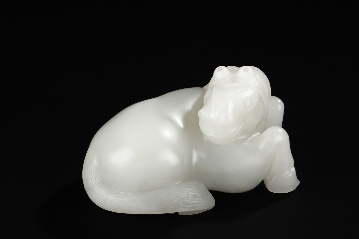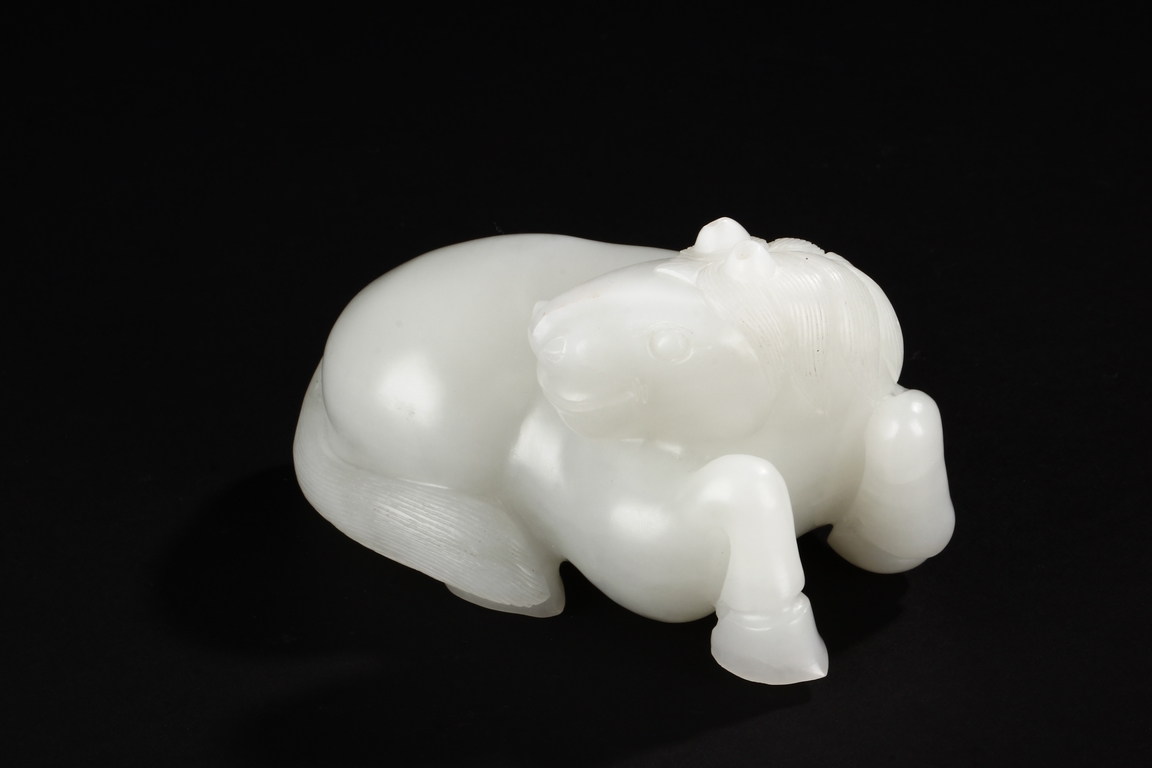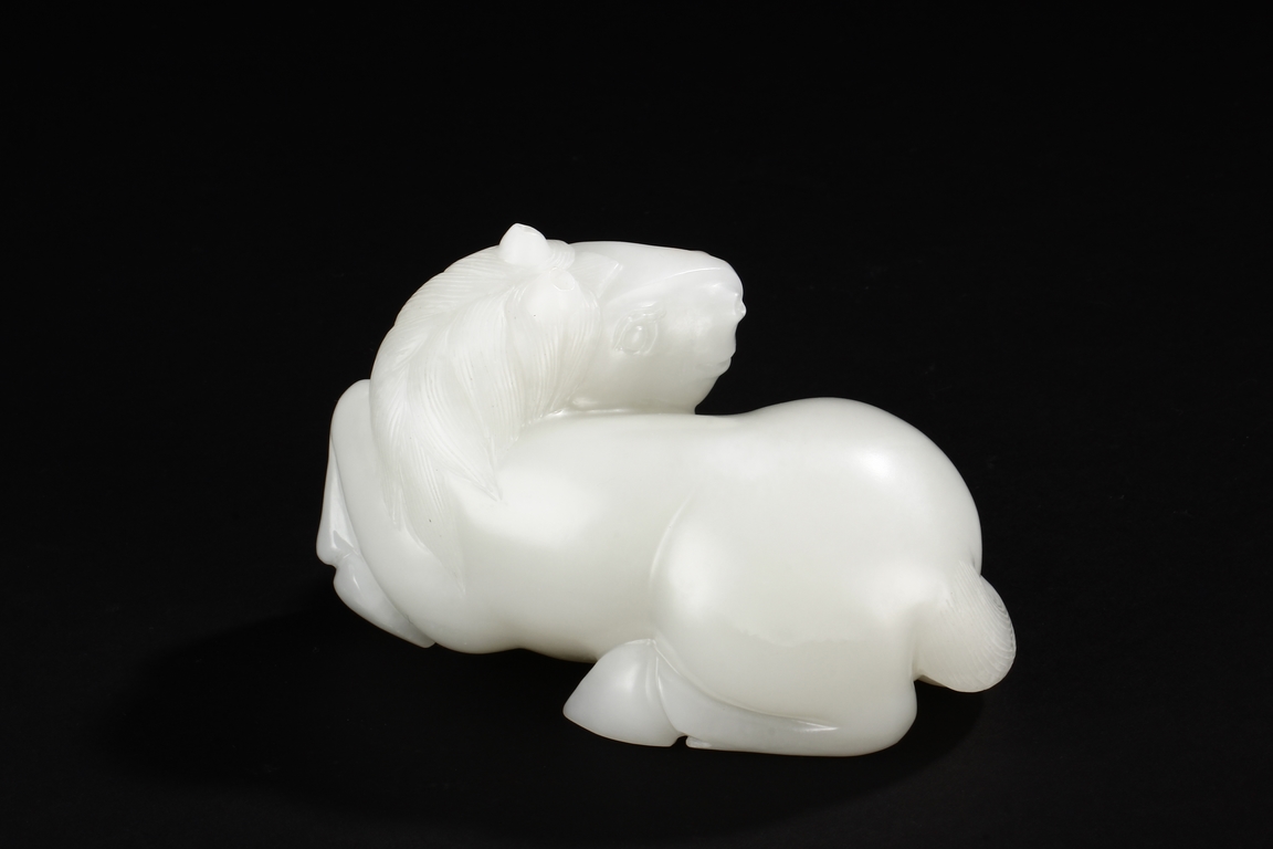 The horse is carved in a recumbent position with head turning back on one direction and four legs tucked under the body. Its mane falling on either side of neck and delicately incised to show the details. The stone is of even white tone. 20th Century