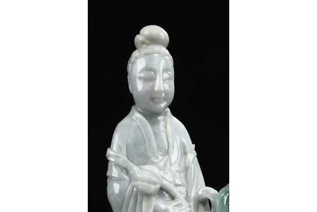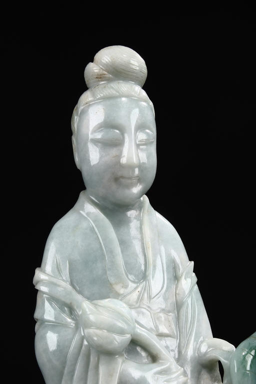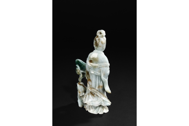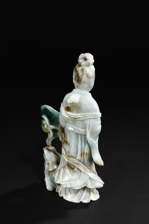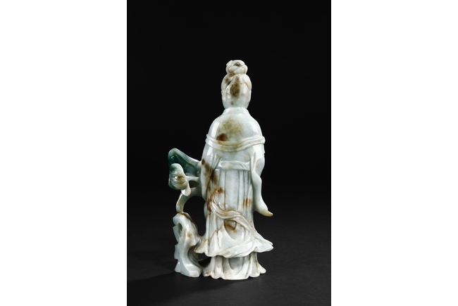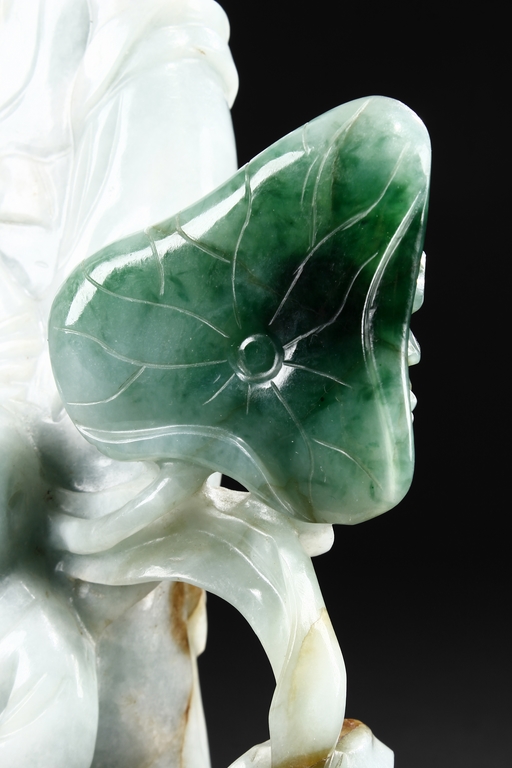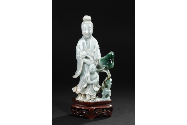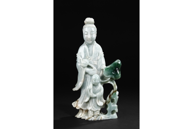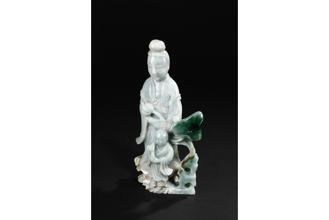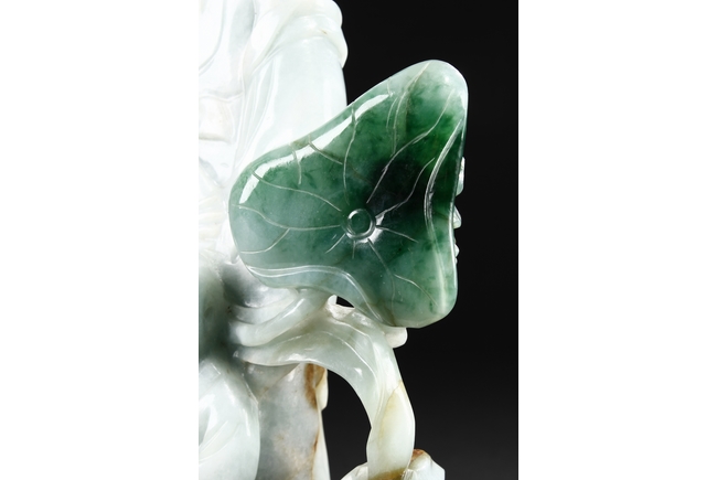 Cleverly carved, the jadeite carving is mostly of white color with a hint of green, with slight russet and a patch of green at the lotus leaf. The Guanyin stands behind a young boy, holding a lotus flower while the boy holding a lotus leaf. Qing Dynasty Period.