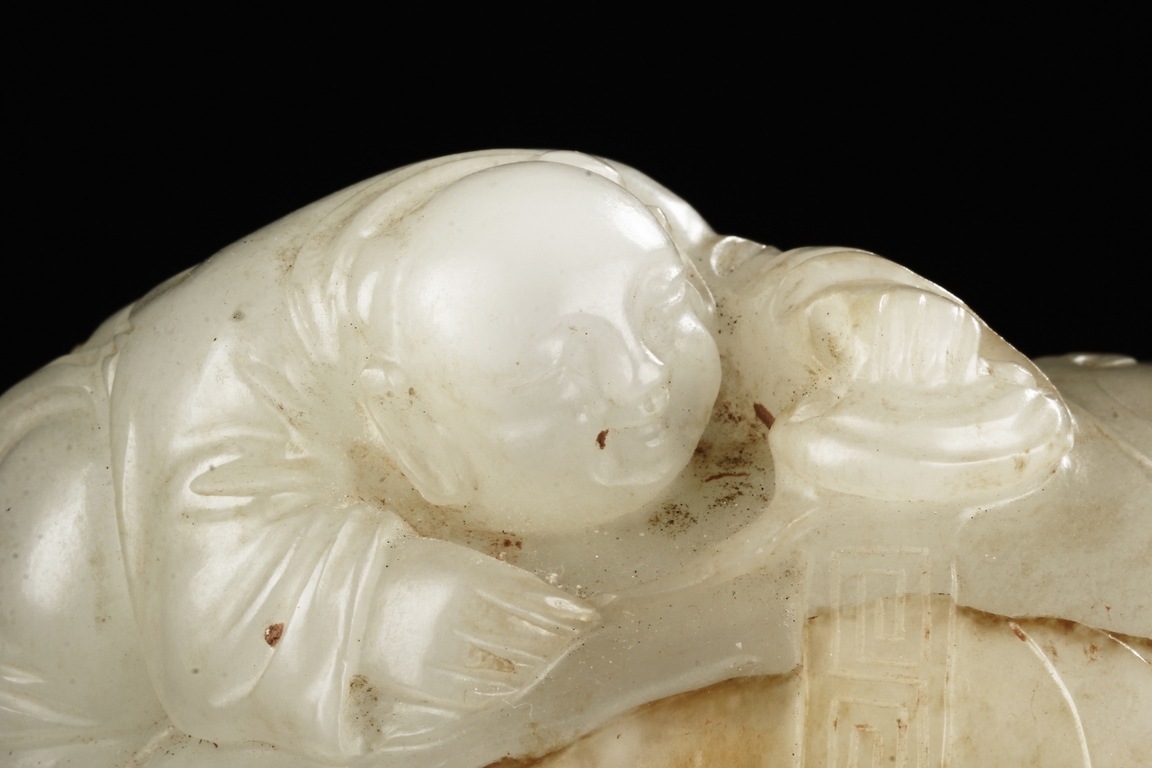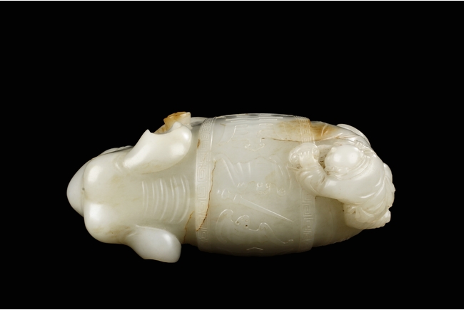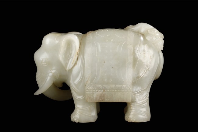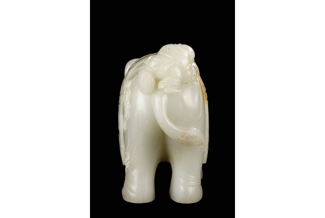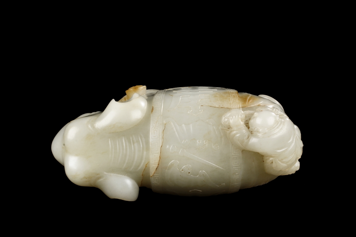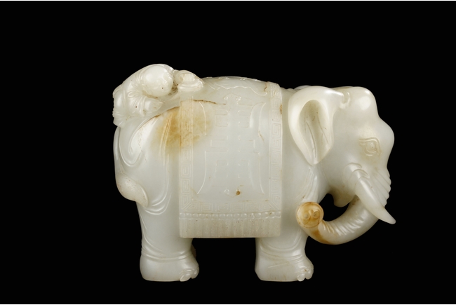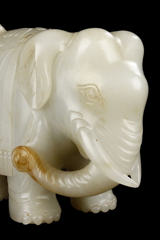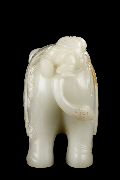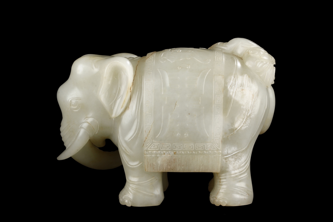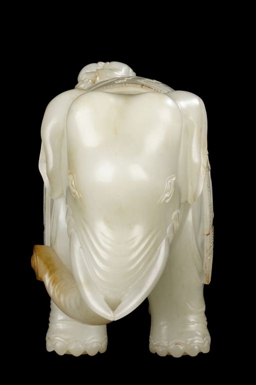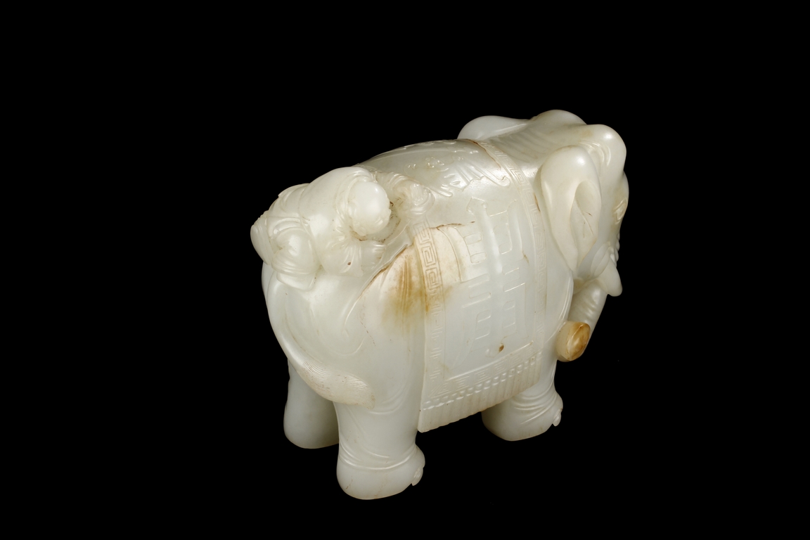 The carving of elephant symbolizes the Chinese idiom "Tai Ping You Xiang", resembling peace. The elephant is standing with four feet on the ground, the trunk turned backwards to the right side, carrying a decorated carpet with key-fret patterns, 'shou' character, flying bats, and other auspicious items, with a child clinging to its back. The stone of smooth white color with slight russet. Qing dynasty period.