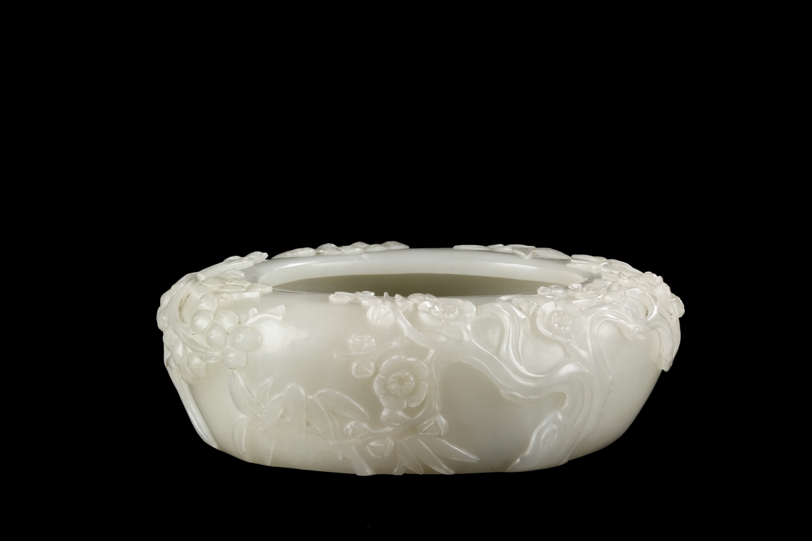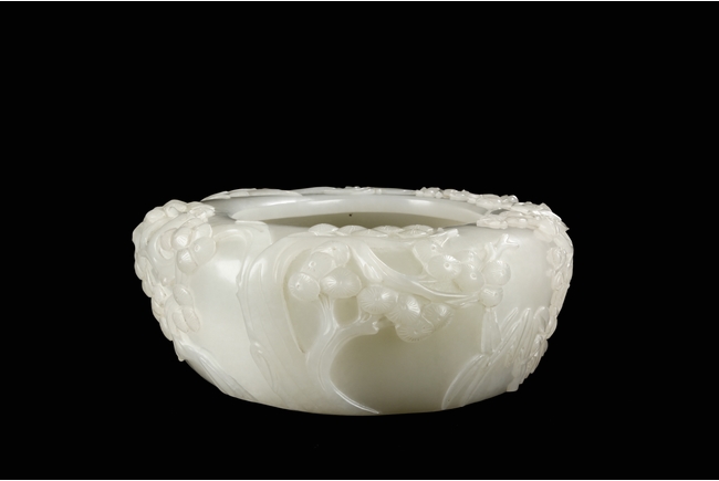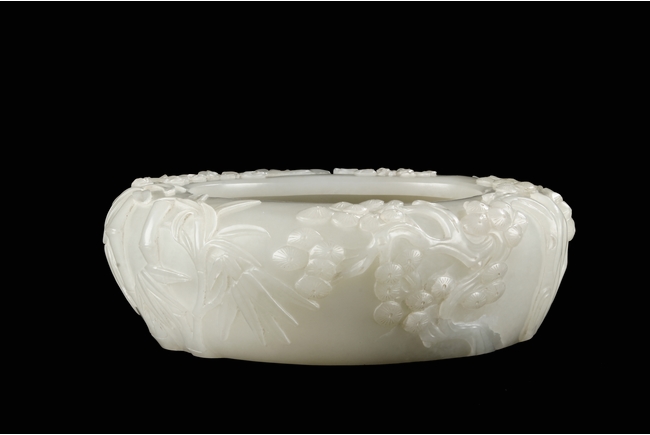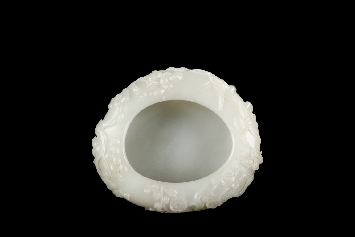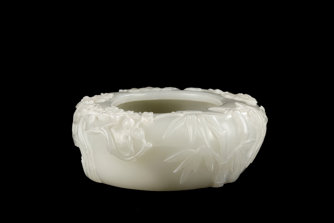 Of flattened ovoid form, the shallow washer's exterior carved with the 'Three Friends of Winter', or pine, bamboo, and plum, symbolizing steadfastness, perseverance, and resilience. The stone of smooth white color with slight translucency. Bottom bears four character "QIANLONG NIANZHI" mark. 20th Century.