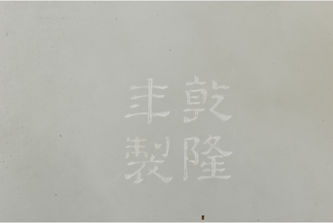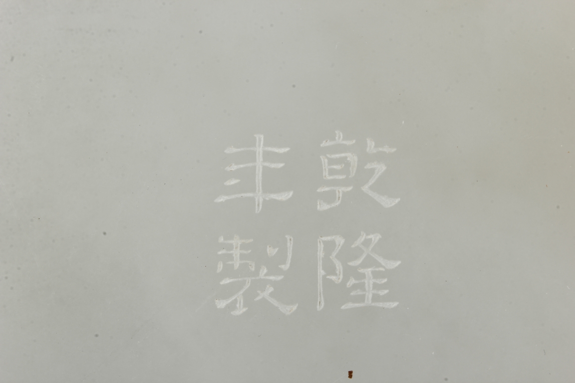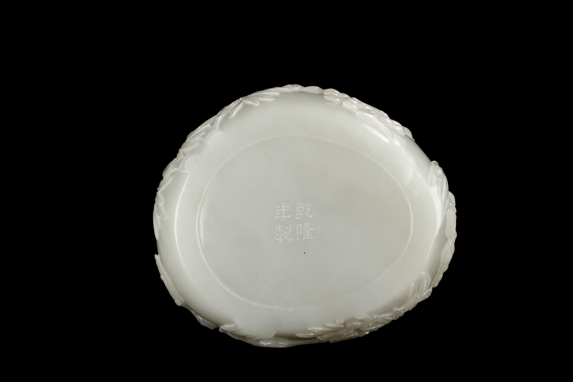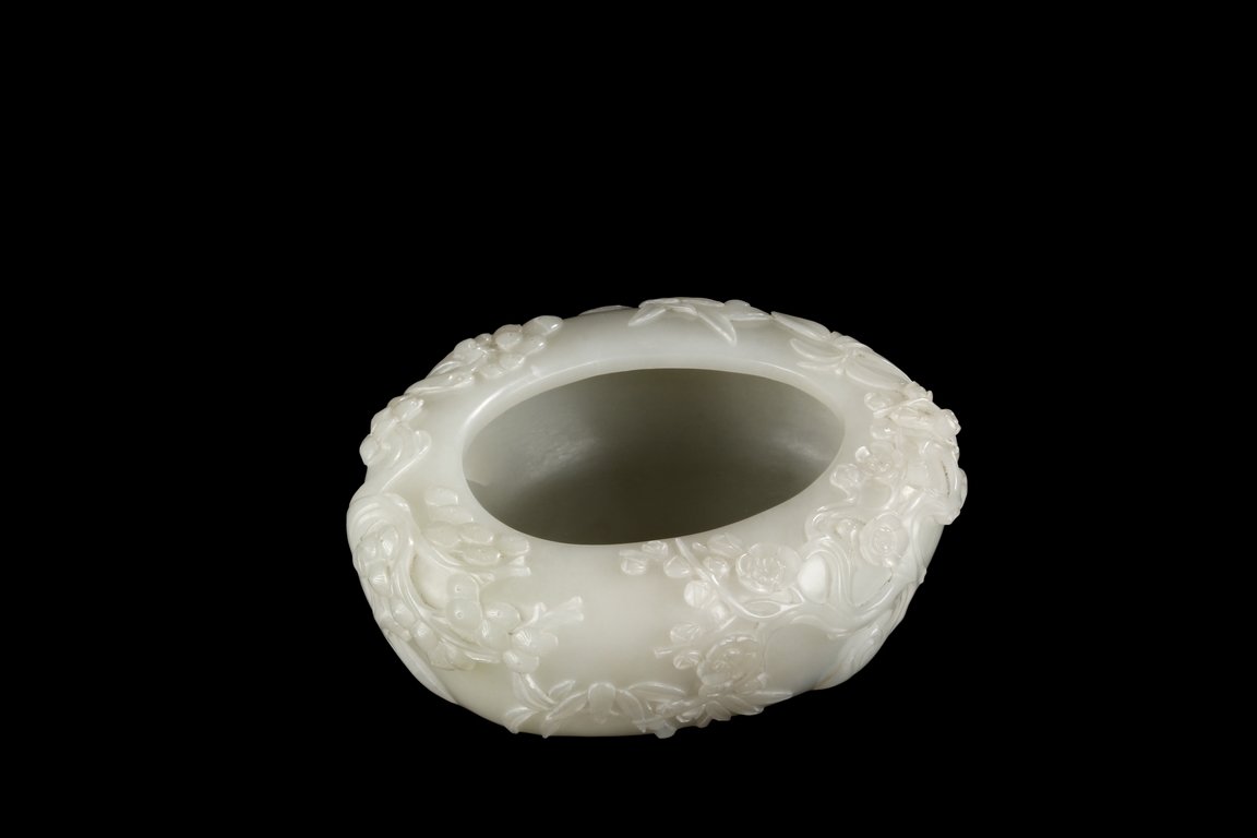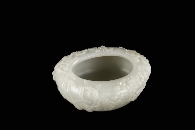 Of flattened ovoid form, the shallow washer's exterior carved with the 'Three Friends of Winter', or pine, bamboo, and plum, symbolizing steadfastness, perseverance, and resilience. The stone of smooth white color with slight translucency. Bottom bears four character "QIANLONG NIANZHI" mark. 20th Century.