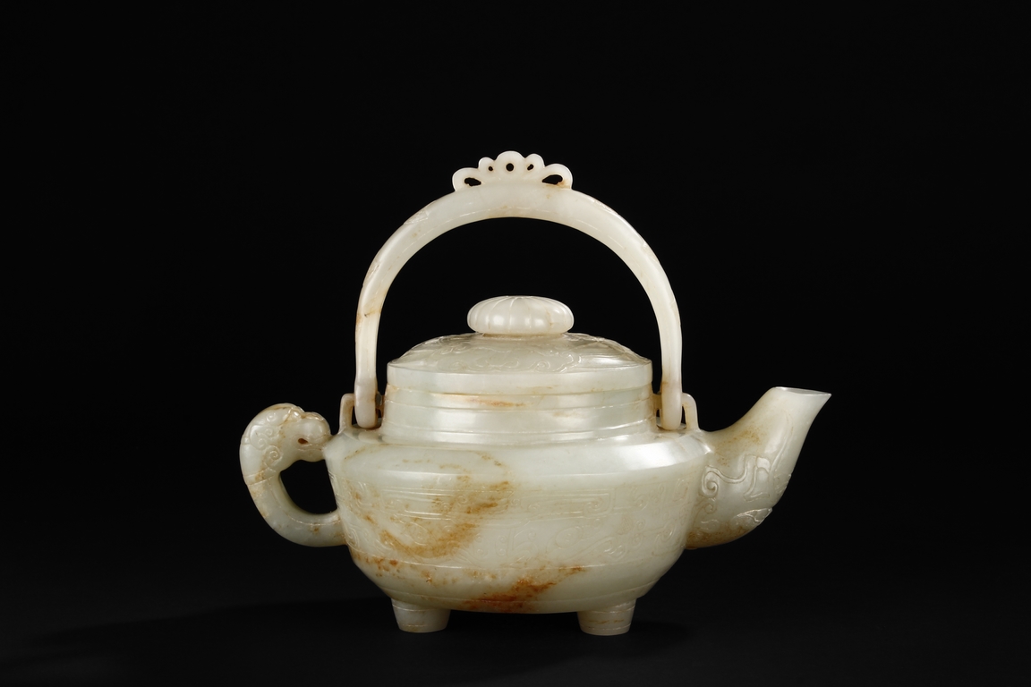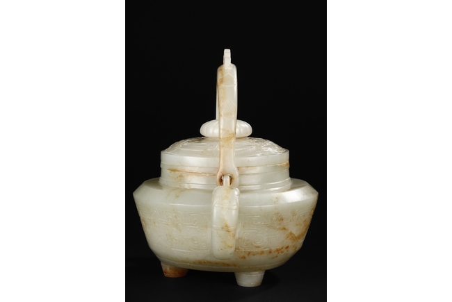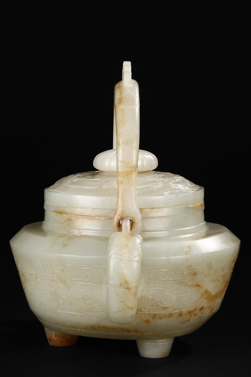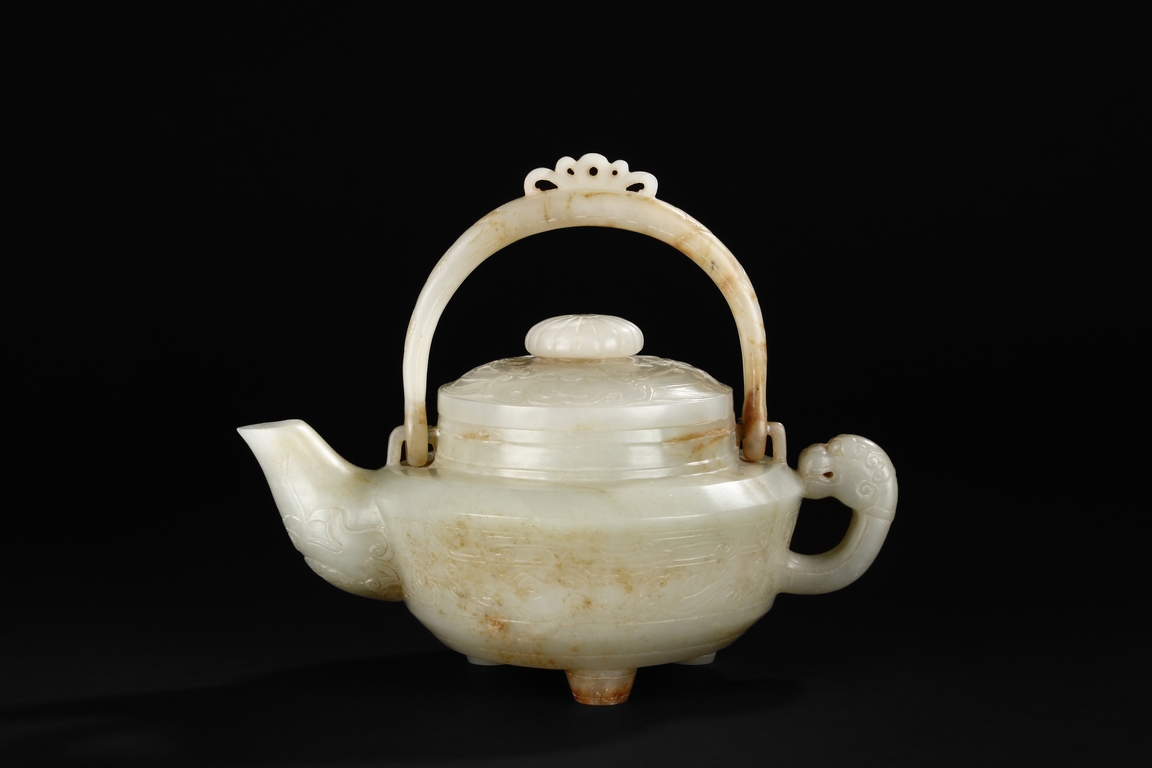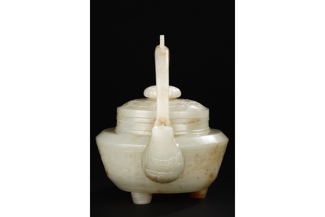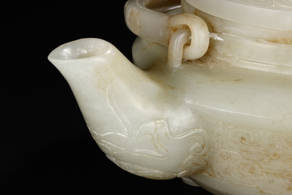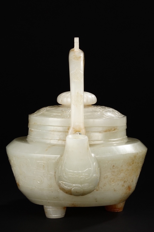 Supported by three short and tapering columnar feet, the body shaped similar to bowl, lightly carved with taotie masks on the sides, the handle carved in the form of mythical beast, the flat and wide shoulder attached with an arched handle, hanging over the cover carved with additional taotie masks and a flower bud finial. The stone of smooth white and slight russet. Republic period.