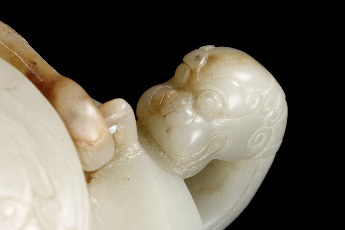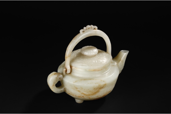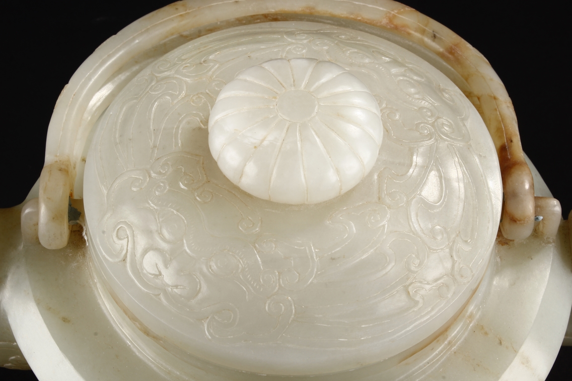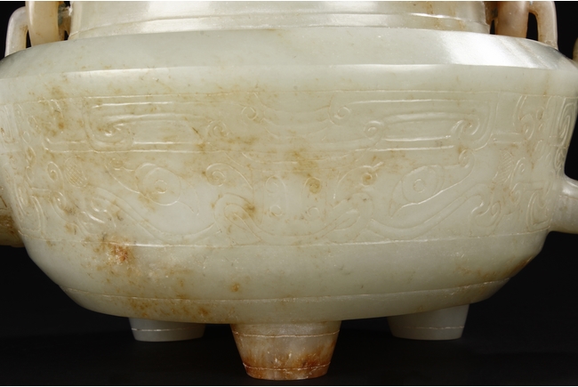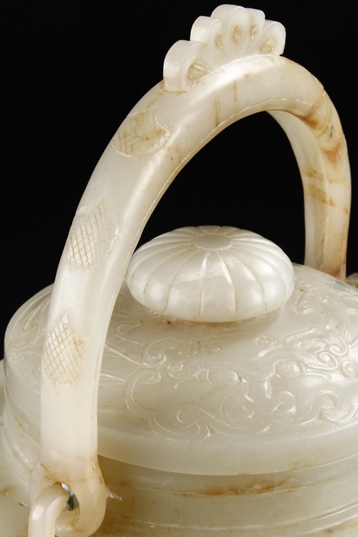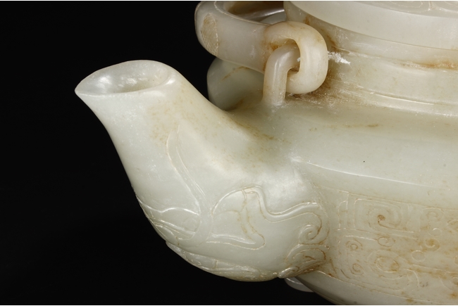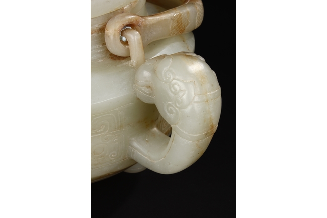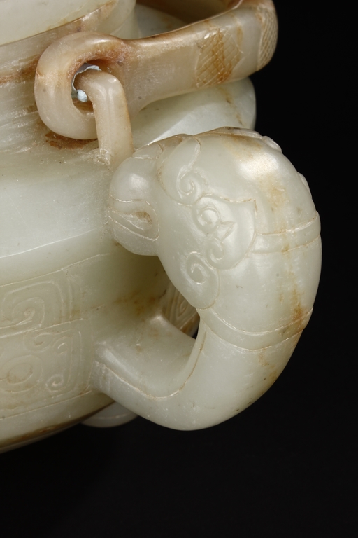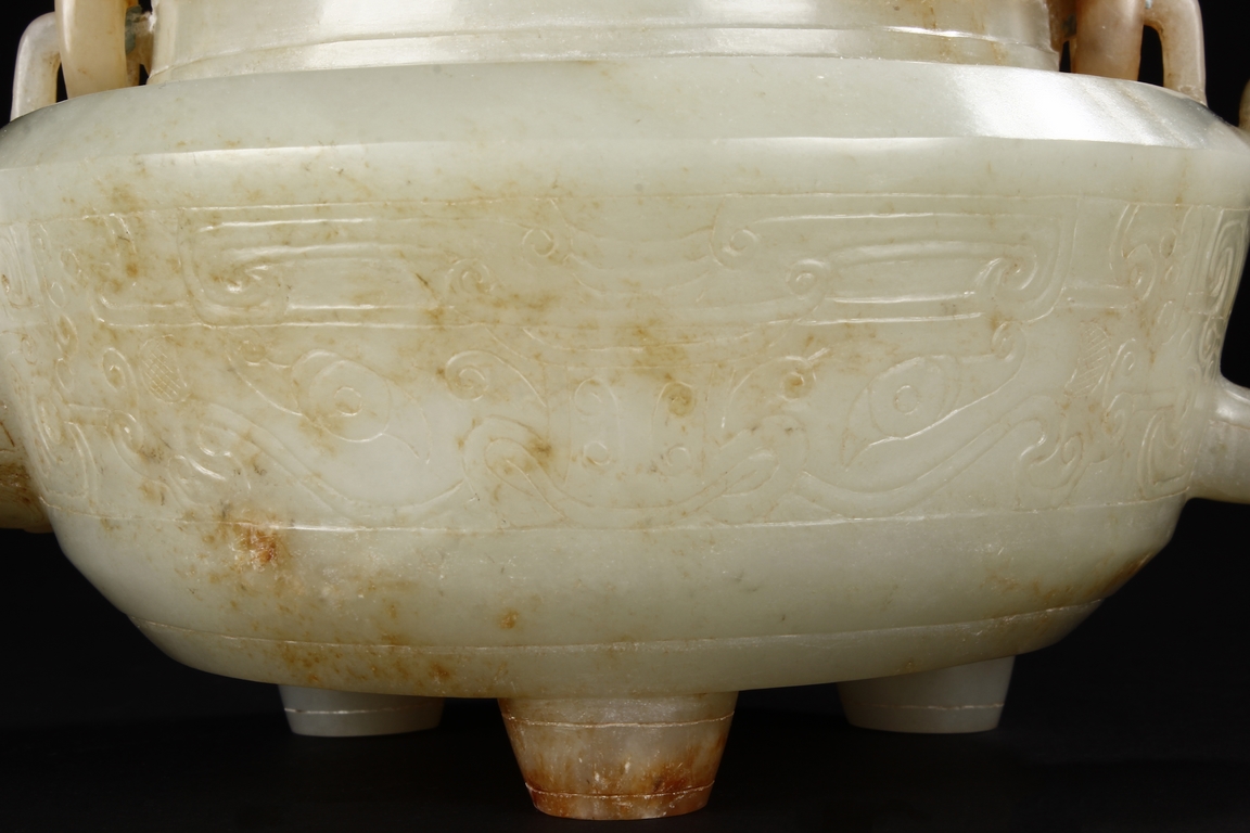 Supported by three short and tapering columnar feet, the body shaped similar to bowl, lightly carved with taotie masks on the sides, the handle carved in the form of mythical beast, the flat and wide shoulder attached with an arched handle, hanging over the cover carved with additional taotie masks and a flower bud finial. The stone of smooth white and slight russet. Republic period.