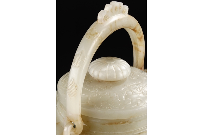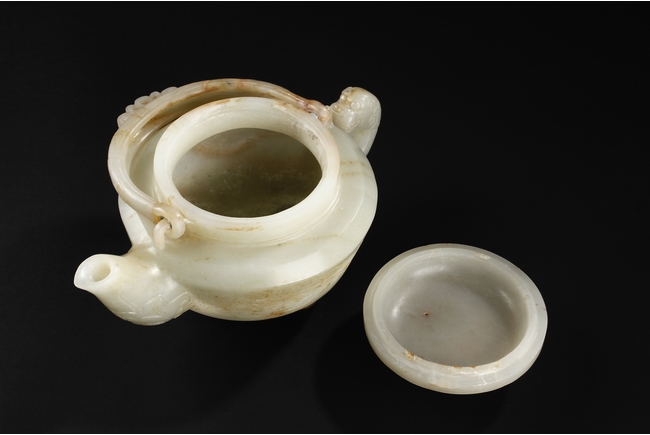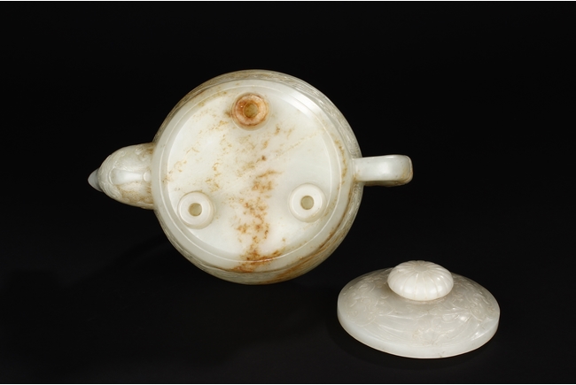 類似拍品請參考佳士得倫敦2008年11月9號拍品,及佳士得紐約2012年3月1884號拍品 Compare to a smaller white jade teapot without handle, sold in Christie’s London on November 4 2008 Lot 9, for £205,250, Also compare a smaller and celadon jade teapot, sold in Christie’s New York on March 2012 Lot 1884, for $110,500 來源:美國俄勒岡州華人著名藏家遠先生提供