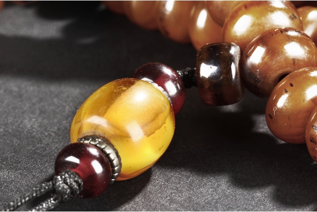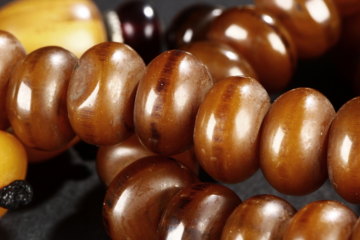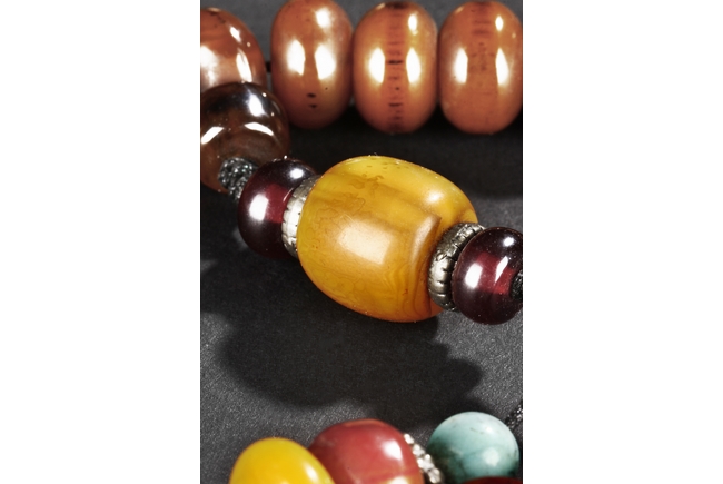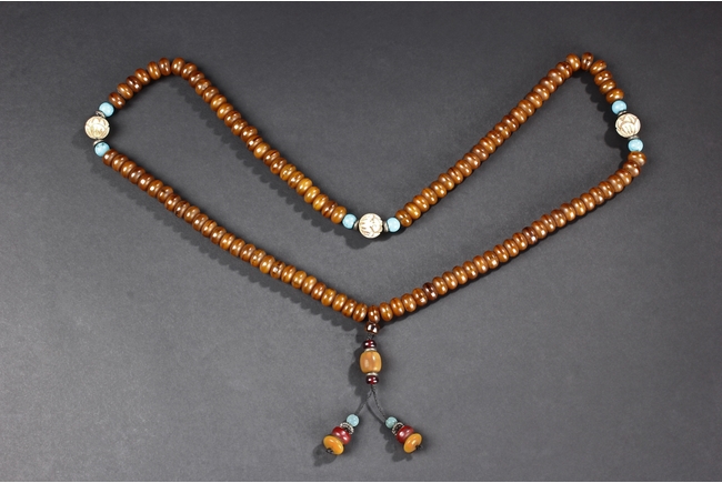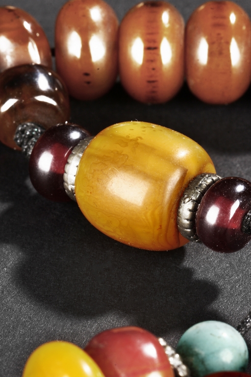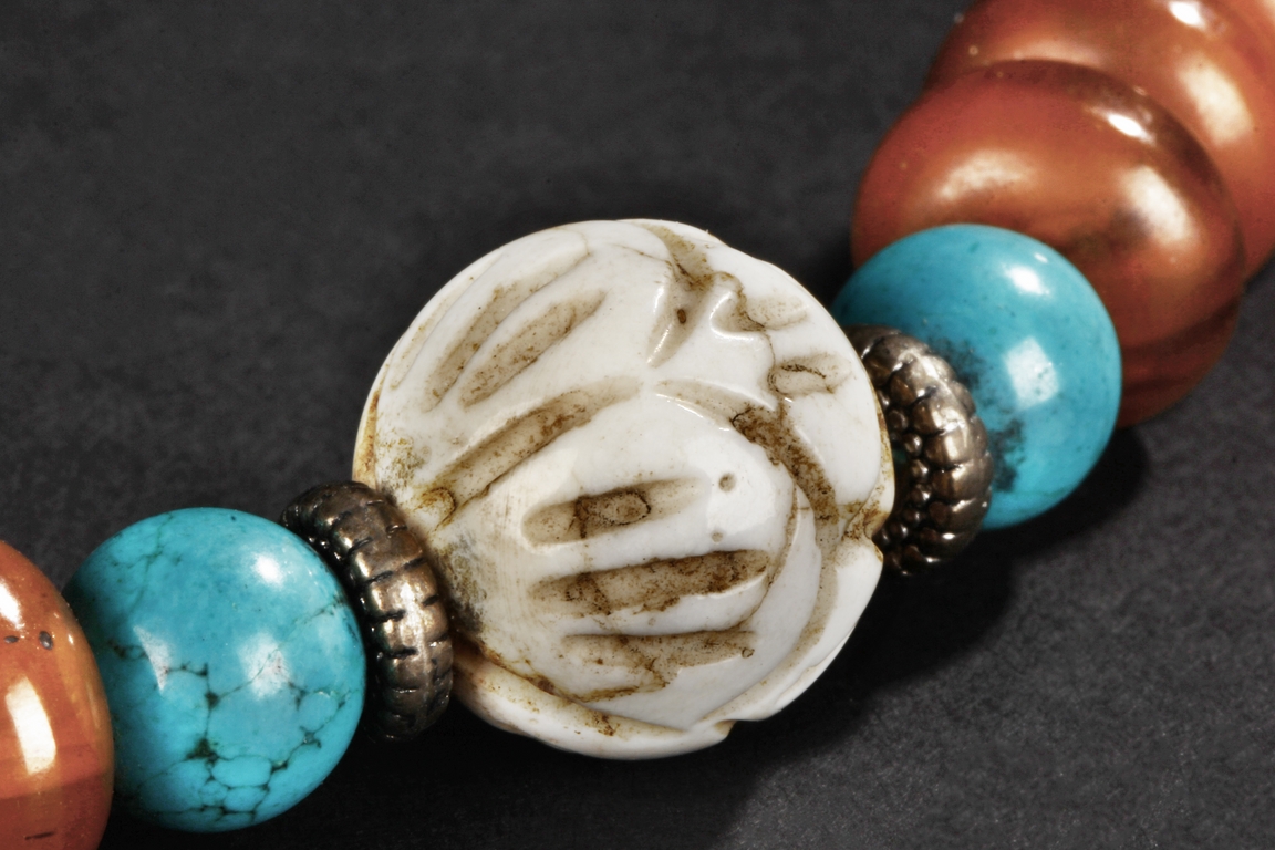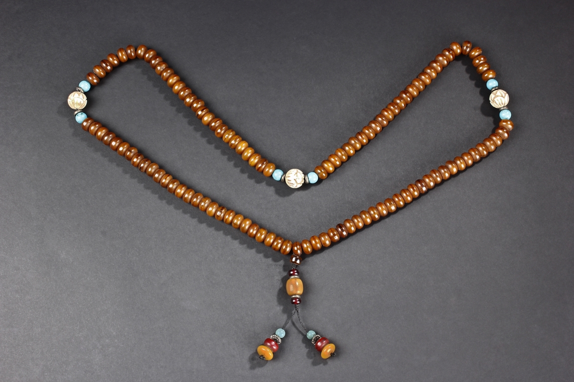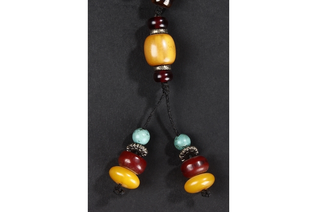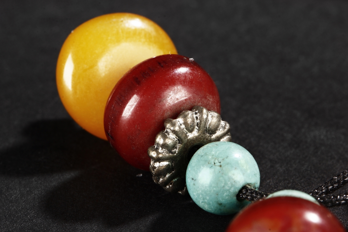 The long necklace consists of three sections of flattened ovoid amber beads, seprated by round turquoise beads, with additional amber and turquoise bead ornaments at center. Qing Dynasty period.