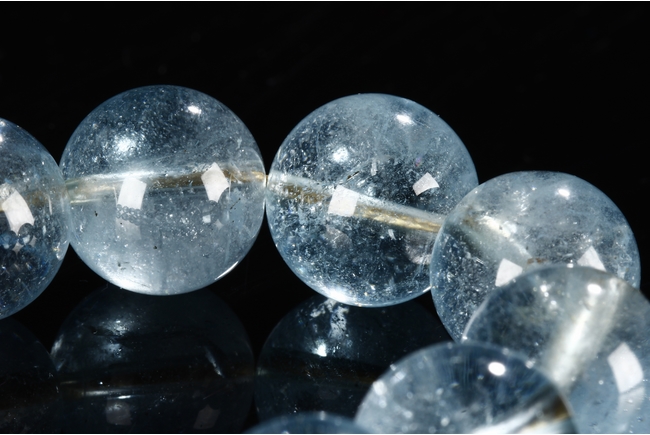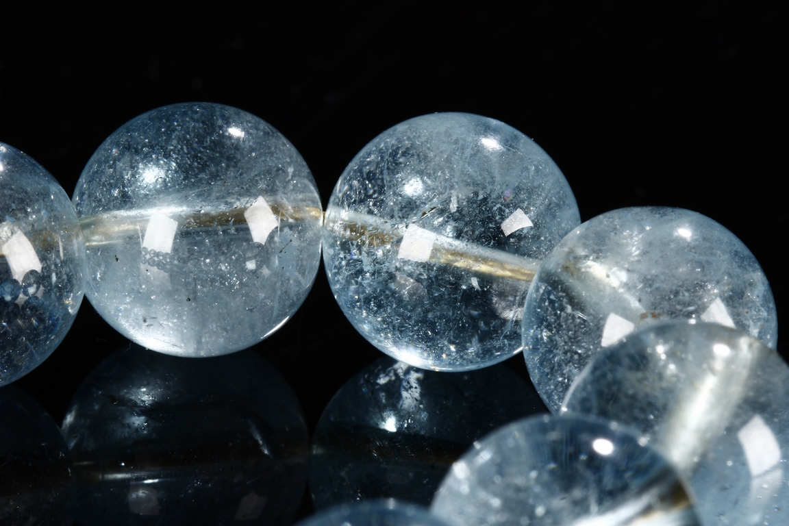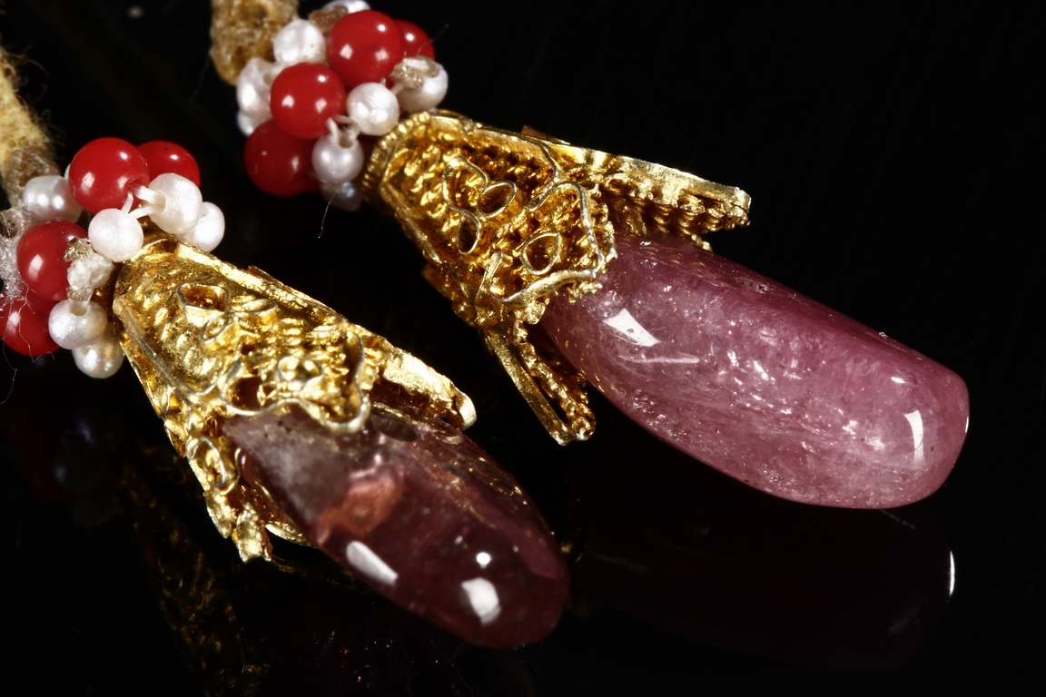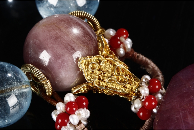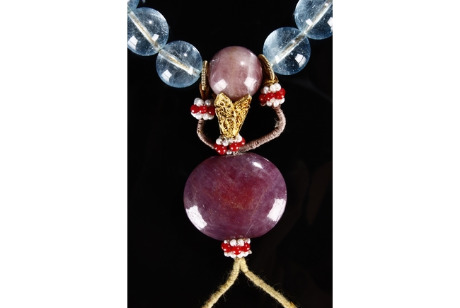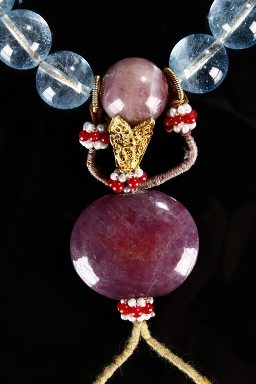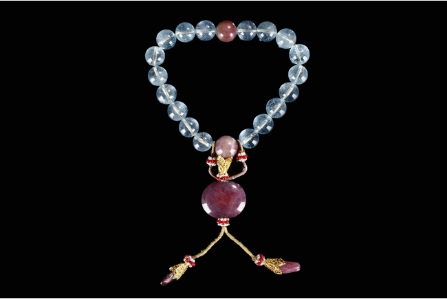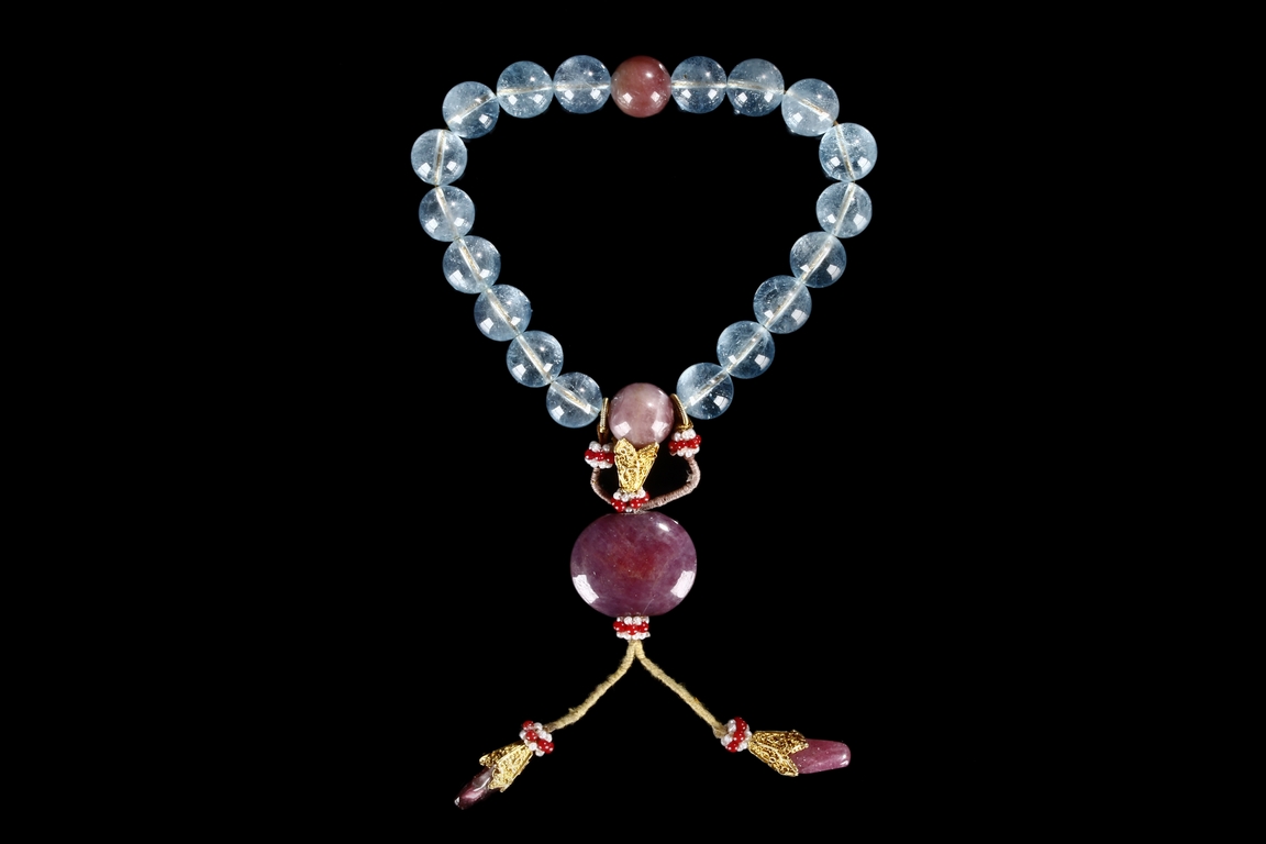 The rosary bracelet is composed of 18 aquamarine beads, with two similar sized purple tourmaline acting as separating beads, along with one large and two teardrop shaped purple tourmaline on the string. Qing Dynasty period.