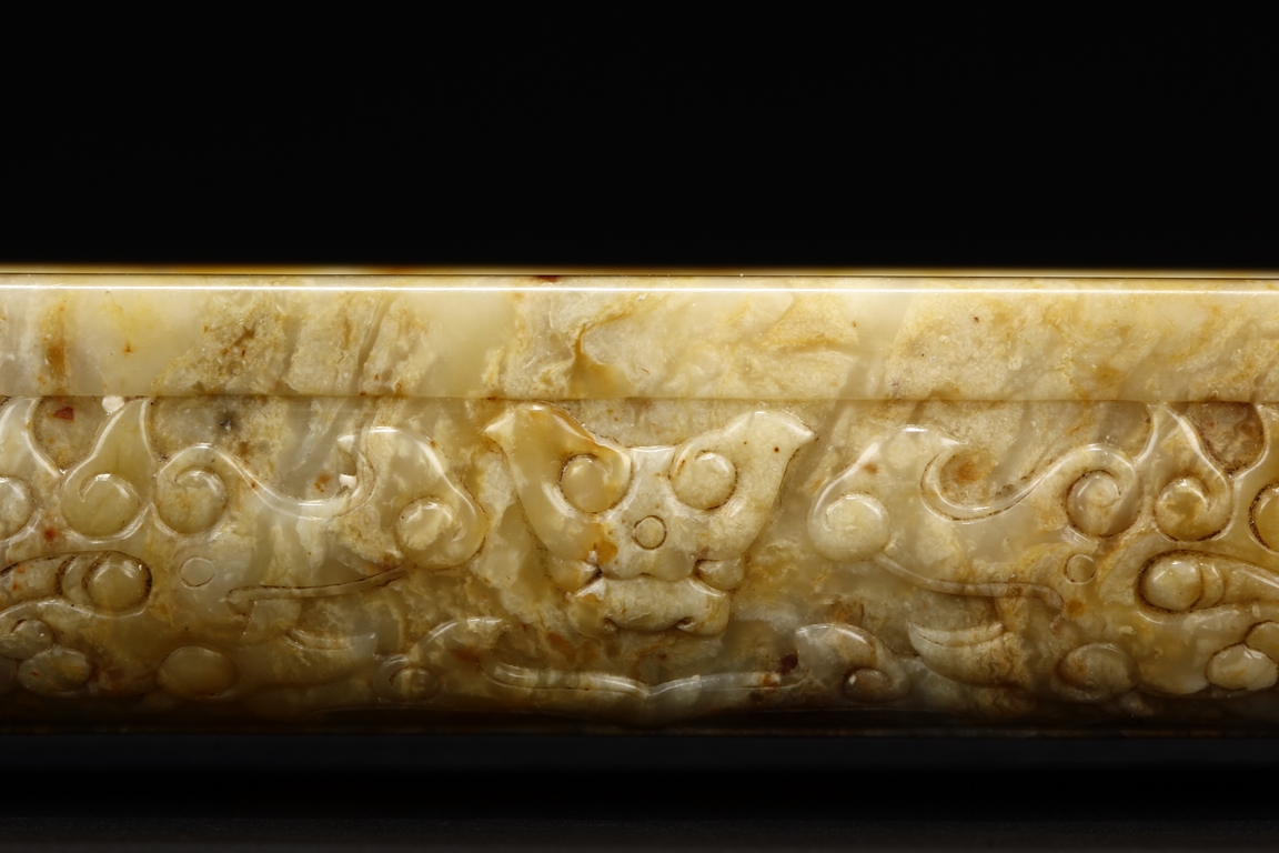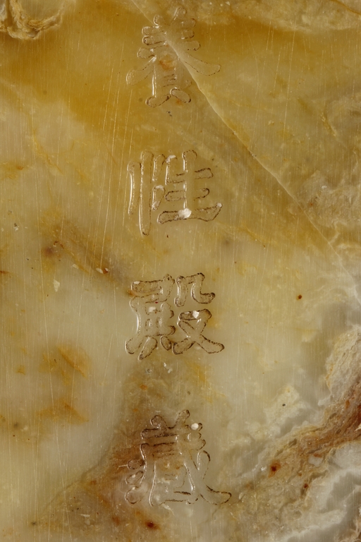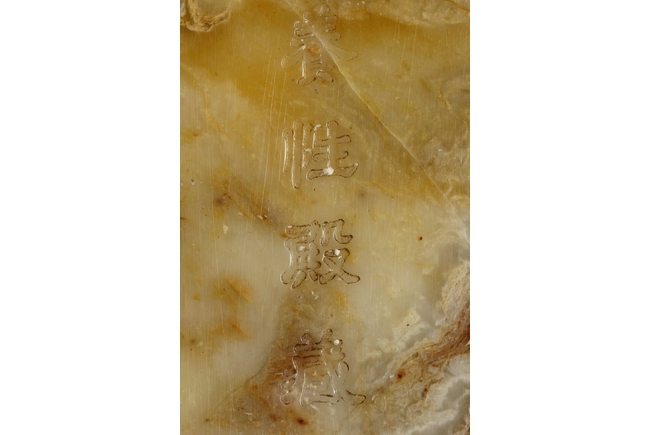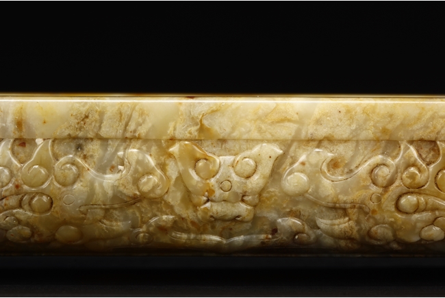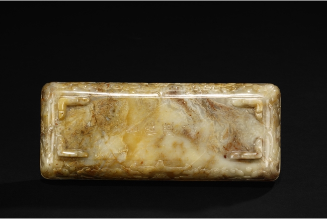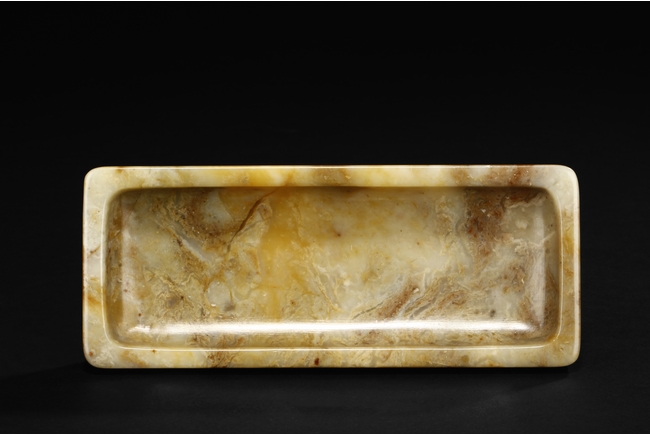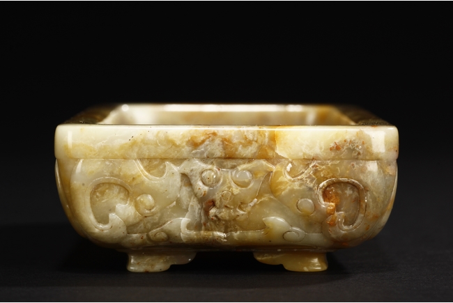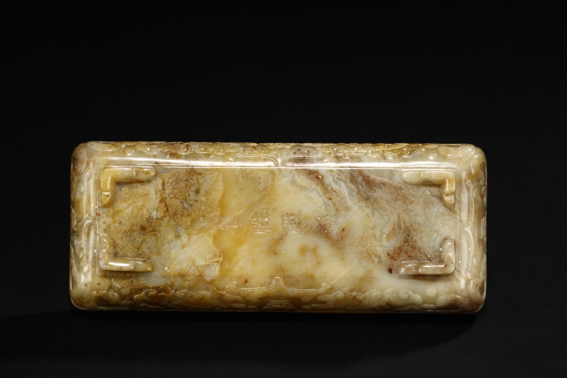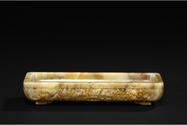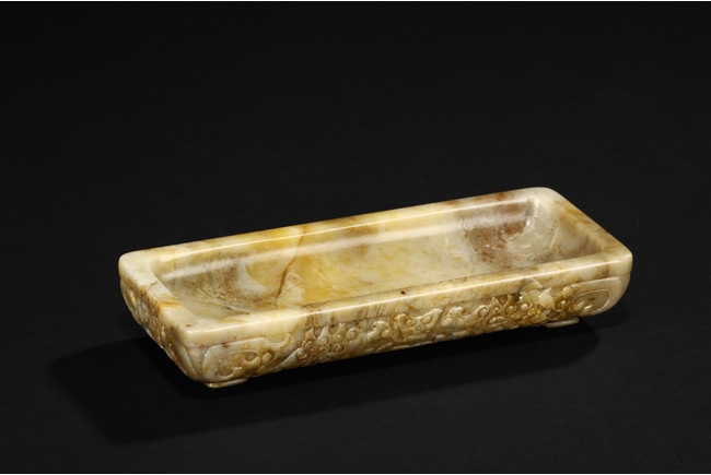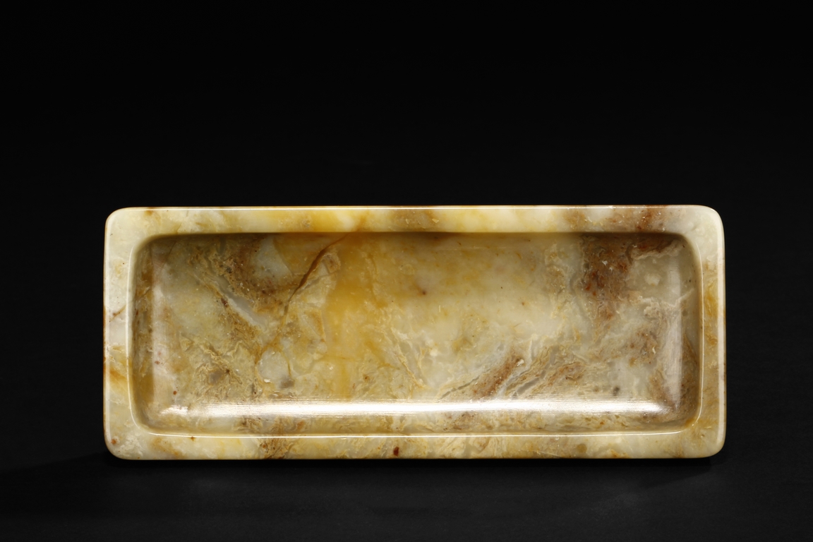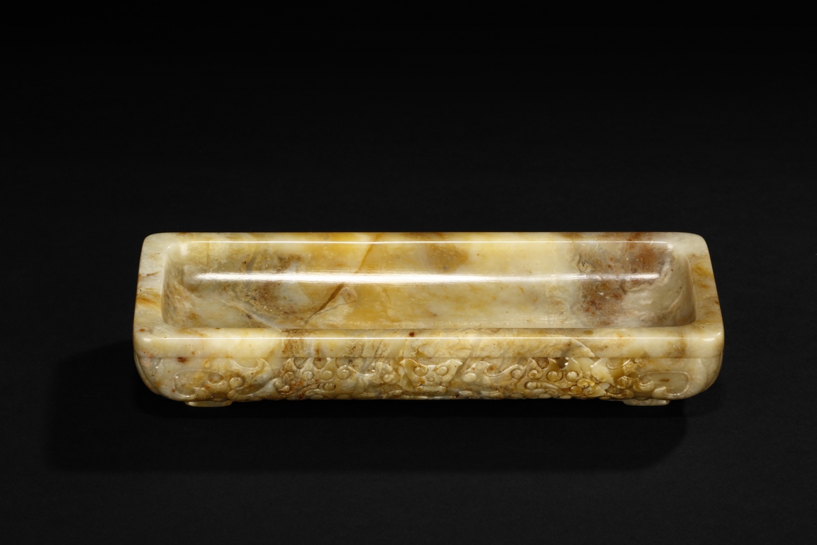 Of flat rectangular form, the washer made from marble, with natural yellowish white colors, the sides carved with mythical beast patterns, and the bottom with four short stub feet. Bottom carved with four character "YANG XING DIAN CANG" mark. Qing Dynasty period.