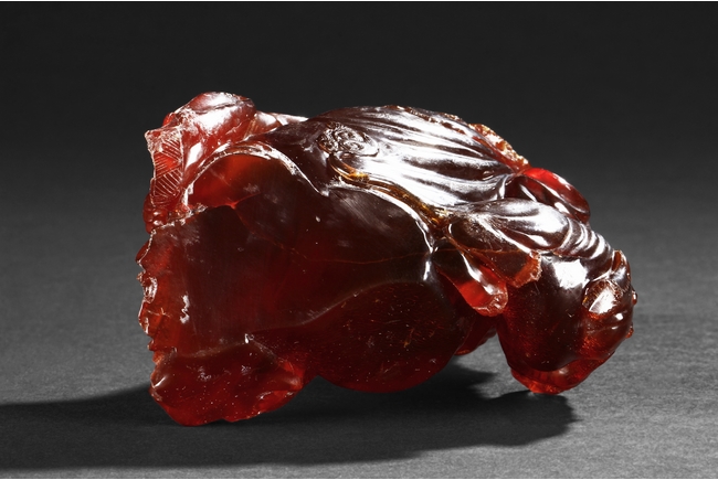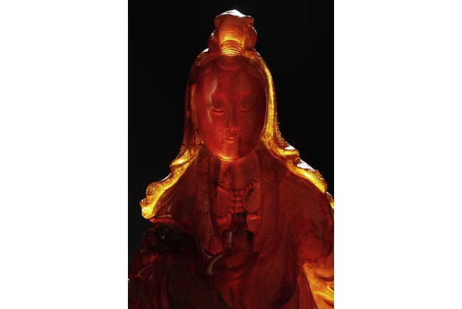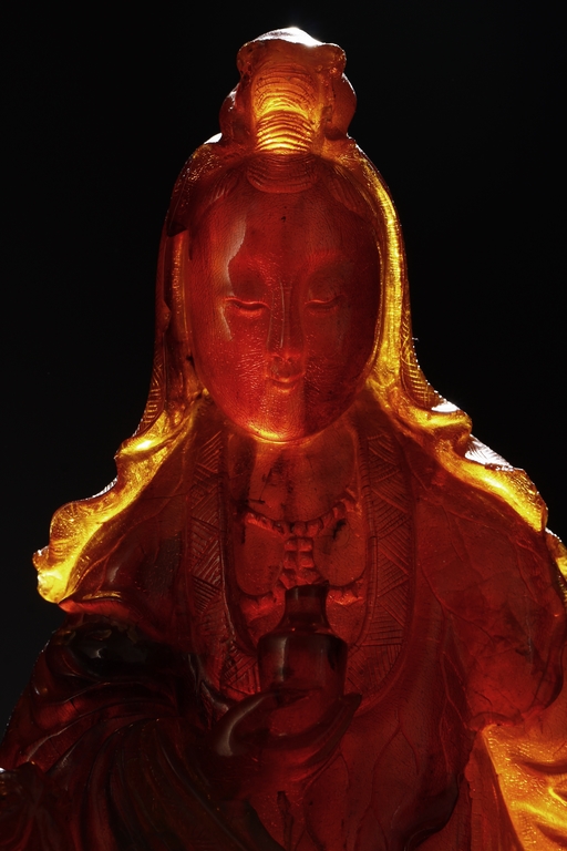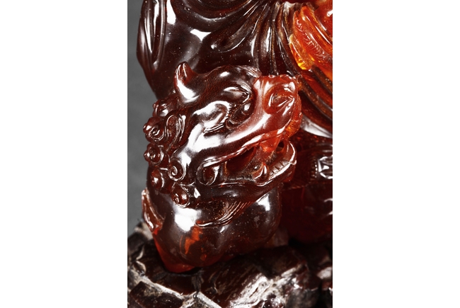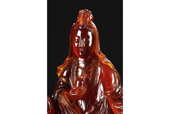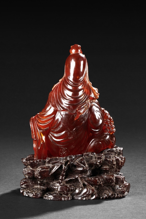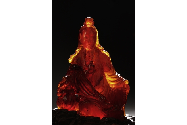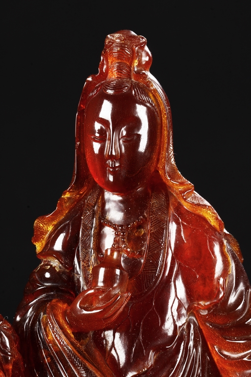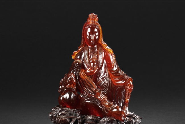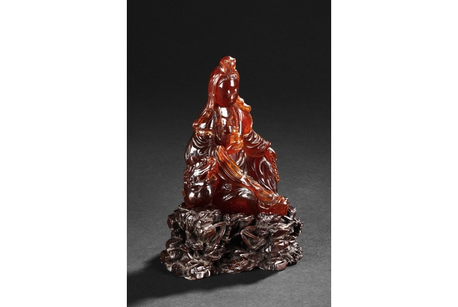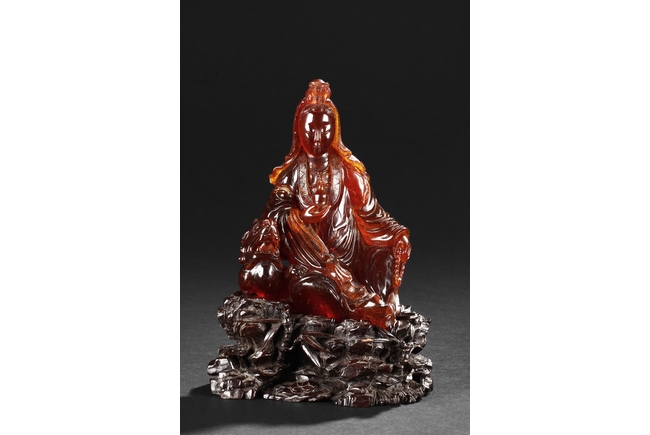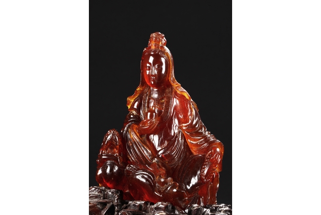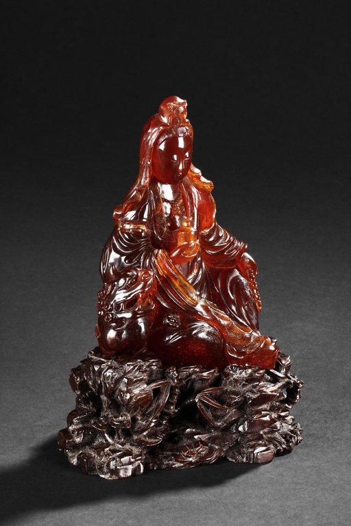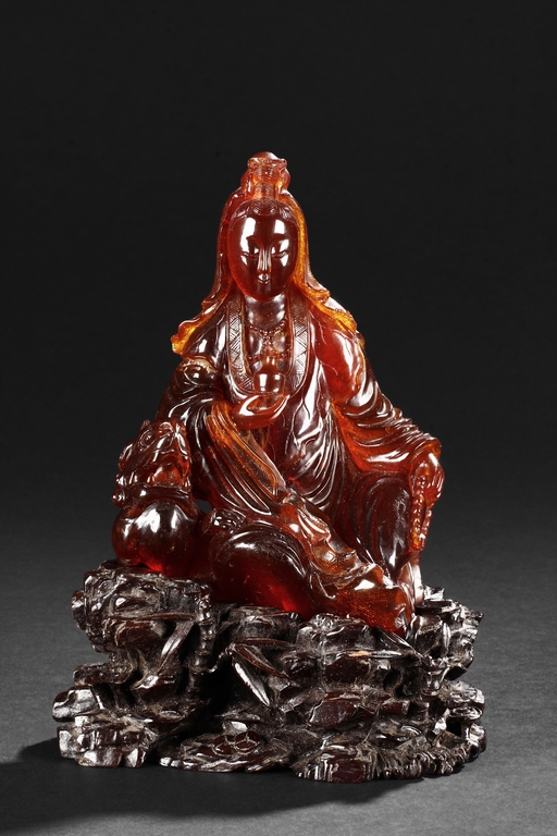 Modeled as a Guanyin seated upon a buddhist lion, her face is finely depicted with serene expression and wearing a loose robe in heavy folds exposing the jewellery on chest, with one hand resting on raised knee holding a beaded necklace and the other a vase. The figure carved from an exquisite piece of amber, with rich and deep reddish-brown color and good translucency, all rests on top of a carved wooden stand depicting stones, bamboos, and lotus flowers. Slight damage on the vase. Early Qing Dynasty period.
