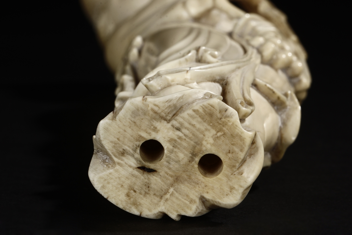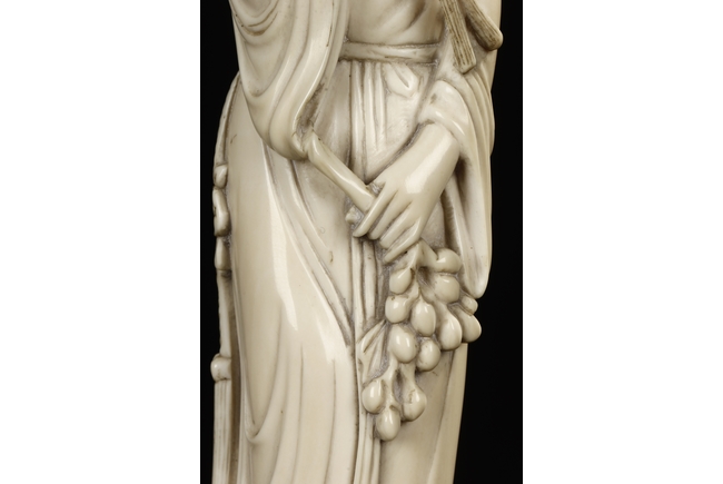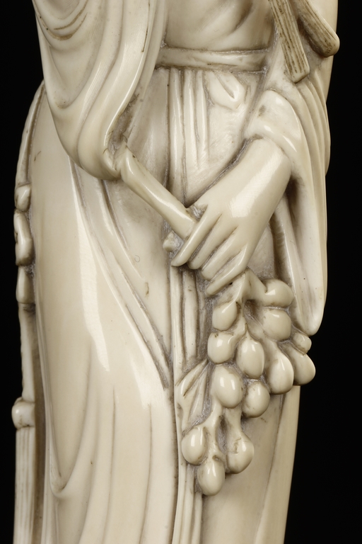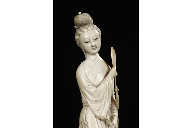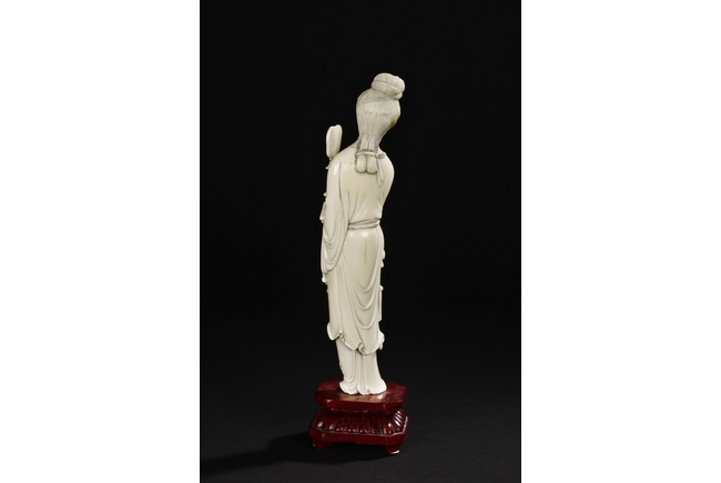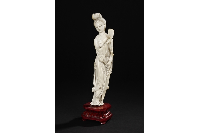 The figure depicts a beauty standing on a wooden stand, holding a plantain fan in one hand, and a flower branch on the other, dressed in decorated robe, with graceful facial expressions. The carving made from ivory, with good patina. Republic period.