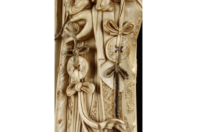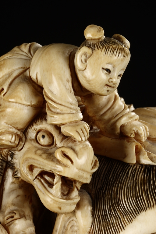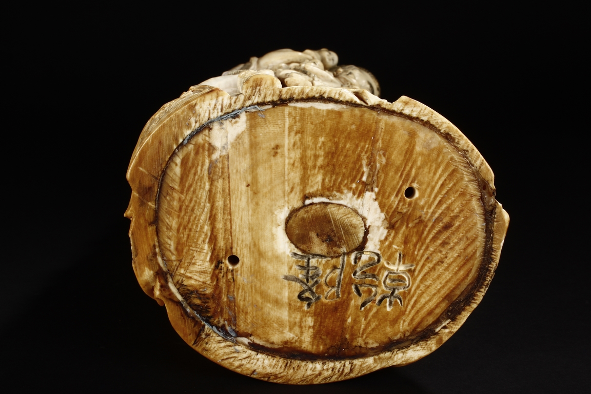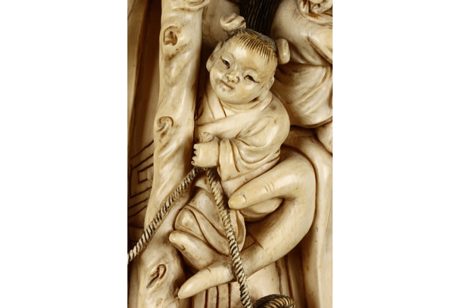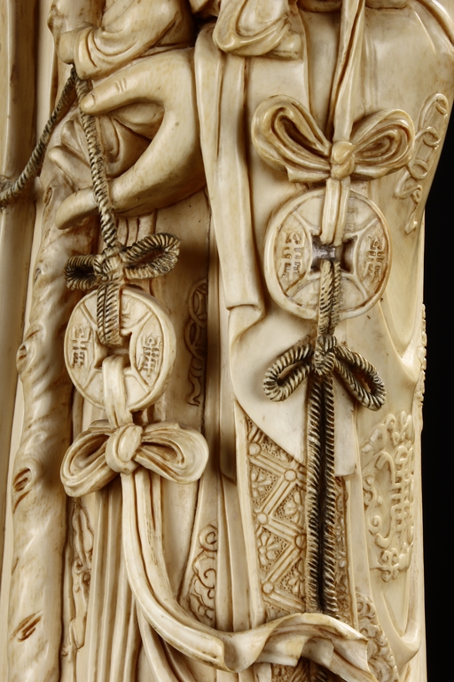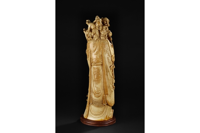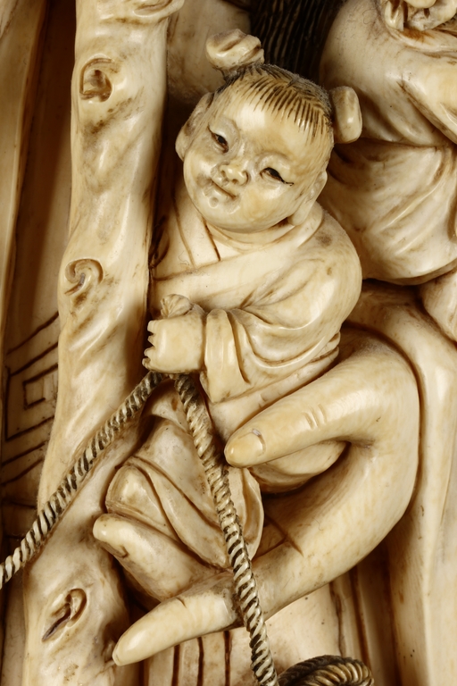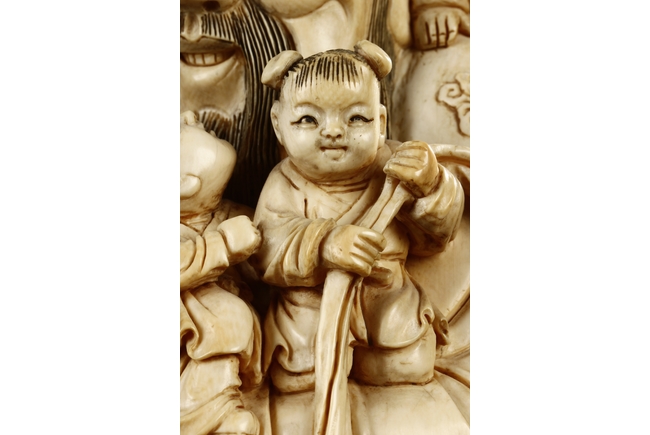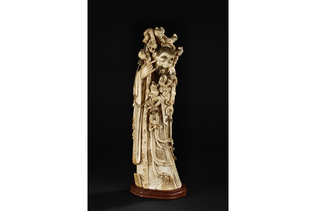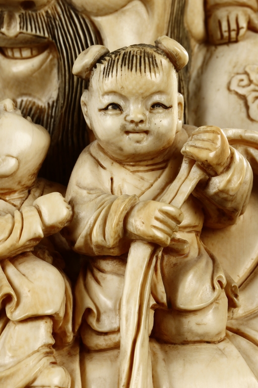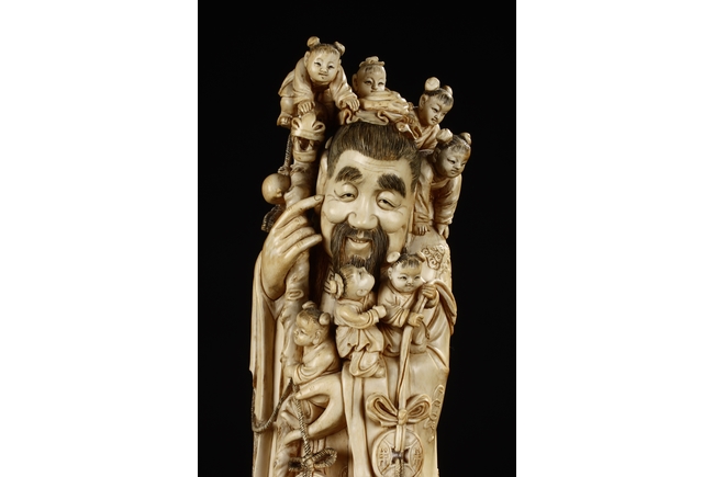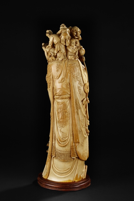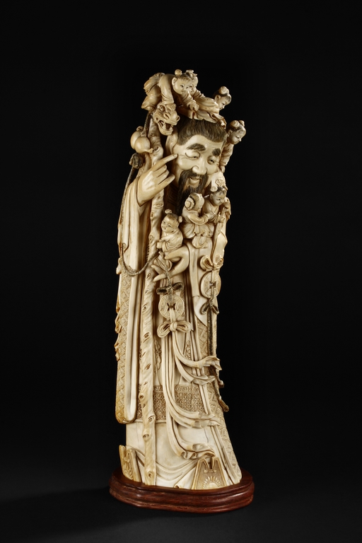 The figure depicts the God of Longevity, Shoulao, standing with his cane, while holding three children in his left hand, and five more children playfully rests on his back and shoulder. The Shoulao is dressed in elaborate robe, with auspicious symbols and patterns. The figure with excellent natural color and patina. Republic period.