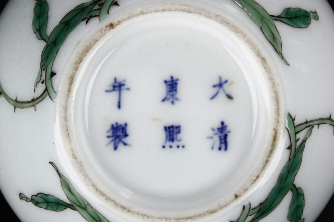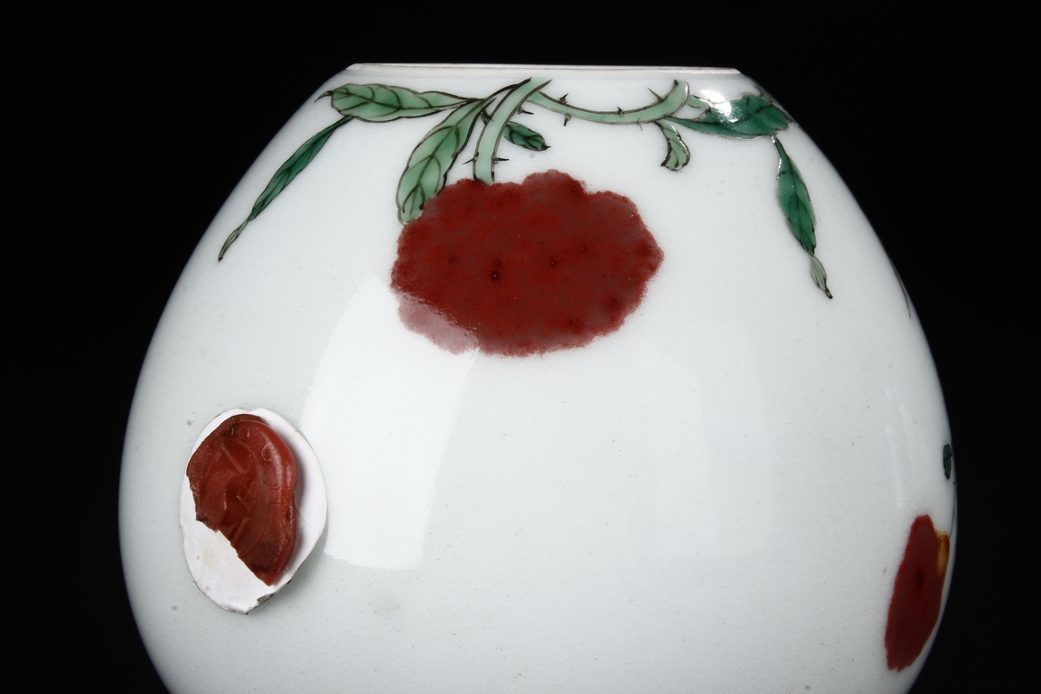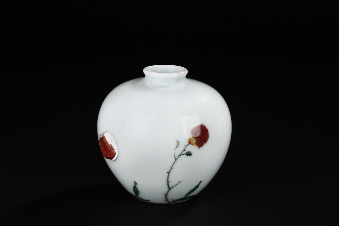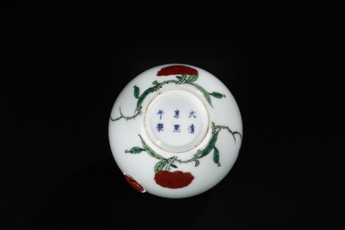 Of globular form, the small waterpot depicts rose flowers scattered on the sides, with an export approval seal mark on the side. Bottom bears six character mark "DAQING KANGXI NIANZHI". Qing Dynasty period.