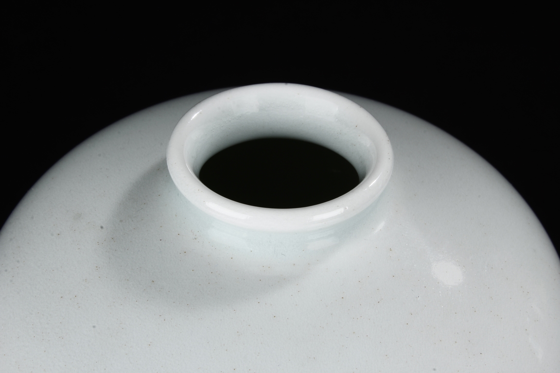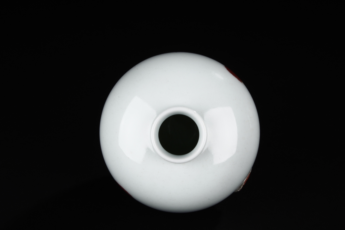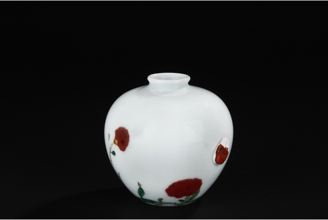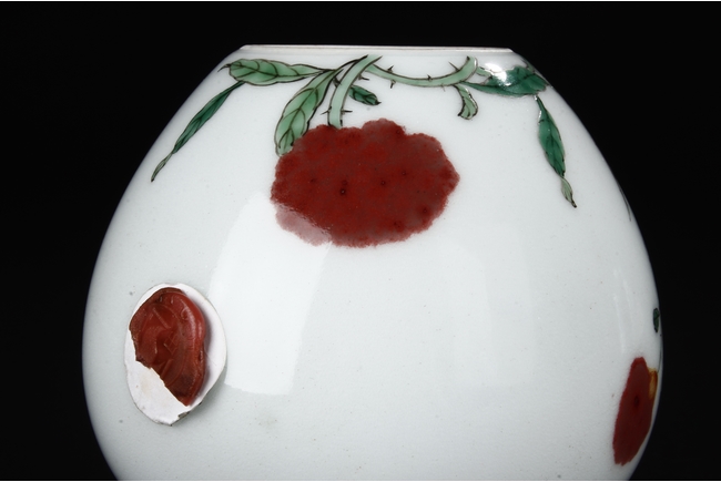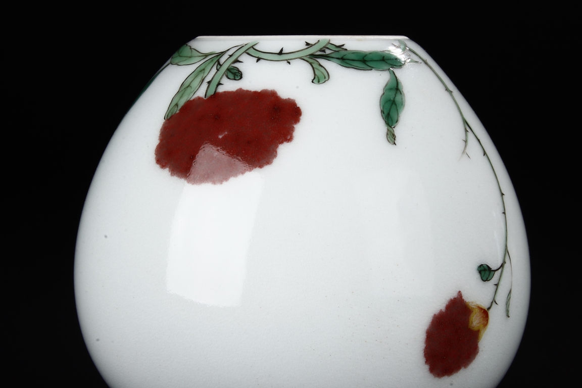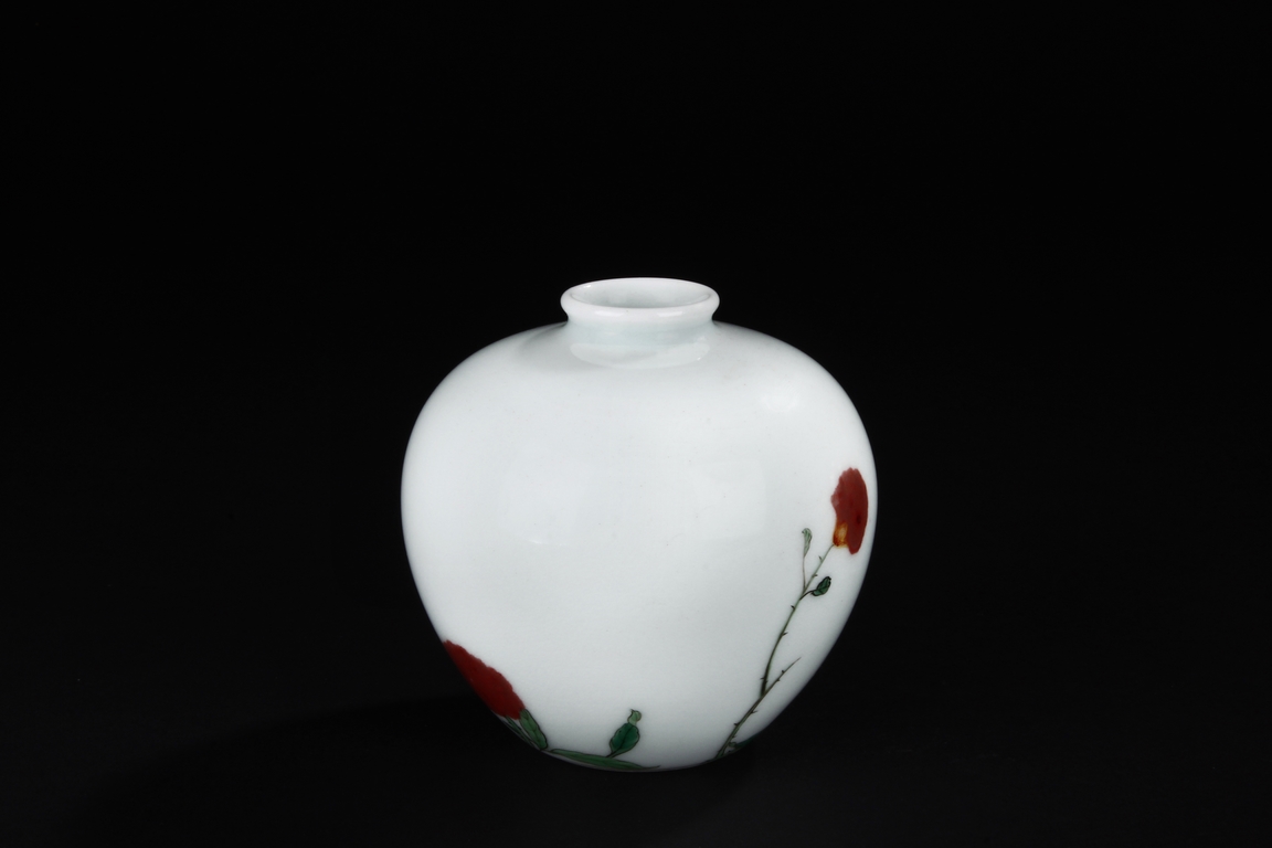 Of globular form, the small waterpot depicts rose flowers scattered on the sides, with an export approval seal mark on the side. Bottom bears six character mark "DAQING KANGXI NIANZHI". Qing Dynasty period.