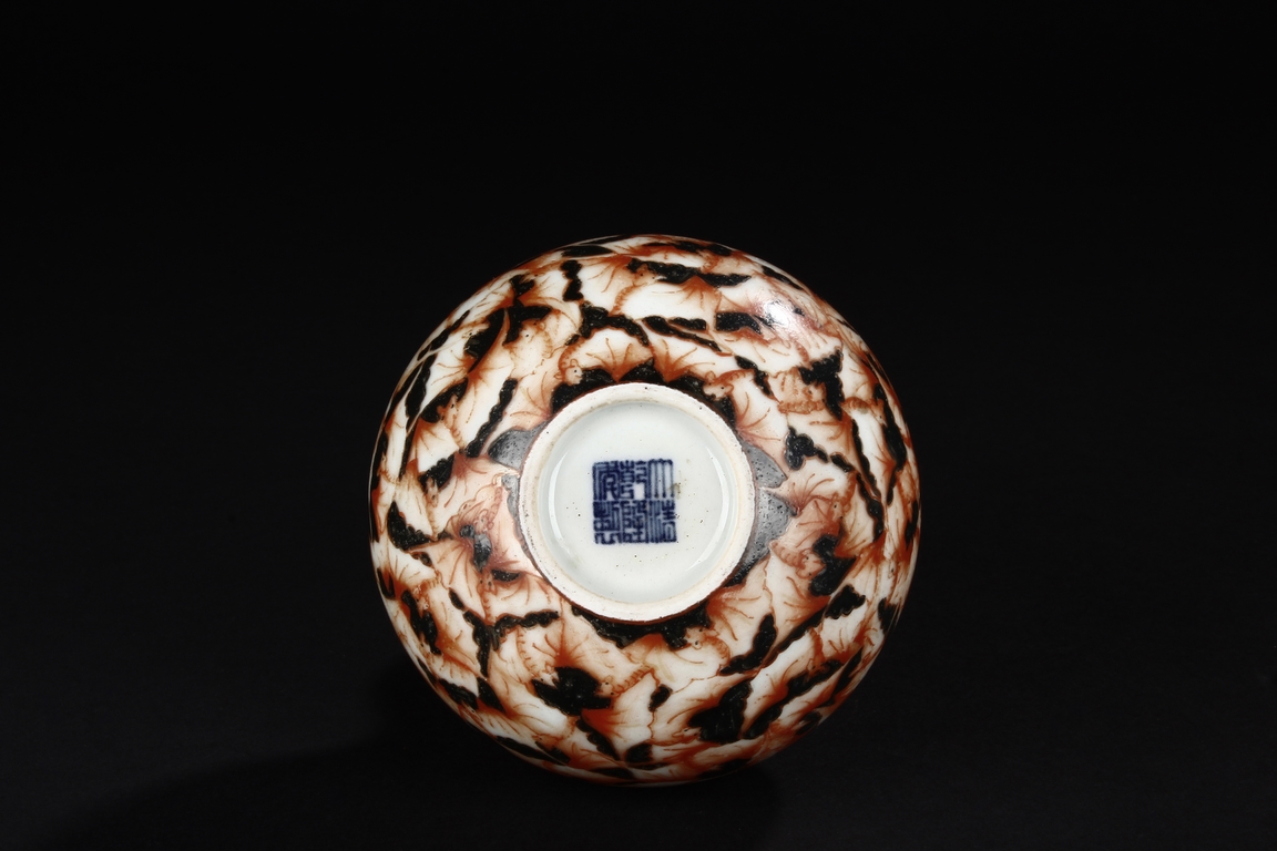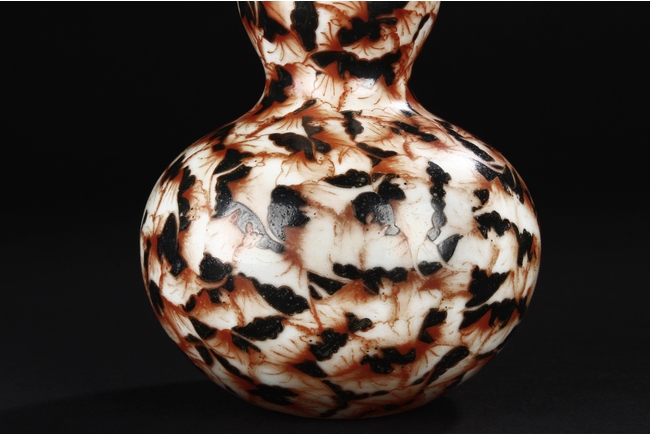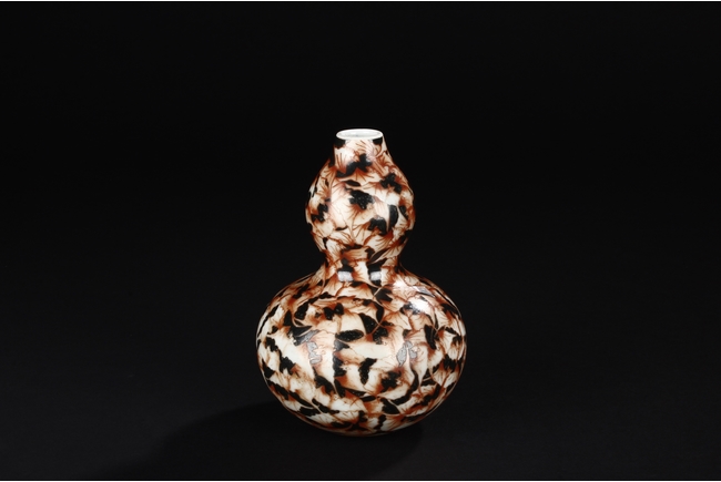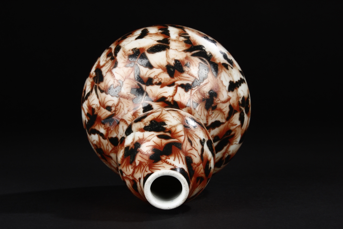 Of double gourd shape, the unique vase is finely decorated with black and red patterns of auspicious flying bats, bottom bears six character mark "DAQING QIANLONG NIANZHI".