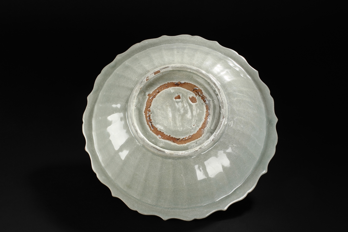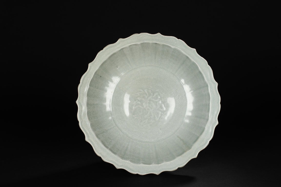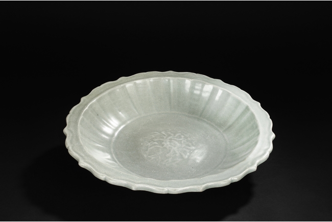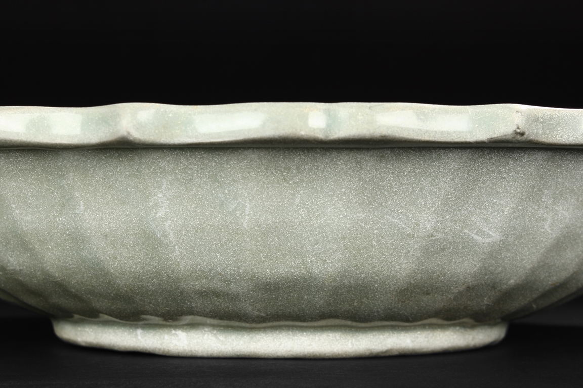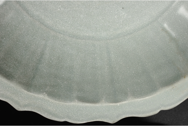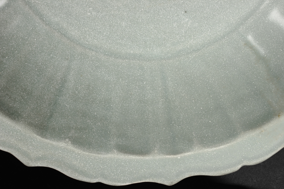 Of foliate rim design, extending to the interior with concave edges, the interior lightly impressed with flower and vine patterns, the color of celadon glaze. Bottom with a ring of burn marks. Qing dynasty period.